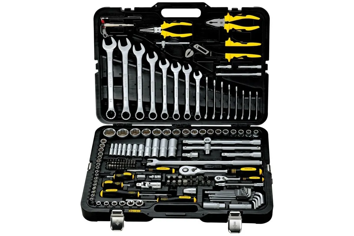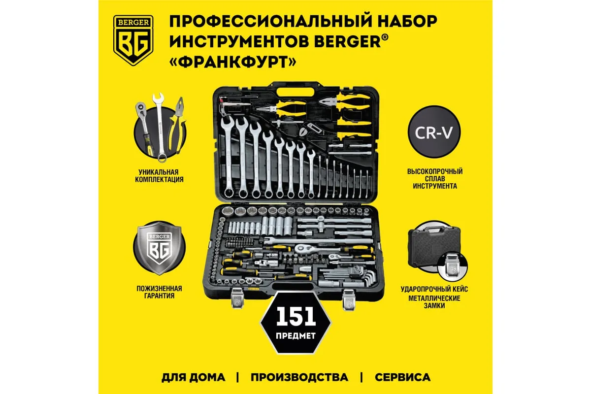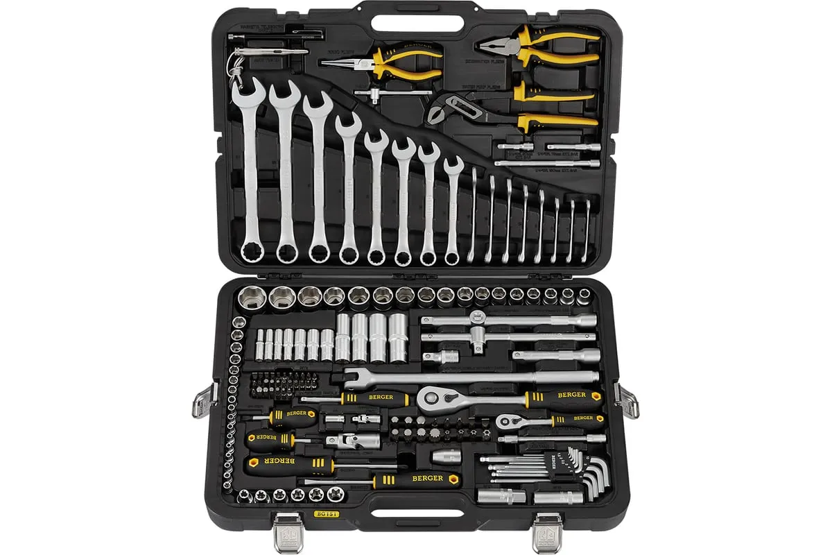 Универсальный набор инструментов 151 предмет Berger BG BG151-1214 используется для выполнения ремонтных и монтажных работ. Инструменты уложены в кейс, где каждый занимает определенное место. Все изделия изготовлены из высокопрочной хромованадиевой стали. Инструменты проходят двойной контроль коррозионной устойчивости. Для удобной работы некоторые предметы оснащены эргономичными рукоятками, которые не скользят и удобно фиксируются в руке, что создает комфорт в работе.