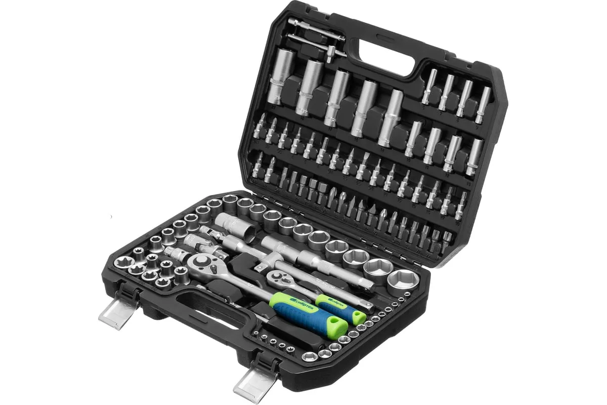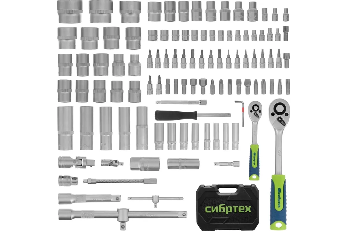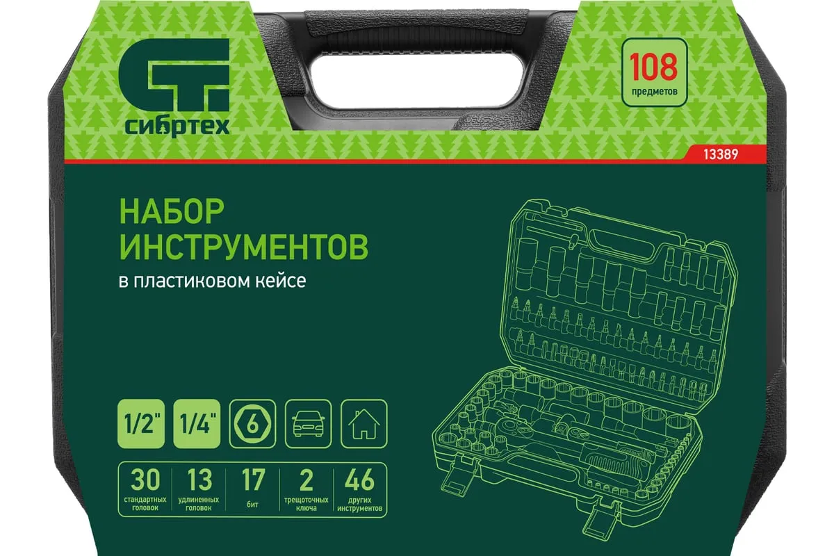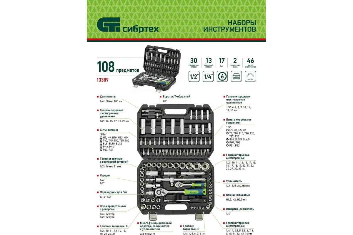 Набор инструментов Сибртех 13389 упакован в пластиковый кейс и состоит из 108 предметов с присоединительным размером 1/2" и 1/4", предназначенных для монтажа и демонтажа резьбового крепежа с разными типами шлицев. В комплект поставки входят карданы, удлинители и переходники, облегчающие работу в труднодоступных местах. Набор используется для ремонта автомобилей, а также полезен в быту