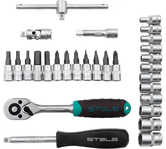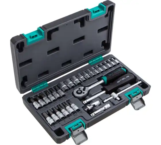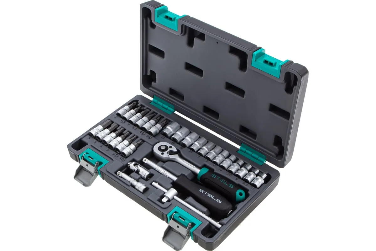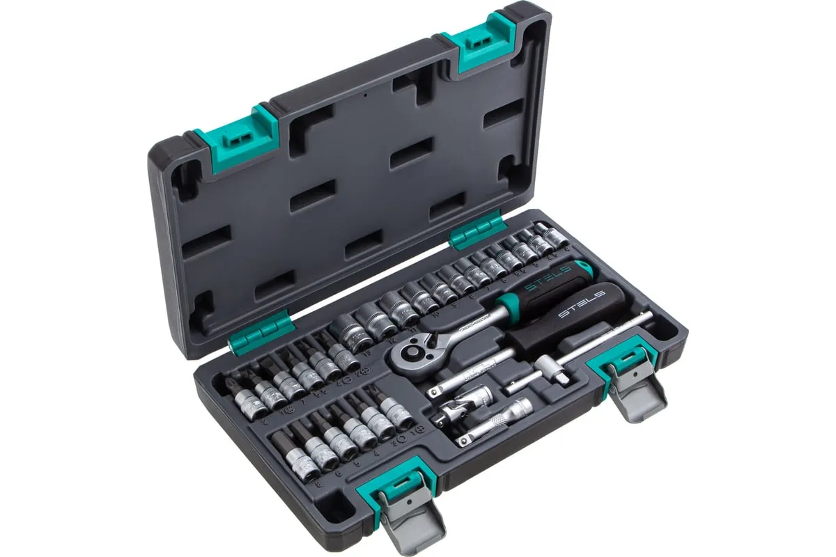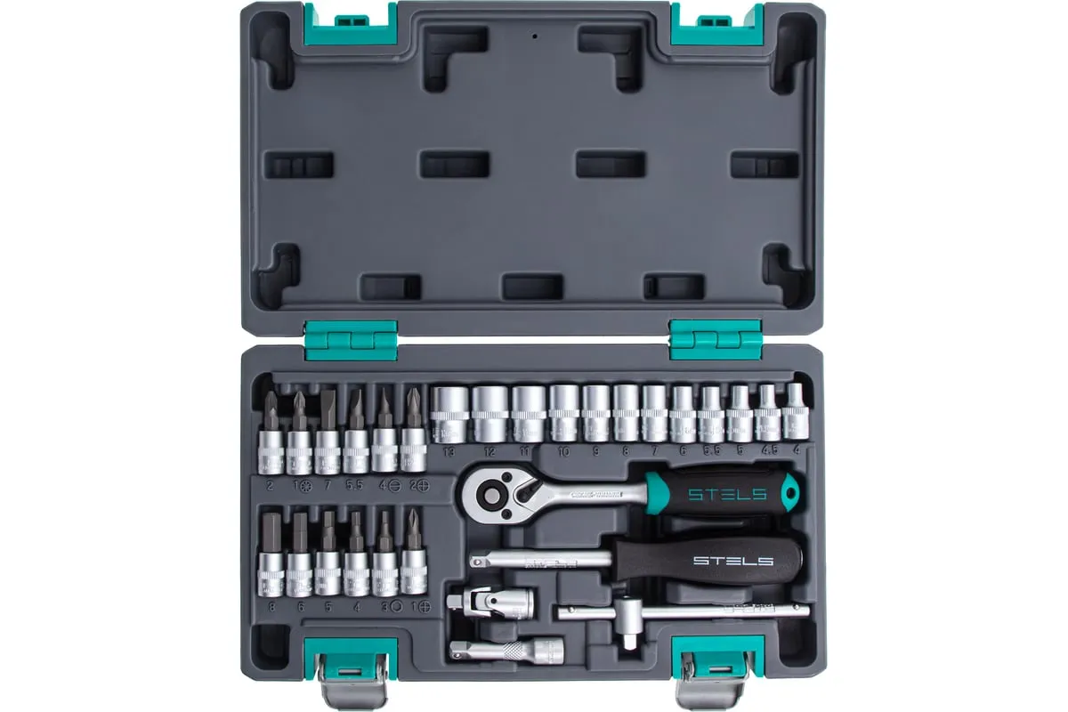 Набор инструментов STELS 29 предметов 14100 предназначен для монтажа, демонтажа резьбовых соединений, обслуживания деталей автомобиля. Комплект обладает инструментами, которые выполнены из хромованадиевой стали и обладают удобной двухкомпонентной рукояткой. Биты изготовлены из стали марки S2, благодаря которой улучшены свойства инструмента. В наборе 29 предметов. Кейс из ударопрочного пластика для хранения.