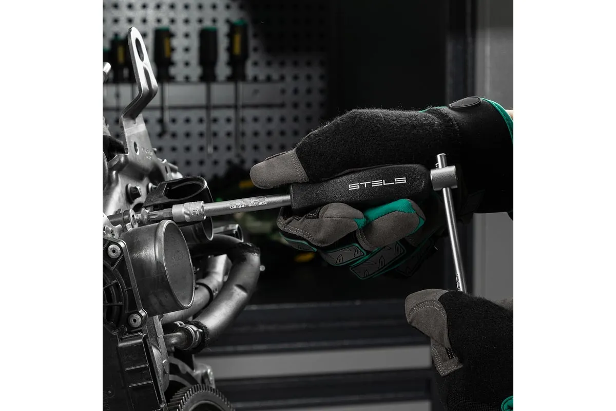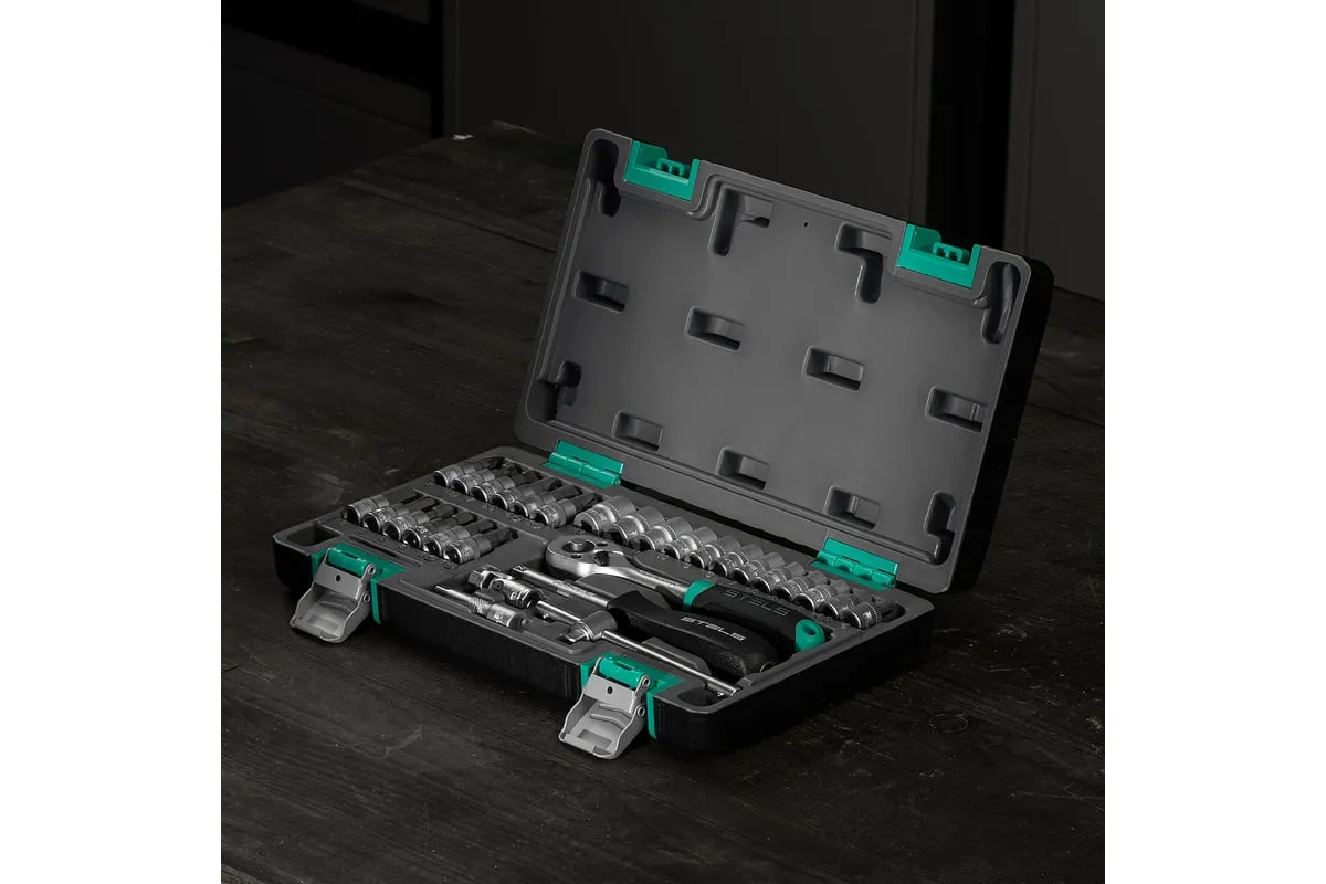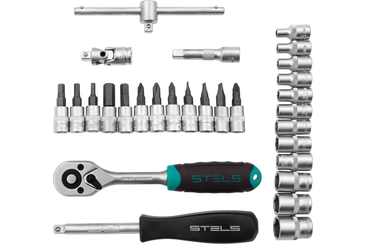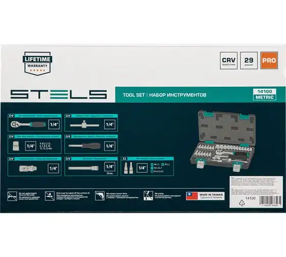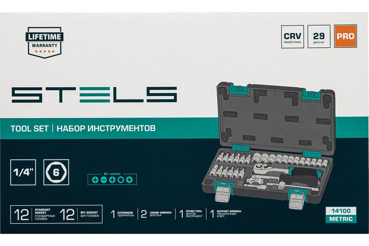 Набор инструментов STELS 29 предметов 14100 предназначен для монтажа, демонтажа резьбовых соединений, обслуживания деталей автомобиля. Комплект обладает инструментами, которые выполнены из хромованадиевой стали и обладают удобной двухкомпонентной рукояткой. Биты изготовлены из стали марки S2, благодаря которой улучшены свойства инструмента. В наборе 29 предметов. Кейс из ударопрочного пластика для хранения.