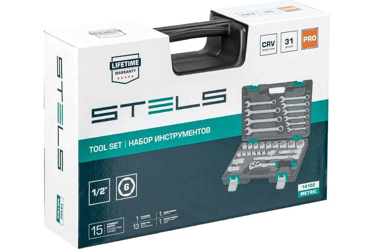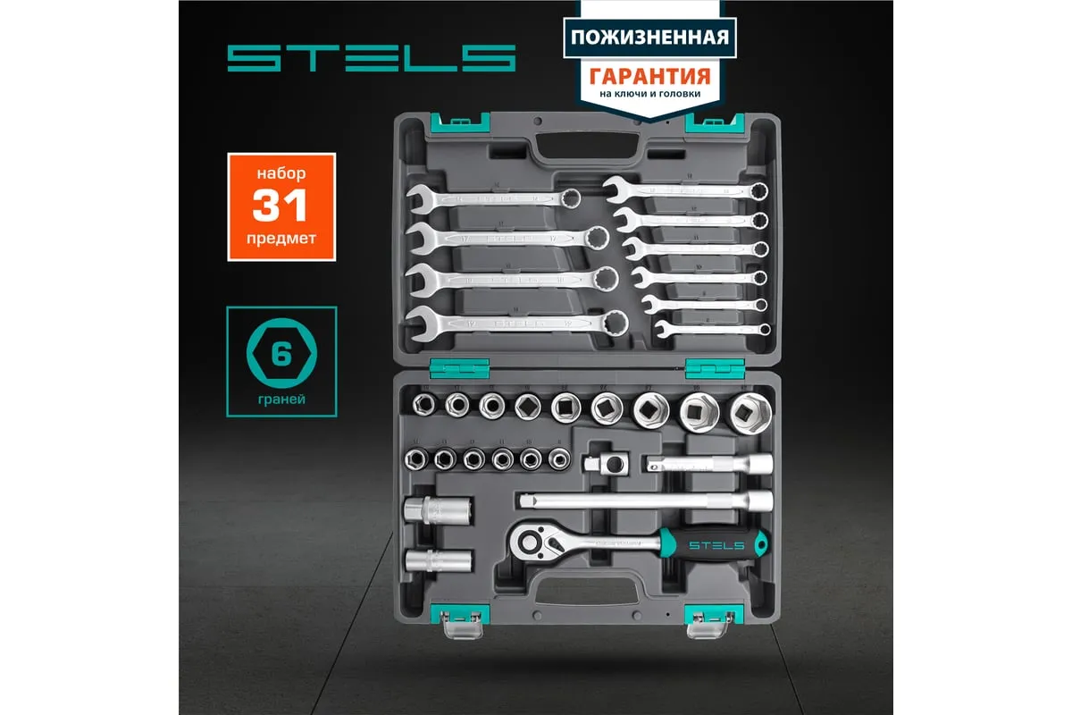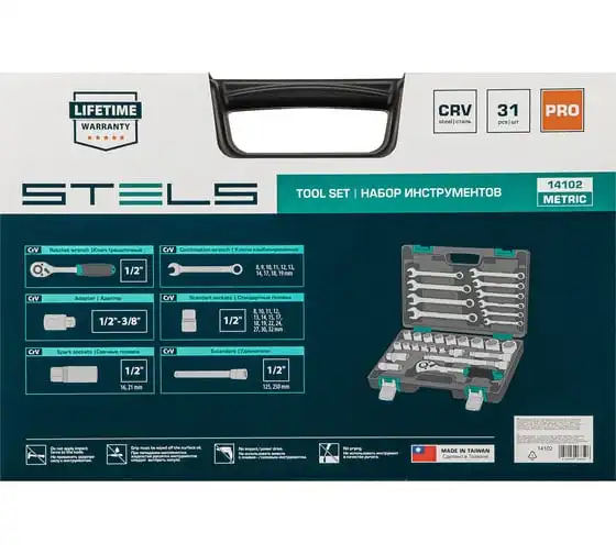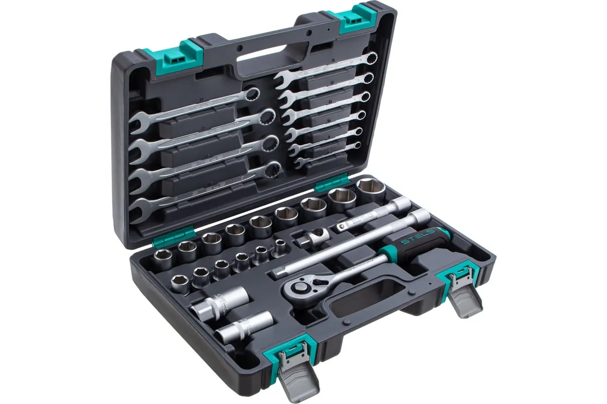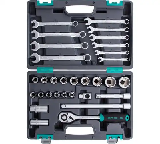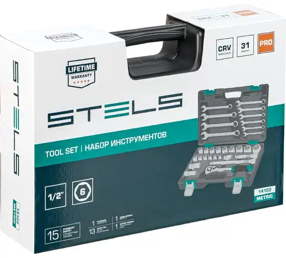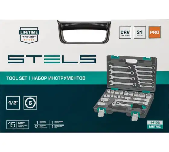 Набор инструментов STELS 31 предмет 14102 - это комплект необходимых для обслуживания и ремонта автомобиля изделий, производство которых происходило под контролем и в соответствии с международными стандартами. В качестве материала для рабочих частей головок и ключей использована хромованадиевая сталь. Кейс выполнен из противоударного пластика, обладает ручкой и защелками. В наборе 31 инструмент.