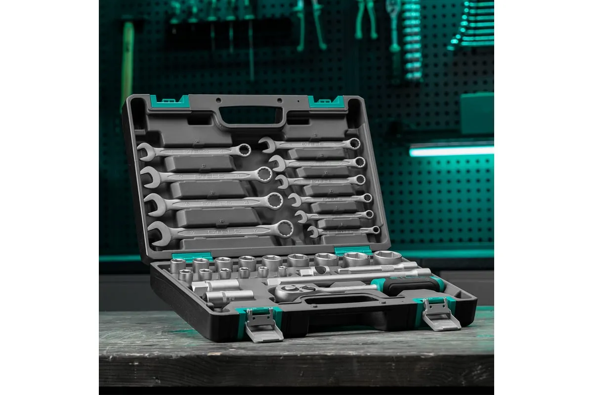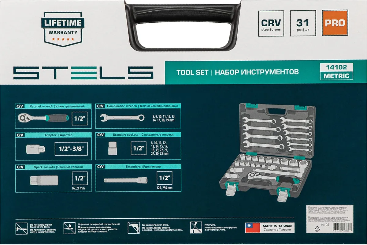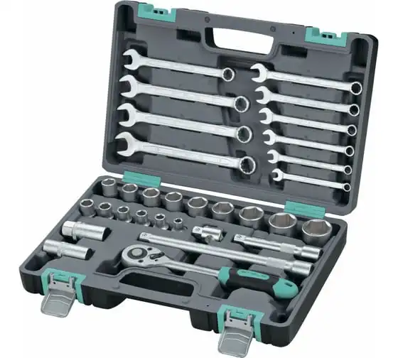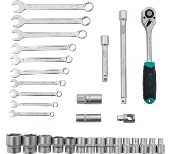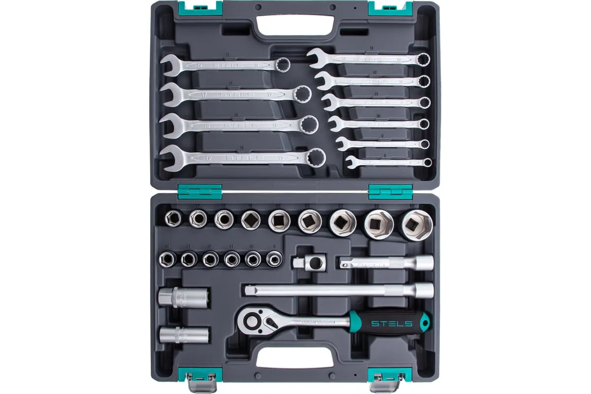 Набор инструментов STELS 31 предмет 14102 - это комплект необходимых для обслуживания и ремонта автомобиля изделий, производство которых происходило под контролем и в соответствии с международными стандартами. В качестве материала для рабочих частей головок и ключей использована хромованадиевая сталь. Кейс выполнен из противоударного пластика, обладает ручкой и защелками. В наборе 31 инструмент.