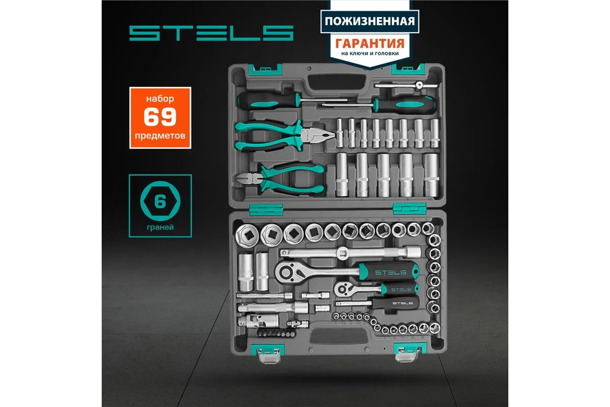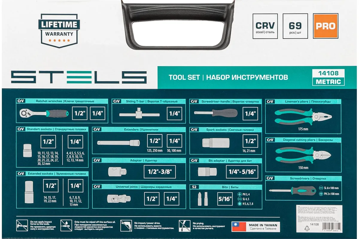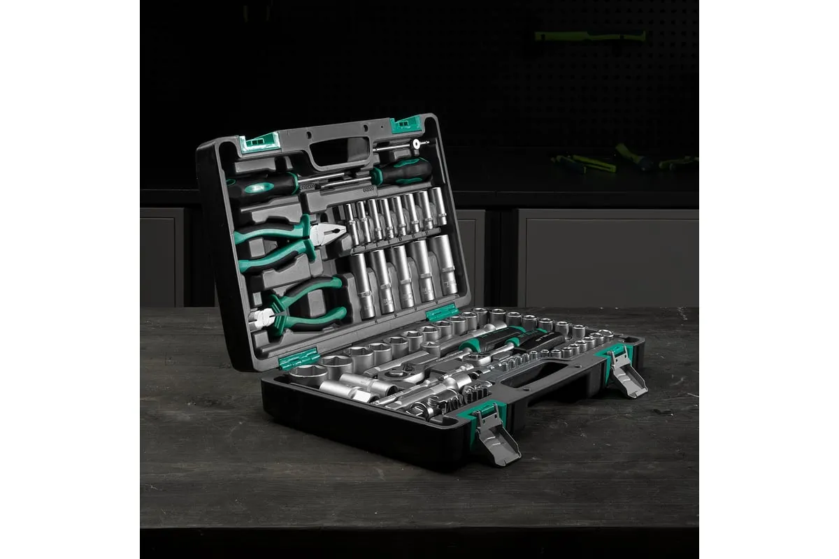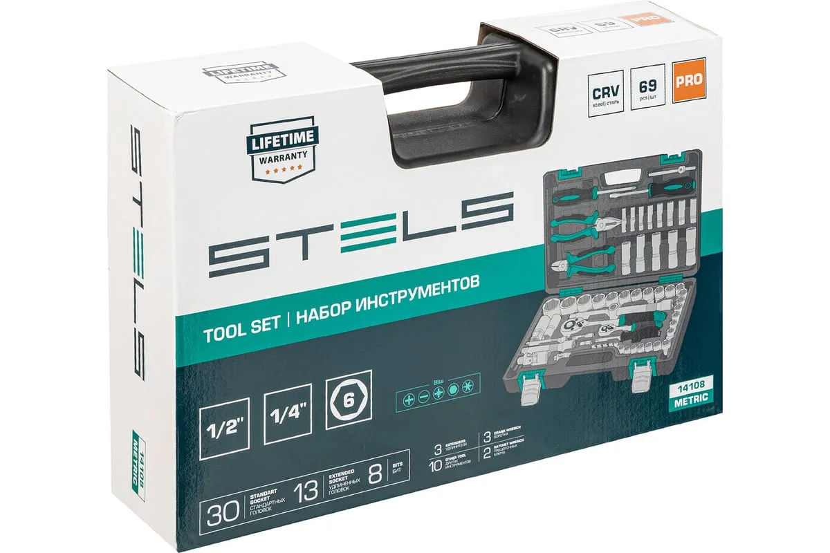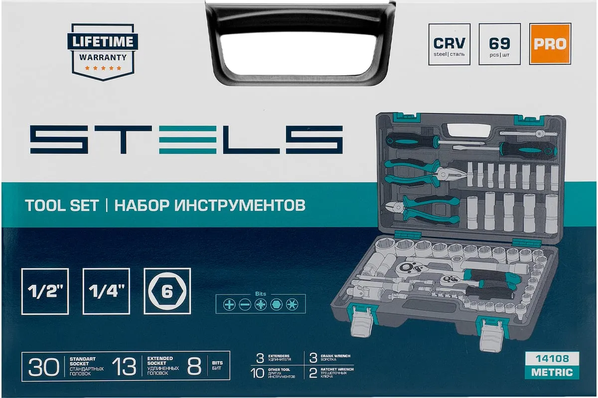 Набор инструментов Stels 14108 в пластиковом кейсе состоит из 69 предметов с присоединительными размерами 1/2" и 1/4", из стали CrV и S2, и предназначен для выполнения слесарно-монтажных работ. Включает инструменты и насадки для работы с резьбовыми крепежами, а также бокорезы и пассатижи, расширяющие возможности использования набора. Универсальный комплект будет полезен при проведении авторемонта в гараже или в поездке, а также пригодится дома или на даче.