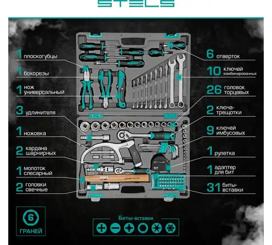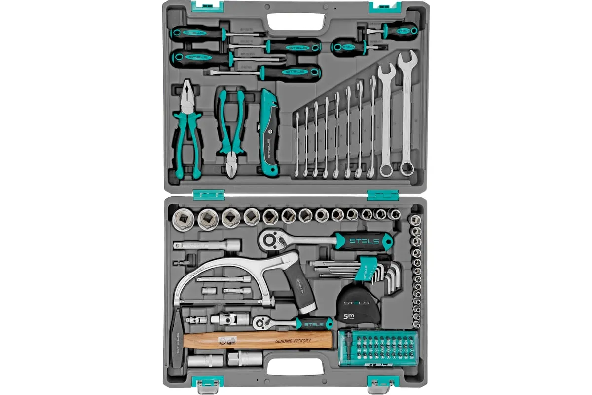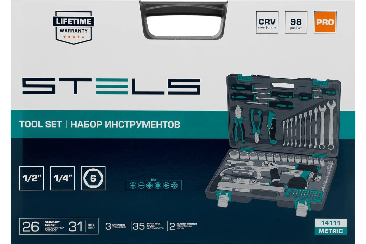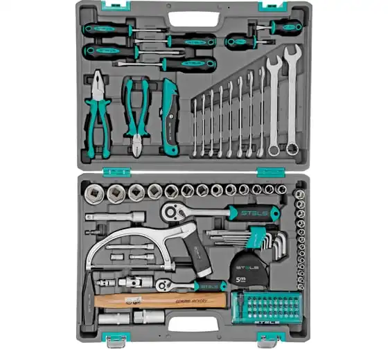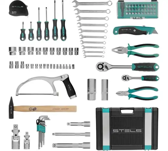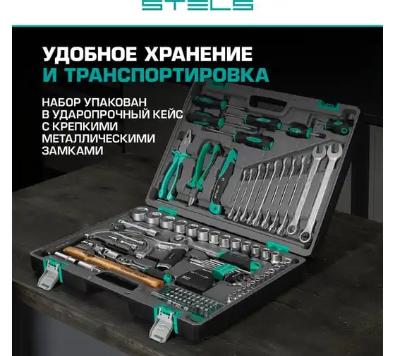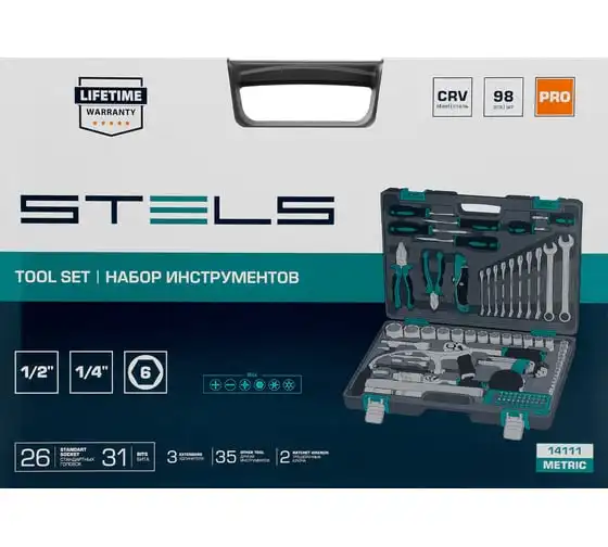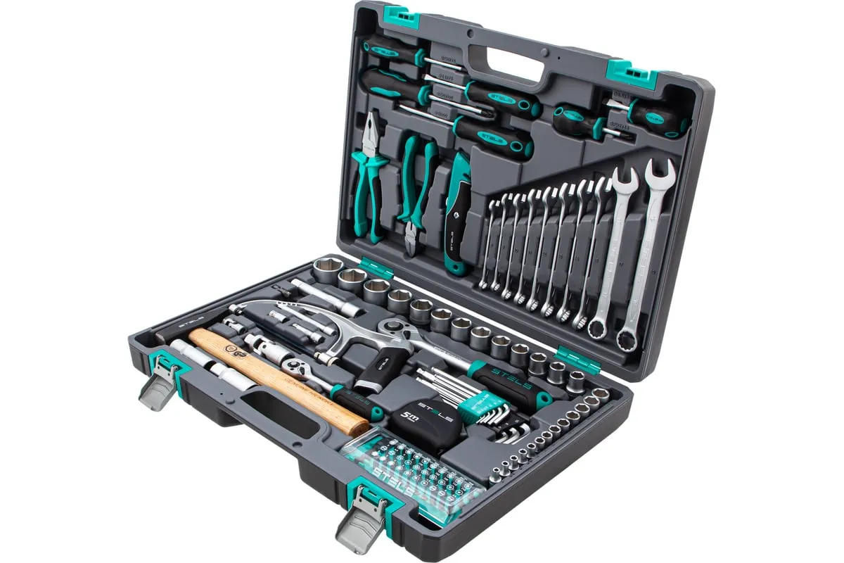Набор инструментов STELS 98 предметов 14111 пригодится для обслуживания автомобиля, а также ремонта дома и дачи. Все инструменты комплекта изготовлены из хромованадиевой стали, легкой, но высокопрочной в использовании. Биты и отвертки выполнены из стали марки S2. Рукоятки из двухкомпонентного материала не скользят в руке при длительной работе. Кейс позволяет компактно хранить инструменты, обладает защелками и ручкой.