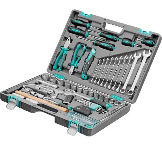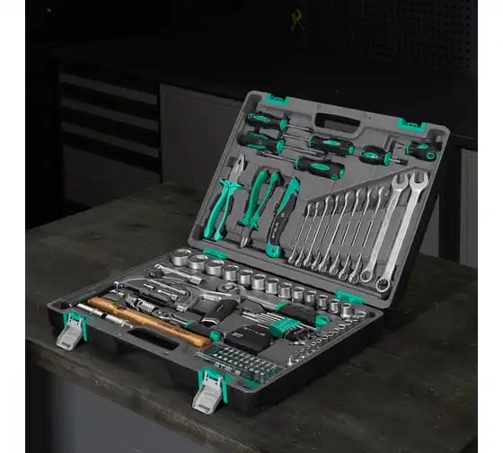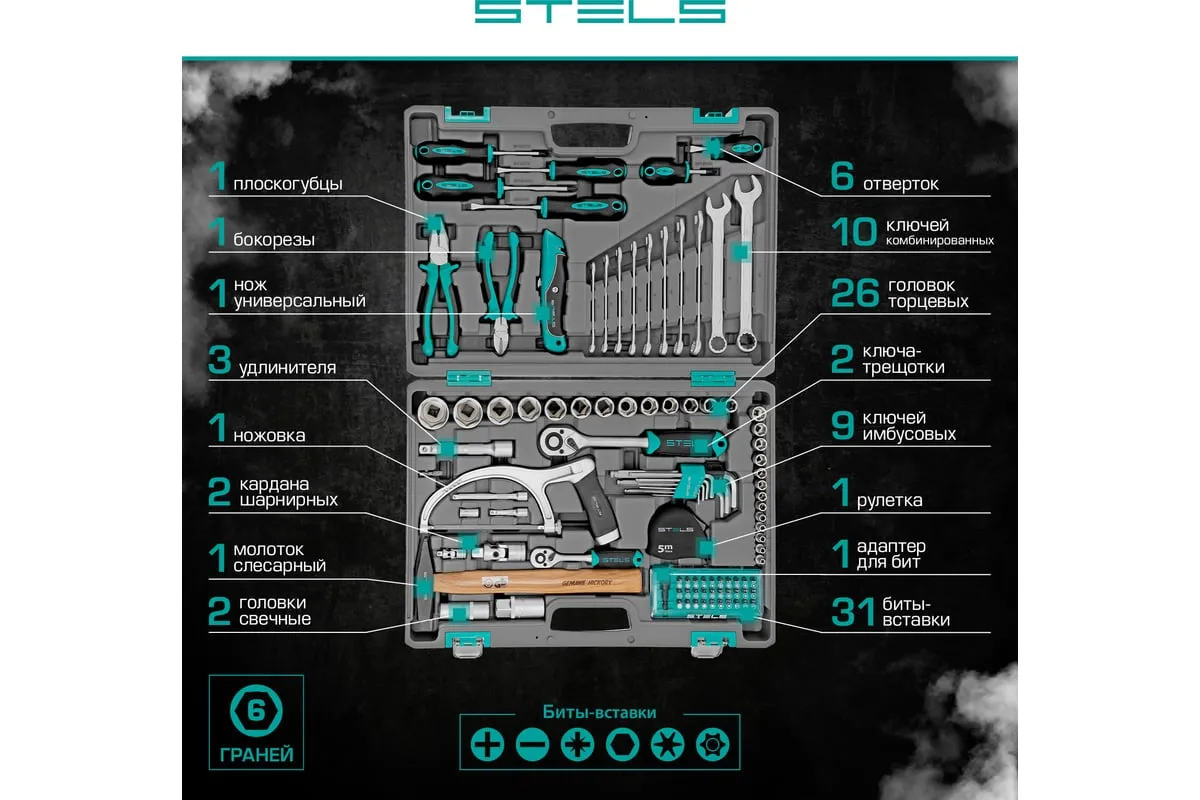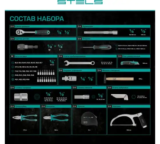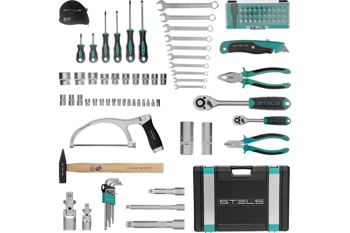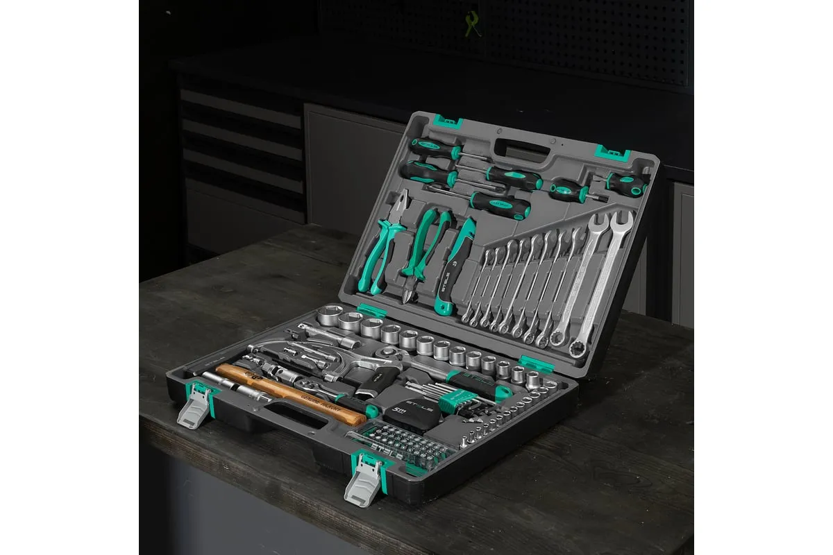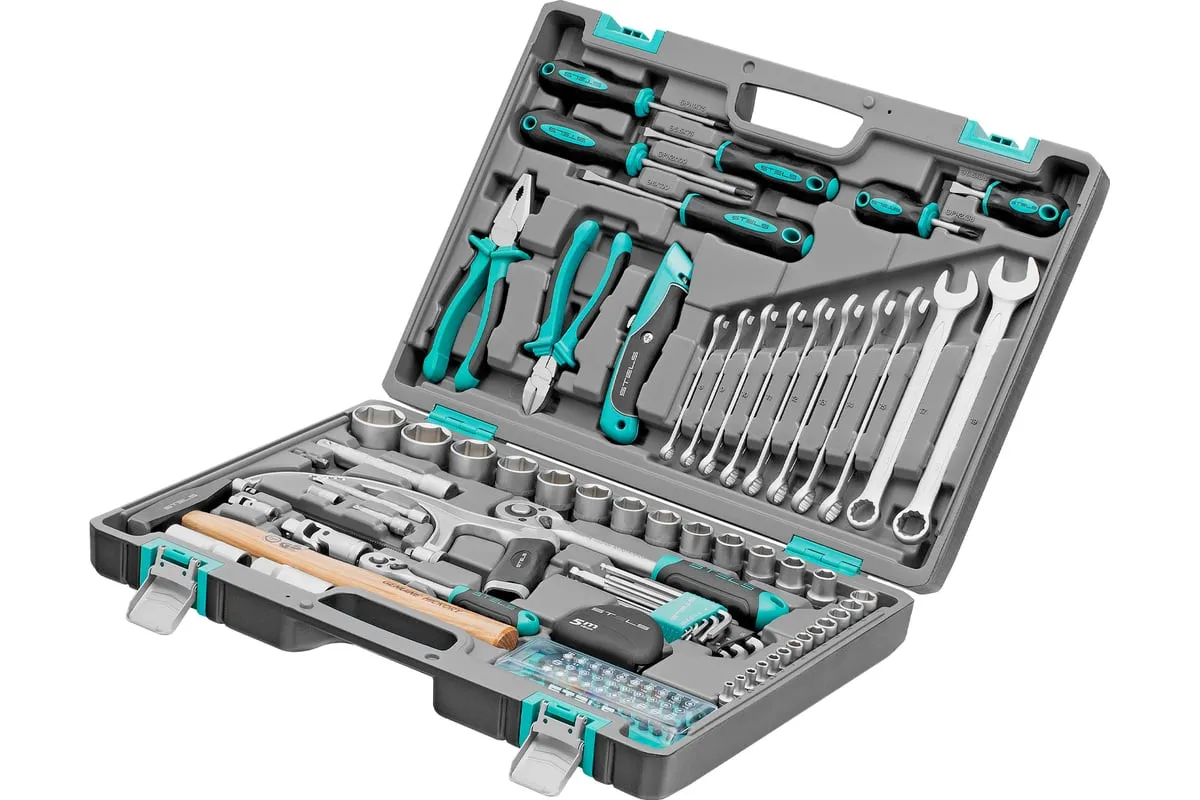 Набор инструментов STELS 98 предметов 14111 пригодится для обслуживания автомобиля, а также ремонта дома и дачи. Все инструменты комплекта изготовлены из хромованадиевой стали, легкой, но высокопрочной в использовании. Биты и отвертки выполнены из стали марки S2. Рукоятки из двухкомпонентного материала не скользят в руке при длительной работе. Кейс позволяет компактно хранить инструменты, обладает защелками и ручкой.