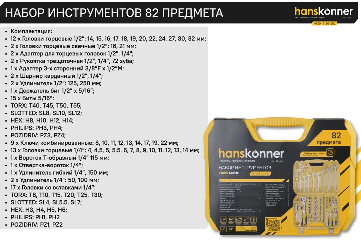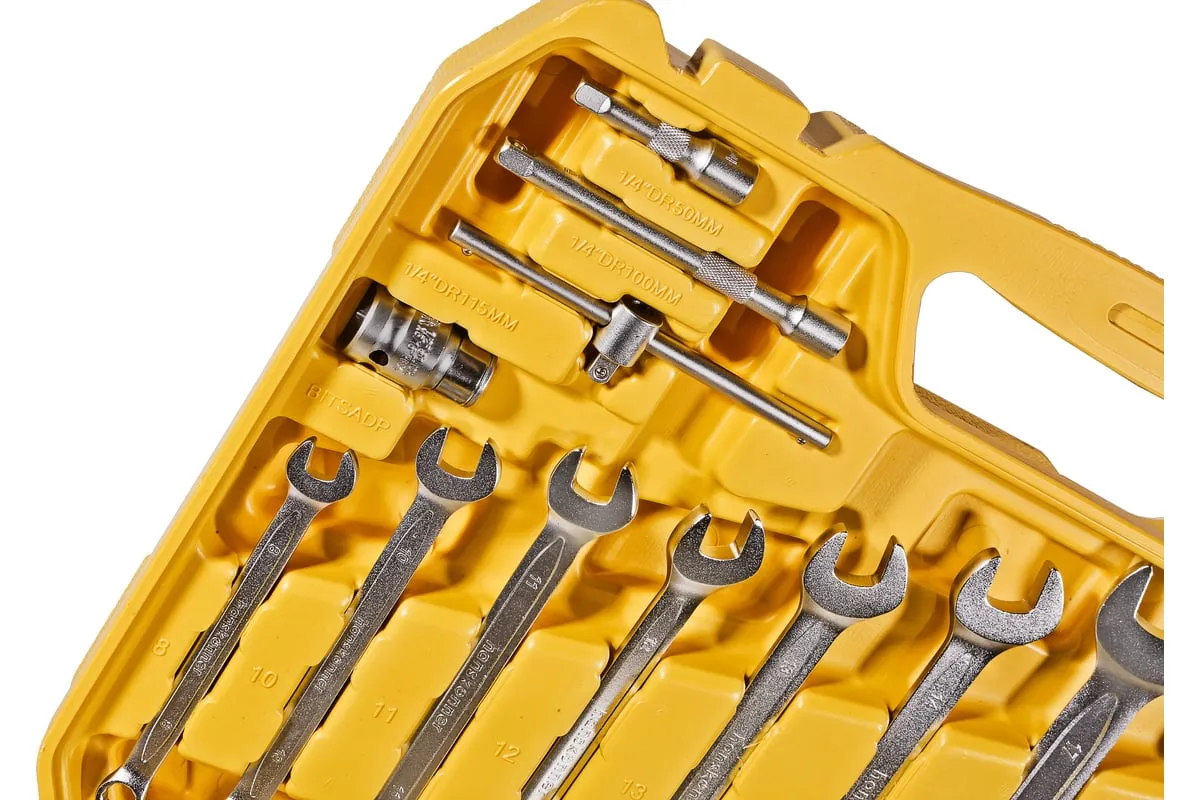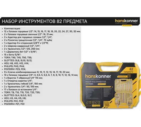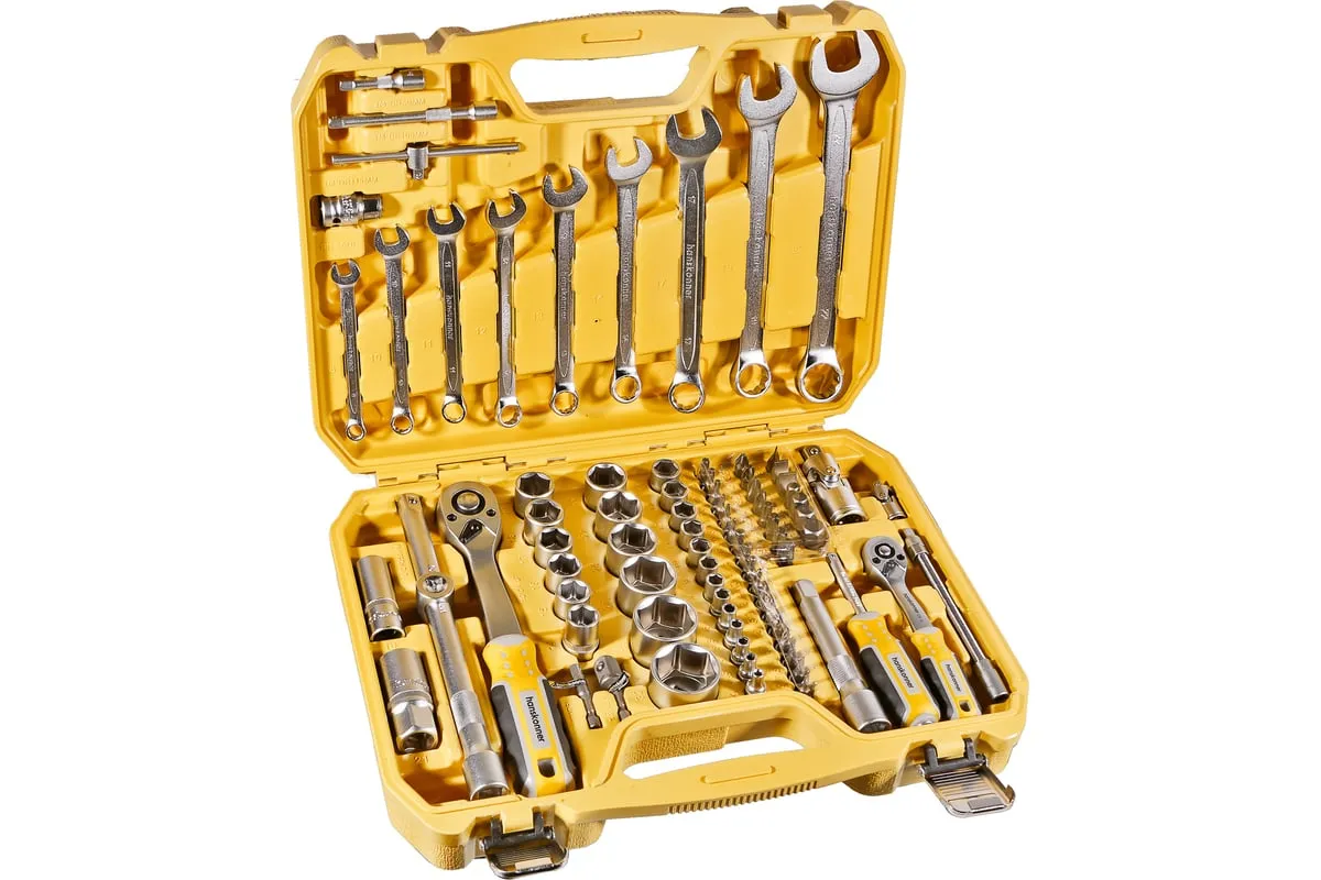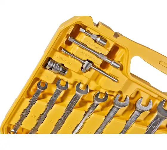 Набор инструментов 82 предмета предназначен для ремонта и обслуживания автомобилей и других транспортных средств. Является незаменимым помощником для работы в гараже, автомастерской или сервисном центре. Комбинированные ключи в комплекте облегчают работу с шестигранным крепежом и обеспечивают безопасный демонтаж болтов.