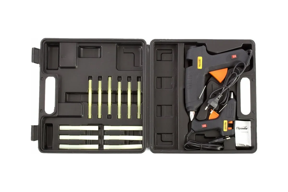 Набор клеевых пистолетов в кейсе SPARTA 93038 предназначен для соединения различных поверхностей. Два клеевых пистолета для разных в диаметре клеевых стержней могут использоватьсяв разных ситуациях. Рабочее место остается чистымблагодаря защите от капель. Кейс в комплектезащищает набор от ударовпри транспортировке.