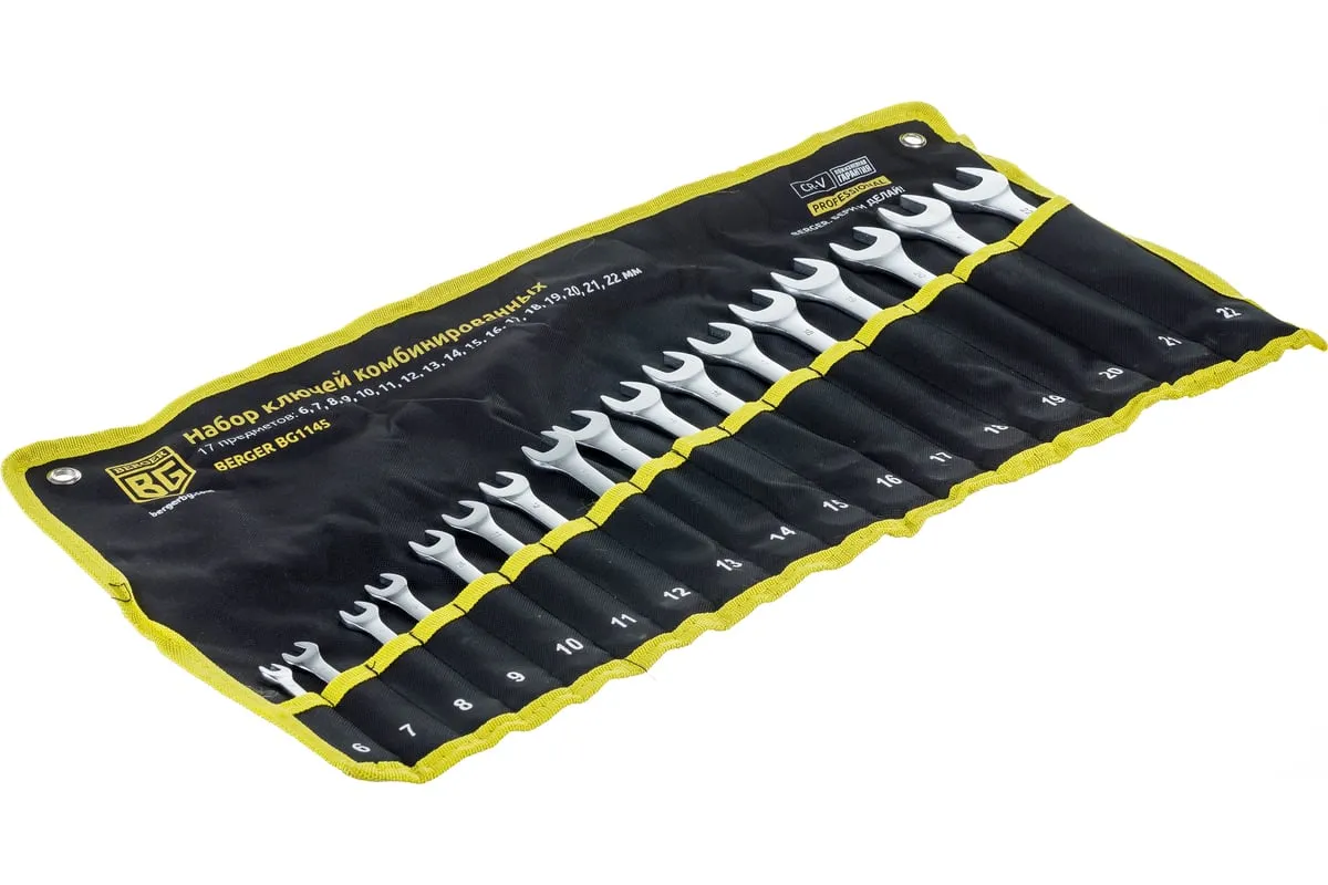 Набор комбинированных ключей 17шт Berger BG BG1145 сочетает в себе большое количество ручных приспособлений различных размеров с двусторонней конструкцией, где сочетаются U-образные и кольцевые головки. Данный комплект подходит для пополнения инструментального арсенала в гараже, мастерской, СТО, производственном участке и т. д.