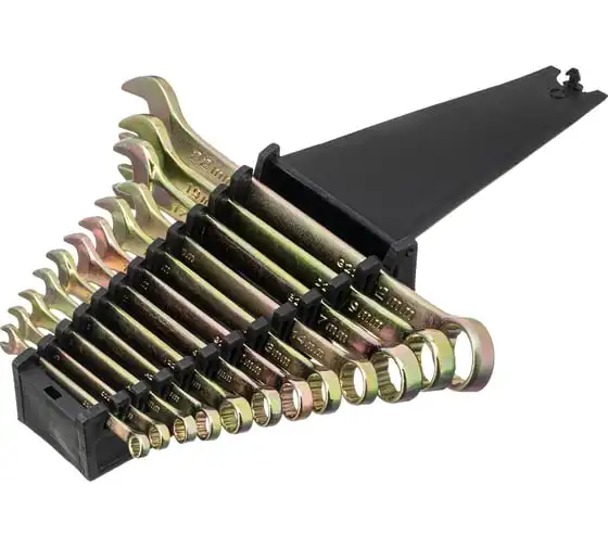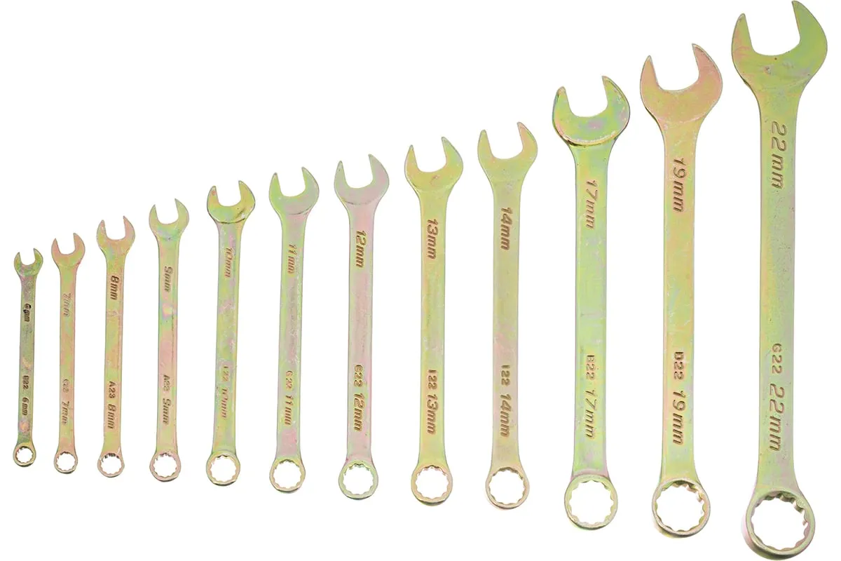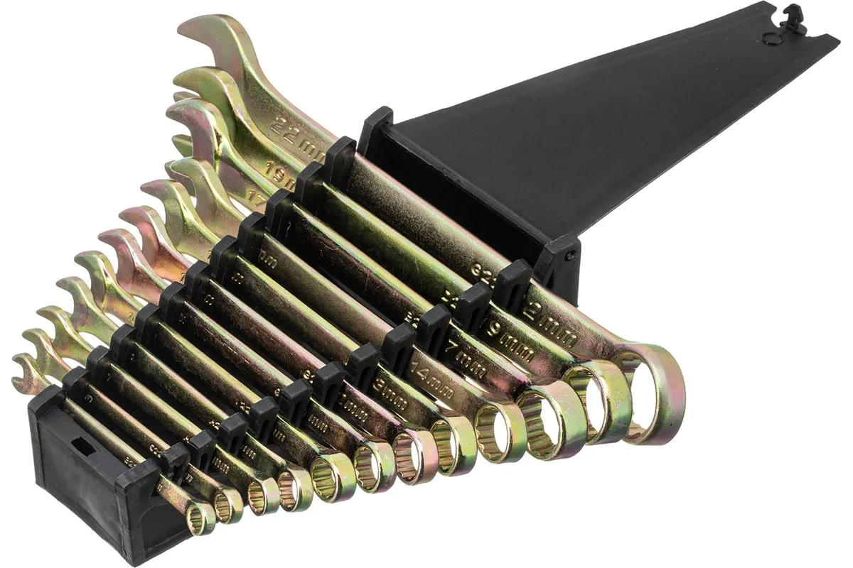 Набор комбинированных ключей предназначен для слесарно-монтажных работ с резьбовыми соединениями размером от 6 до 22 мм. Наличие рожкового и кольцевого зева делает каждый ключ универсальным в применении. Накидные головки с 12-гранным профилем надежно удерживают крепежи, уменьшая риск их деформации. Ключи будут полезны при проведении строительных и ремонтных работ, пригодятся для сборки и разборки оборудования, а также необходимы в быту.