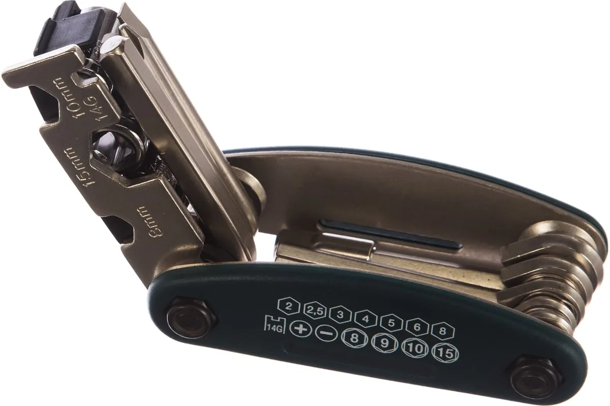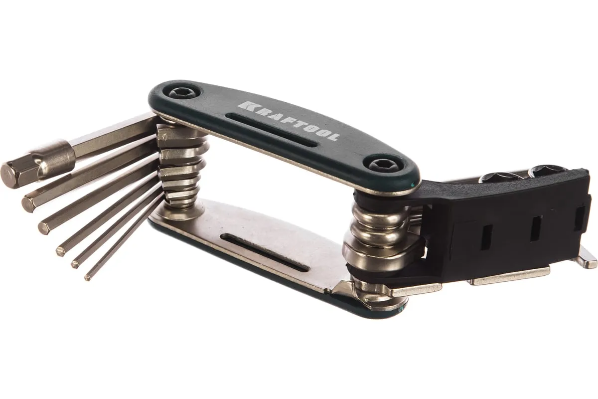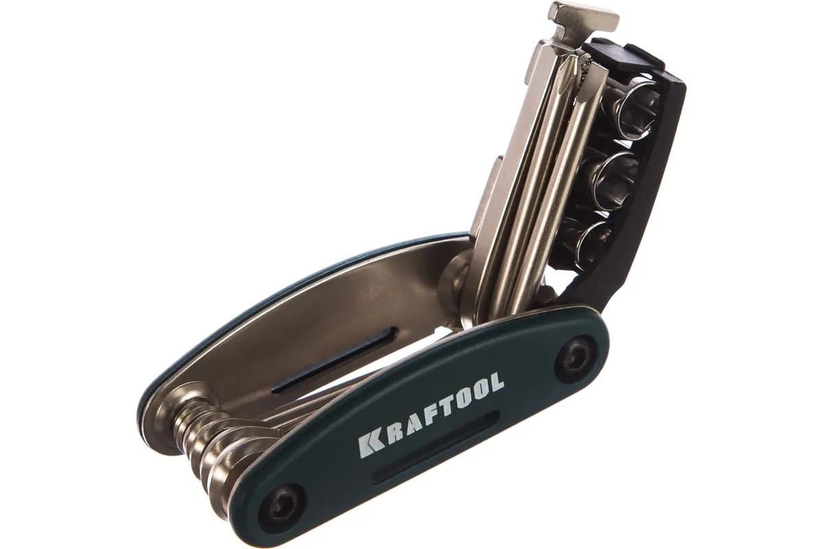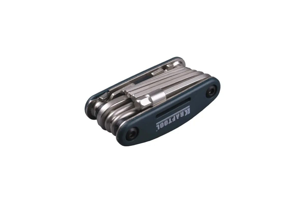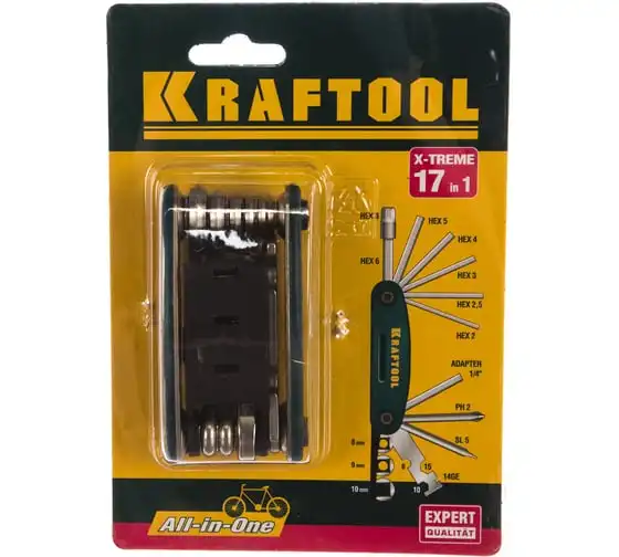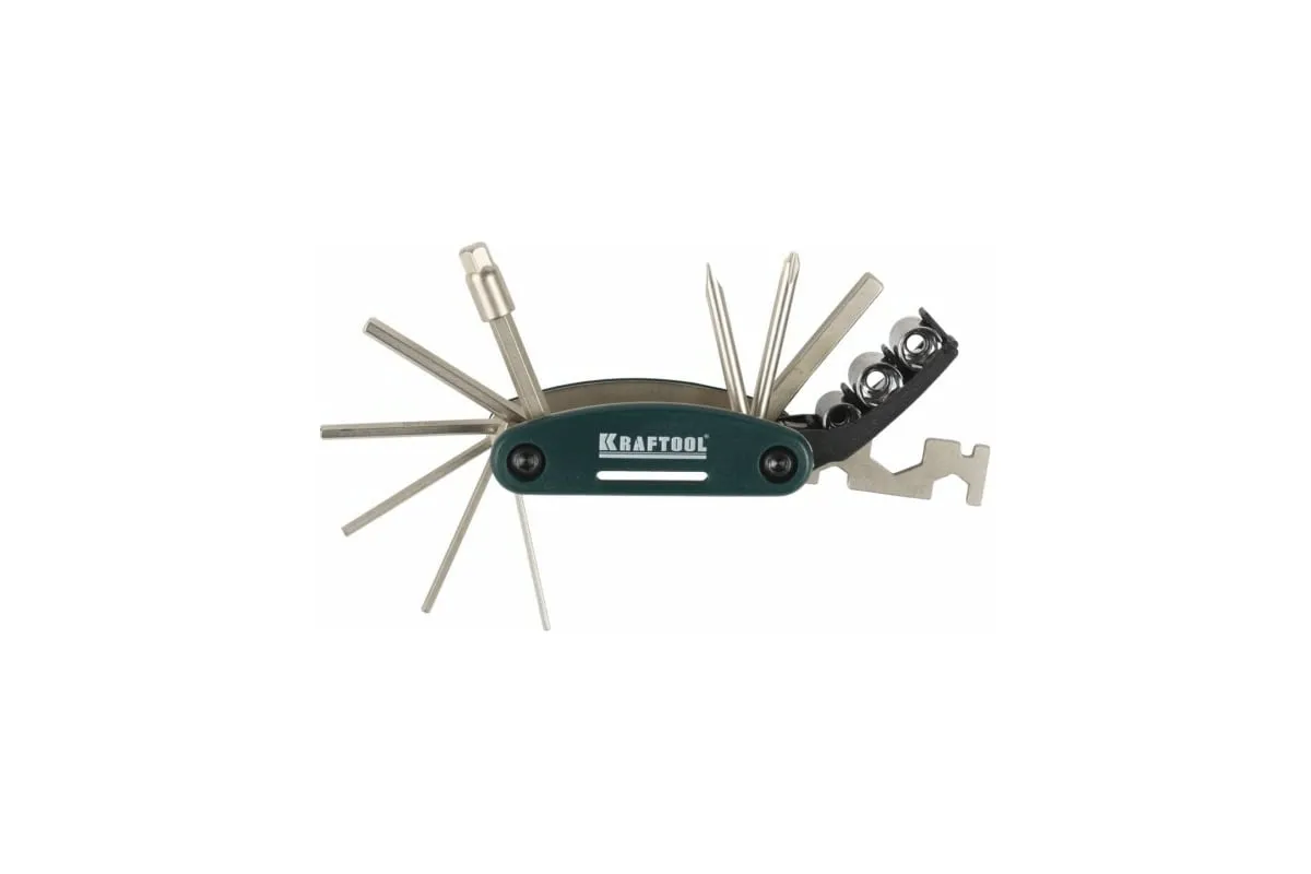 Набор KRAFTOOL для обслуживания велосипеда 16-в-1 26182-H16 - сразу несколько инструментов ремонта и содержания в порядке велосипедной техники. Складной комплект можно легко возить с собой - на всякий случай. В этом наборе вы найдете отвёртки HEX 2; HEX 2,5; HEX 3; HEX 4; HEX5; HEX 6; HEX 8 мм; PH № 2; SL 5 и комбинированные ключи 8; 10; 15 мм; 14 GE, а также адаптер для головок 1/4.