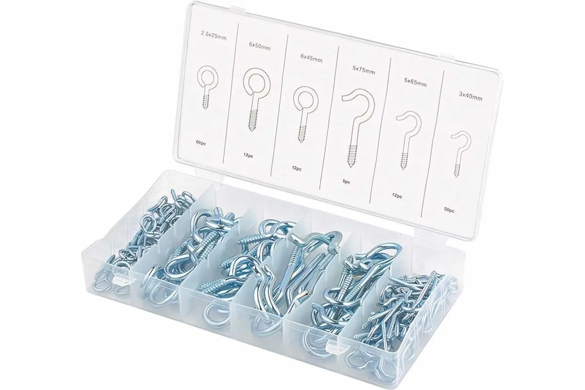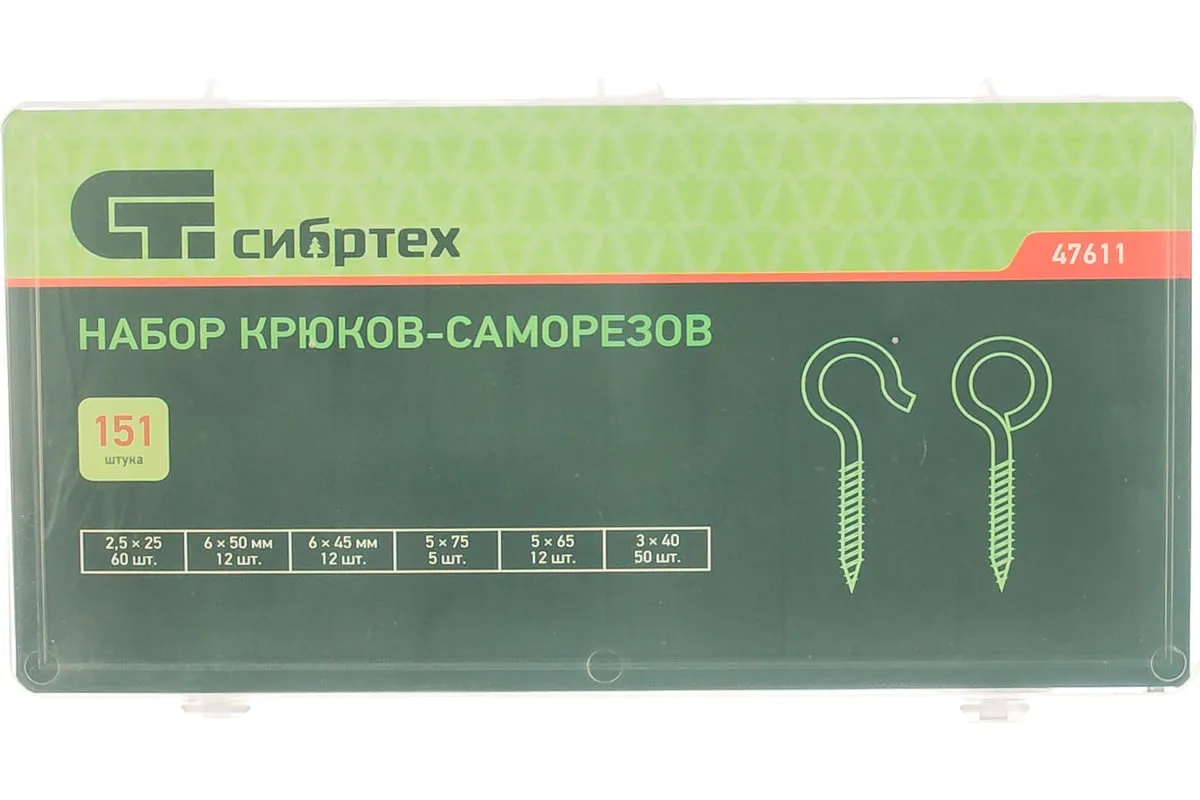 Набор крюков-саморезов СИБРТЕХ 151 предмет 47611 - это комплект крепежных соединений, которые предназначены для подвешивания грузов. В набор входят крюки традиционной формы и в форме кольца. Изделия изготовлены из стали. Комплект поставляется в пластиковом кейсе с отсеками для каждого размера.