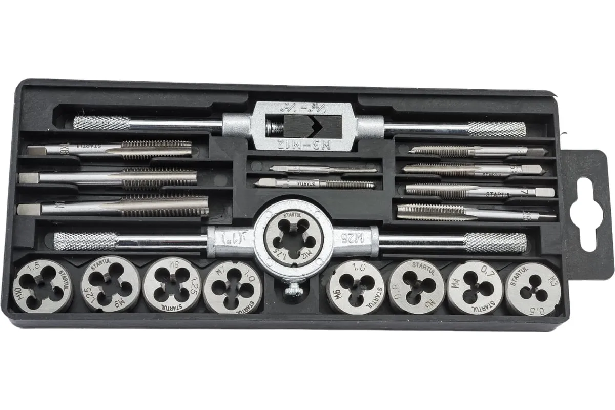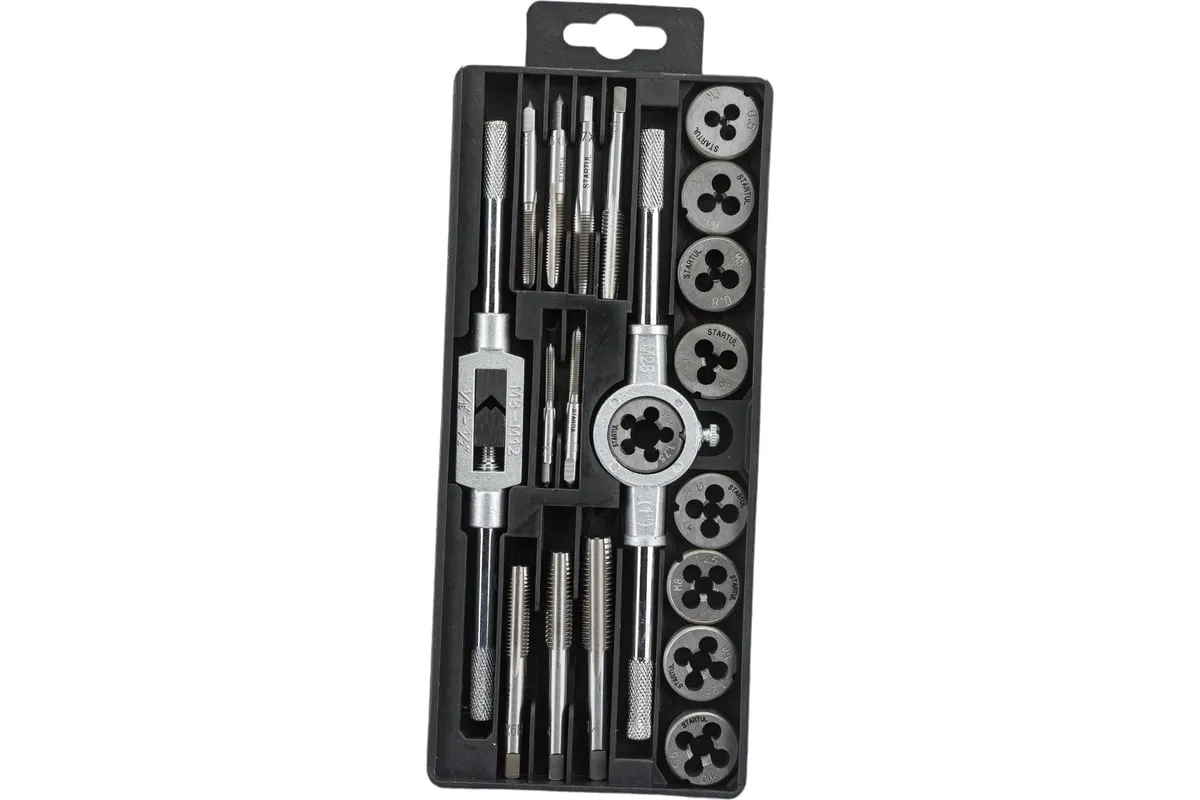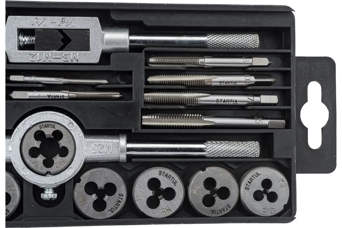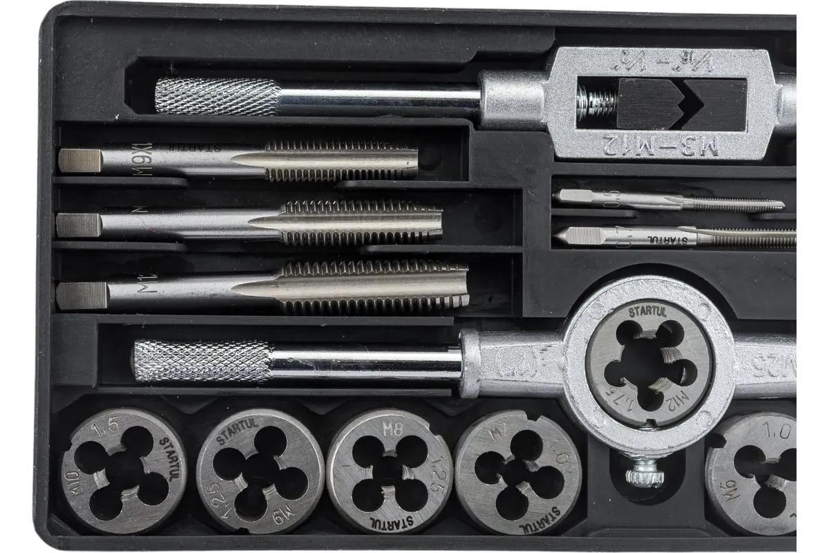 Набор металлорежущего инструмента используется для нарезания внутренней и внешней резьбы на металлических заготовках. Все предметы набора изготовлены из инструментальной легированной стали высокой прочности. Класс точности метчиков 4H. Класс точности плашек 6G.