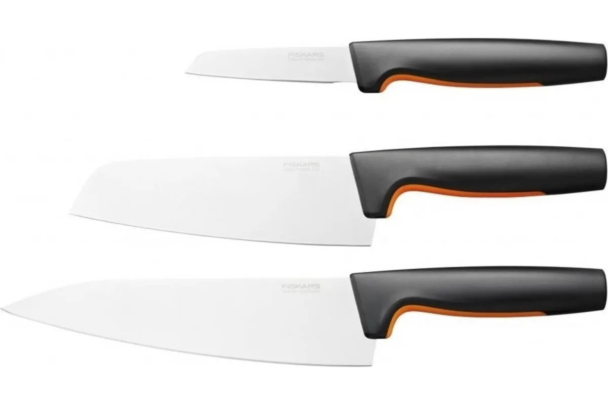 Набор из 3 ножей в блоке Fiskars Functional Form ™ включает в себя три наиболее часто используемые ножа: большой поварской нож, нож Сантоку и нож для корнеплодов