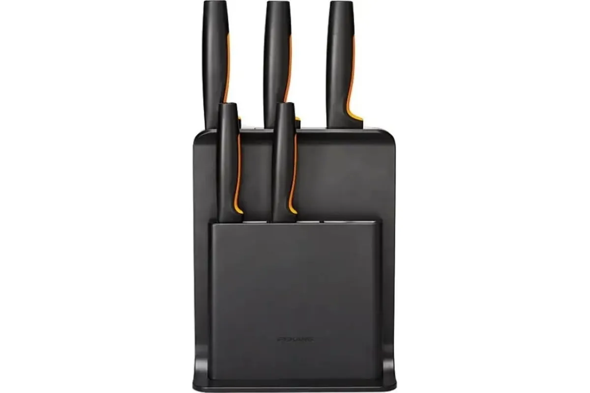 Набор из 5 ножей в блоке Fiskars Functional Form ™ включает в себя пять наиболее часто используемых ножей: большой поварской нож, нож для хлеба, нож Сантоку, нож для томатов и нож для корнеплодов