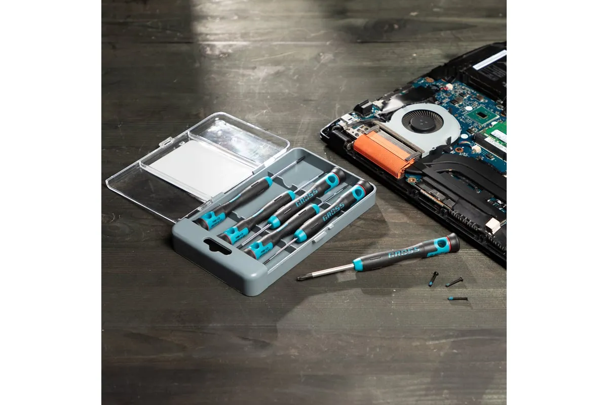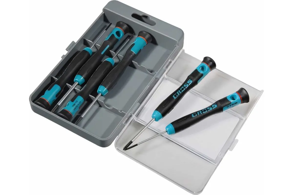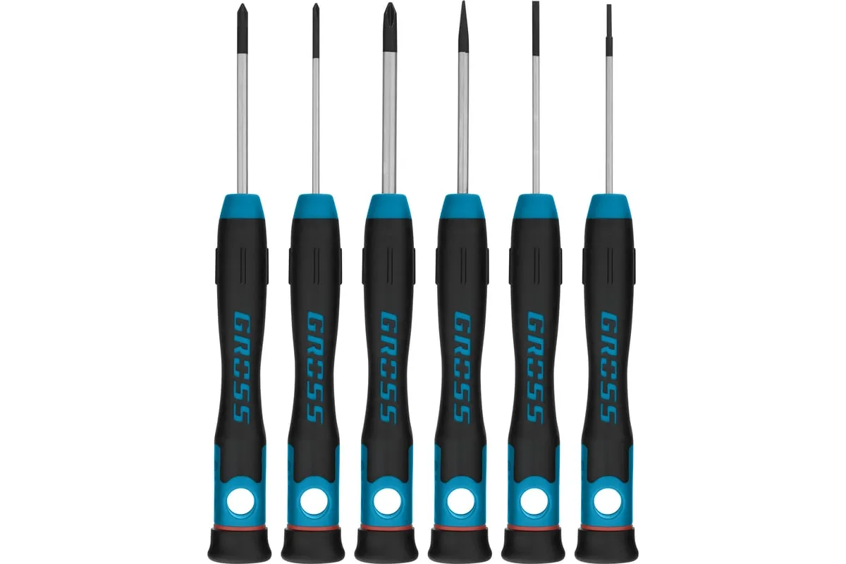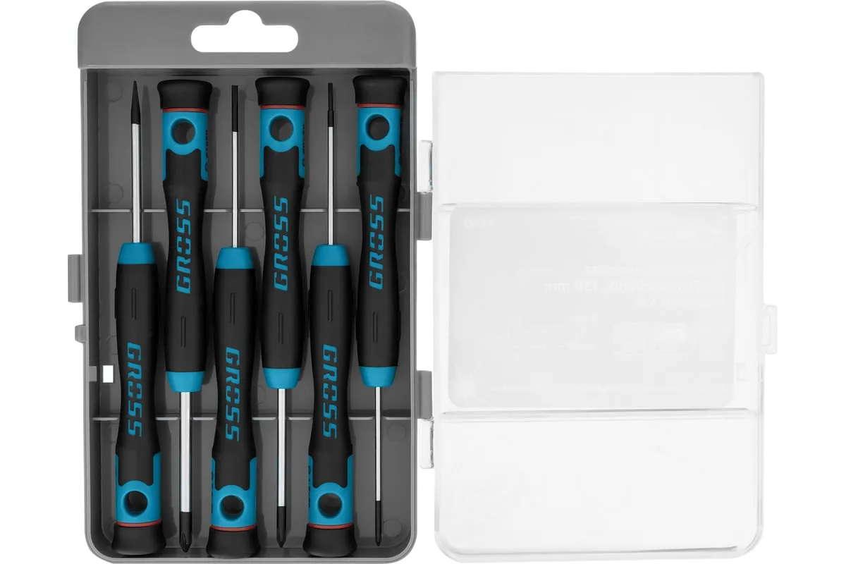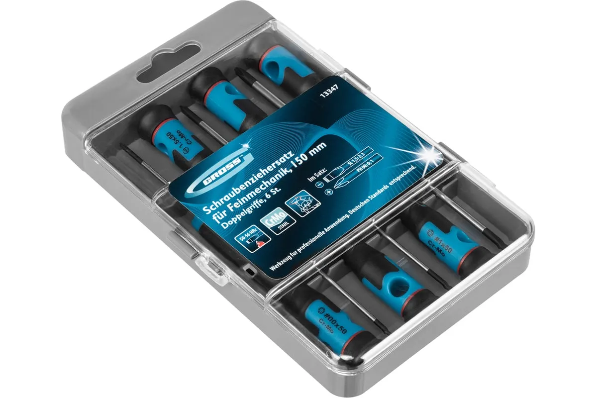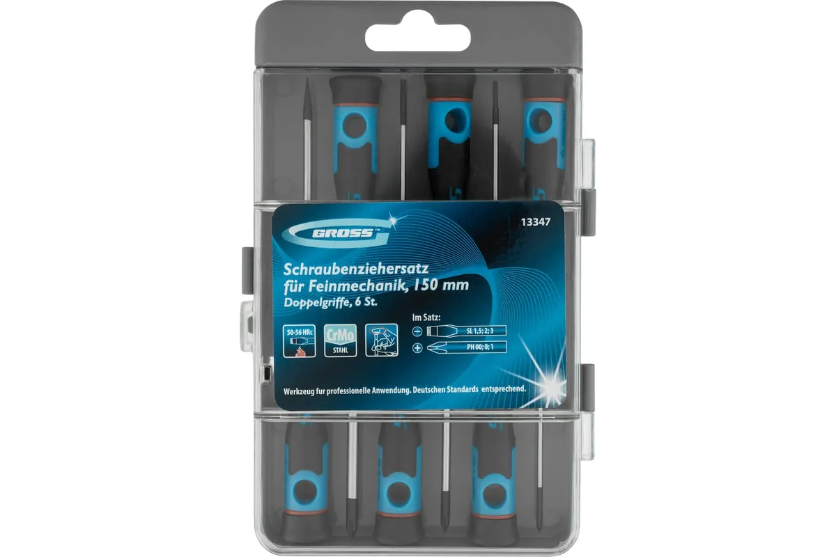 Набор отверток для точной механики 150 мм GROSS 13347 используется для работ с мелкими деталями, а также для точных механических работ. В наборе 6 отверток (РН 00; РН 0; РН 1; SL 1,5; SL 2,0; SL 3,0.) Стержни выполнены из прочной стали. Твердость материала 52?54 HRc. Эргономичные рукоятки отличаются противоскользящим покрытием из термопластичного эластомера повышенной износостойкости. Отвертки выполнены со свободно вращающимся затыльником.