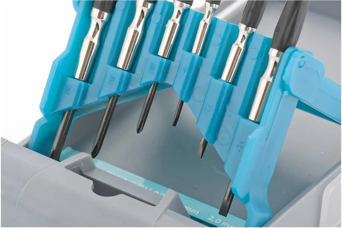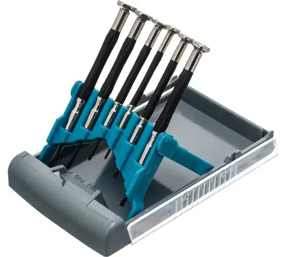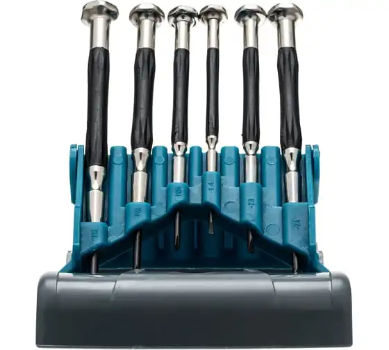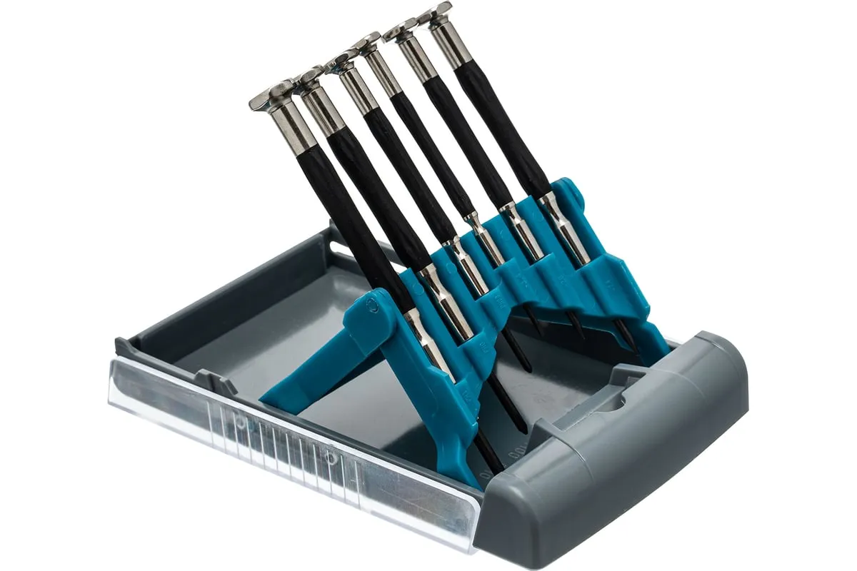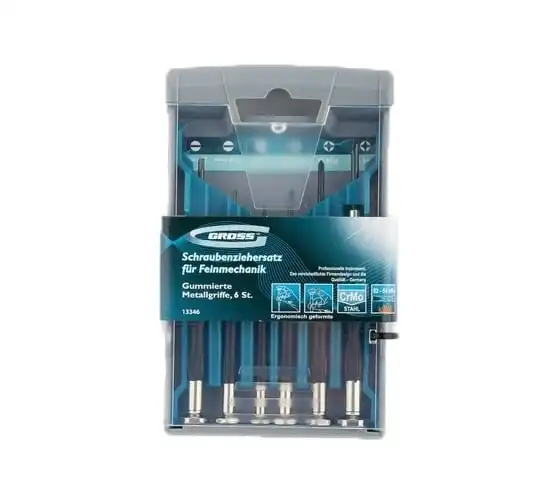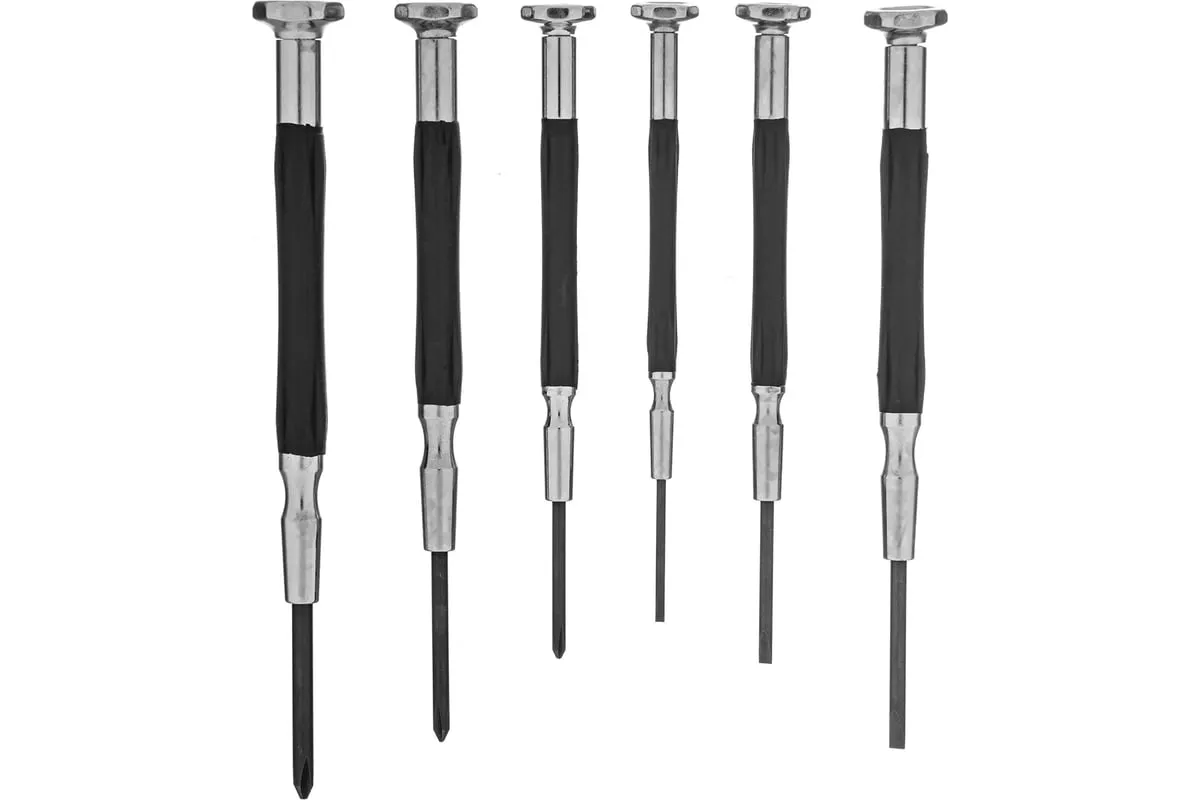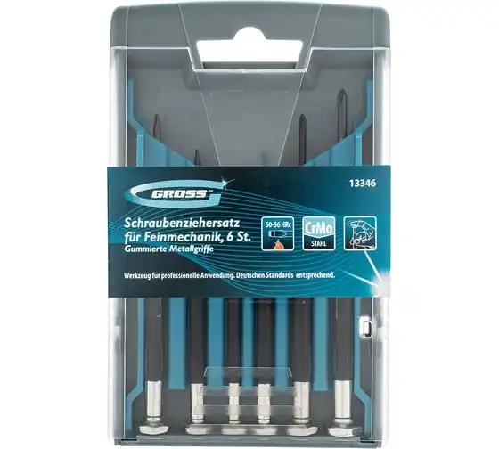 Набор отверток для точной механики GROSS 13346 используется для механических работ с мелкими деталями. В комплекте 6 отверток ( РН 00, РН 0, РН 1, SL 1.4, SL 2.0, SL 2.4 ). Стальные стержни с наконечниками покрытыми специальным антикоррозийным покрытием. Твердость материала 52?54 HRc. Рукоятки имеют противоскользящее покрытие из термопластичного эластомера.