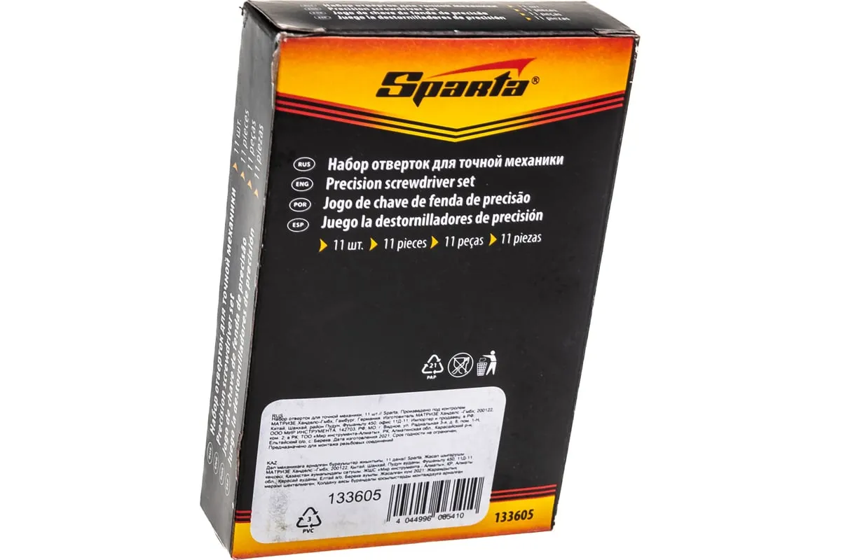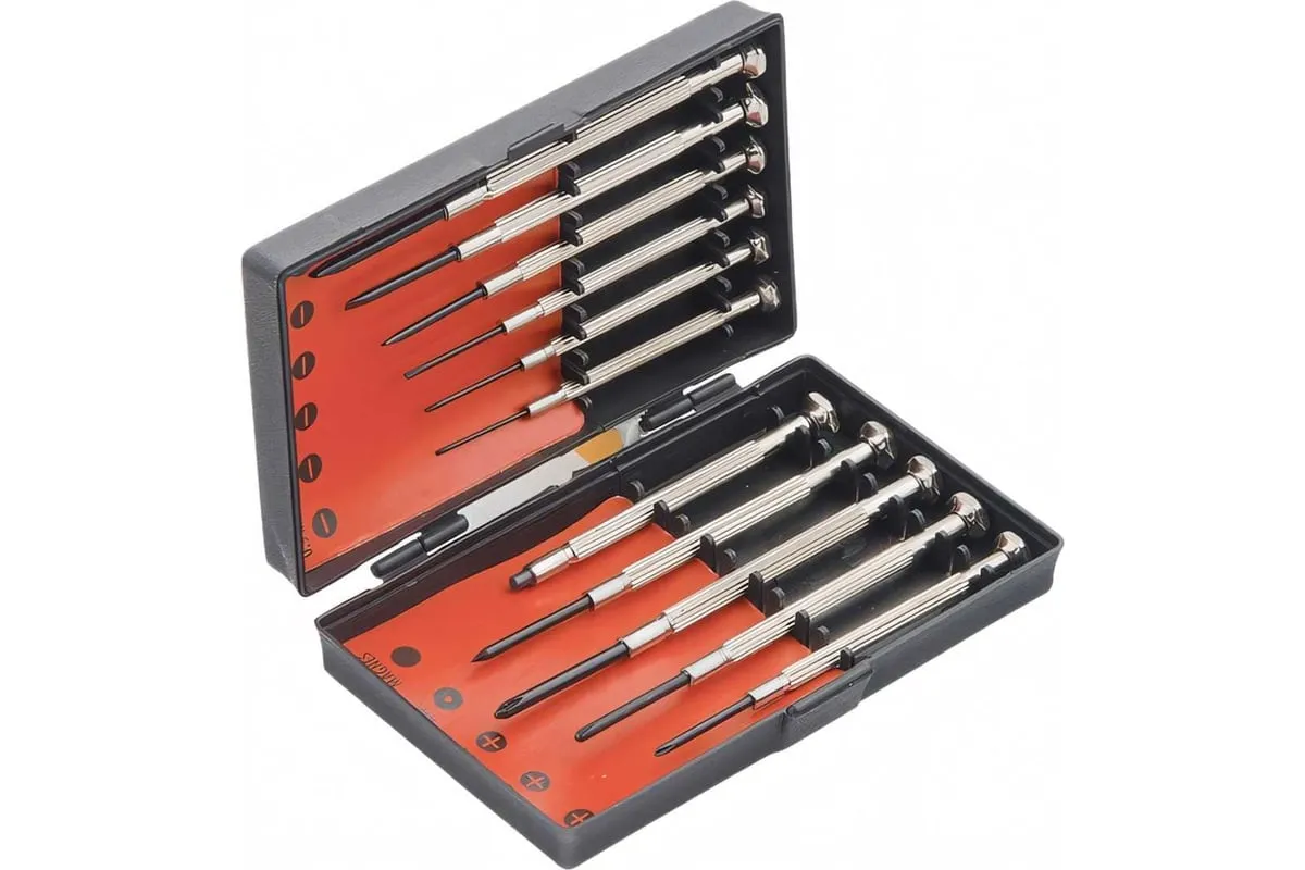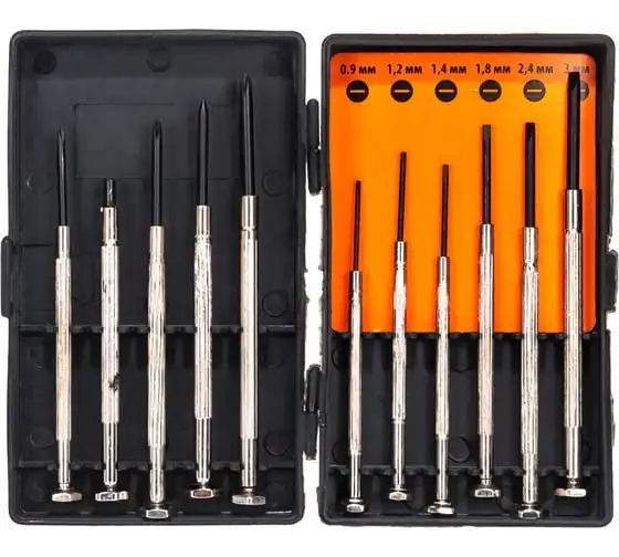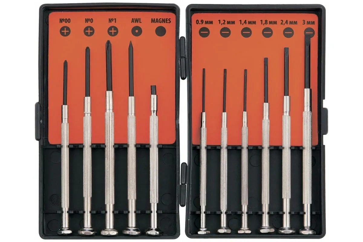 Набор отверток для точной механики, 11 шт SPARTA 133605 предназначен для механических работ с мелкими деталями. В наборе 11 отверток (№00; №0; №1; AWL; MAGNES; 0,9 мм; 1,2 мм; 1,4 мм; 1,8 мм; 2,4 мм; 3 мм). Стальные рукоятки со специальным рифлением не выскальзывают из рук. Набор упакован в удобный пластиковый бокс.