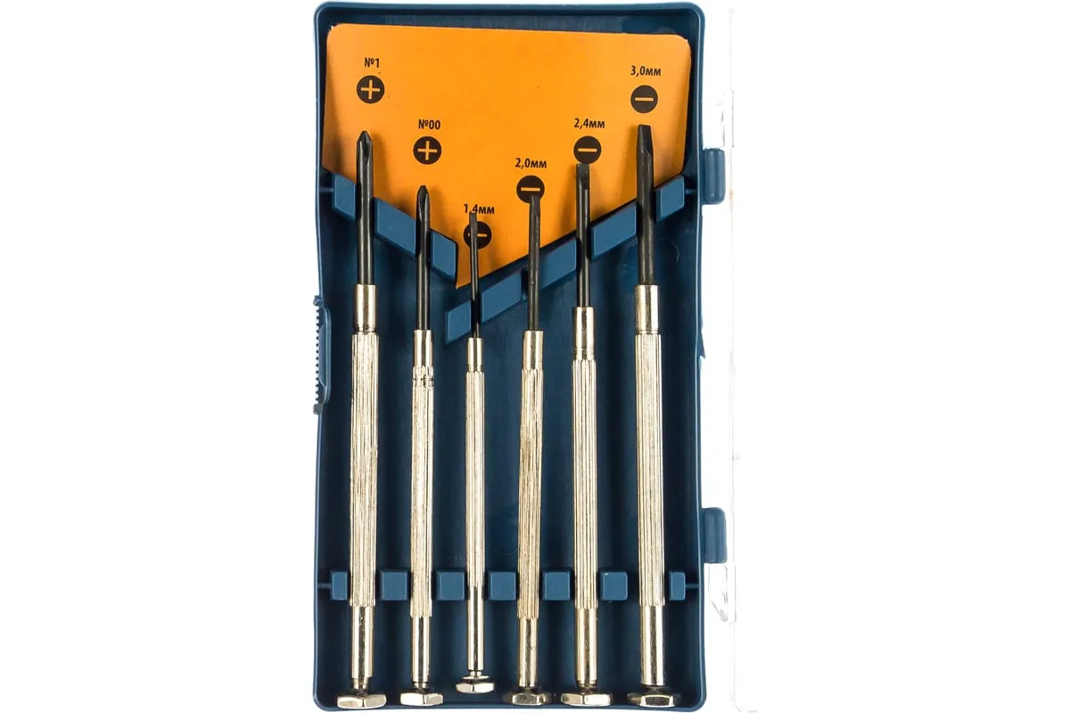 Набор отверток для точной механики SPARTA 133445 предназначен для работ с мелкими деталями. В наборе 6 отверток ( №0; №1; 1,4 мм; 2,0 мм; 2,4 мм; 3,0 мм. ). Рукоятки изготовлены из стали, со свободно вращающимися затыльниками. Набор упакован в удобный пластиковый бокс.