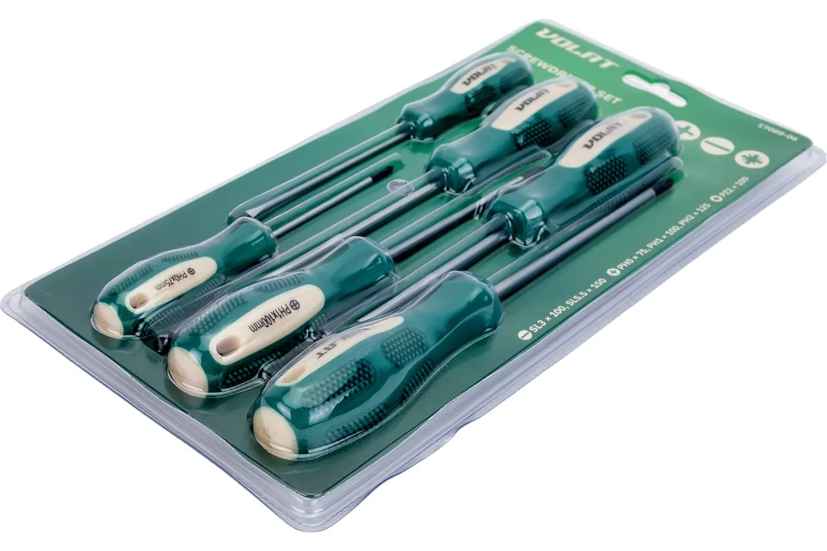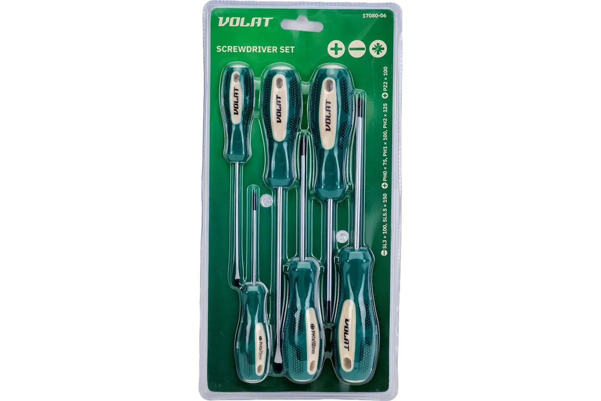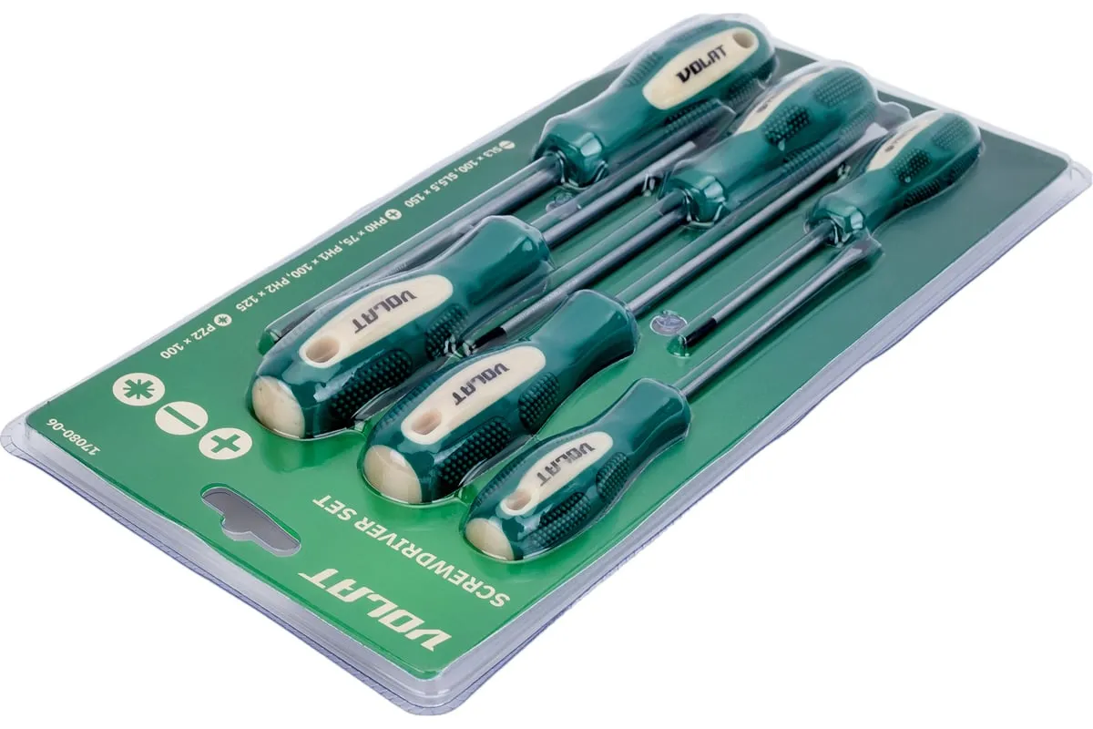 Набор отверток ВОЛАТ 6 предметов 17080-06 предназначен для монтажа и демонтажа резьбовых соединений. Эргономичная противоскользящая рукоятка обеспечивает удобный и надежный хват. Рабочие концы намагничены для удобного удержания крепежа. Стержни отверток выполнены из качественной стали высокой прочности.