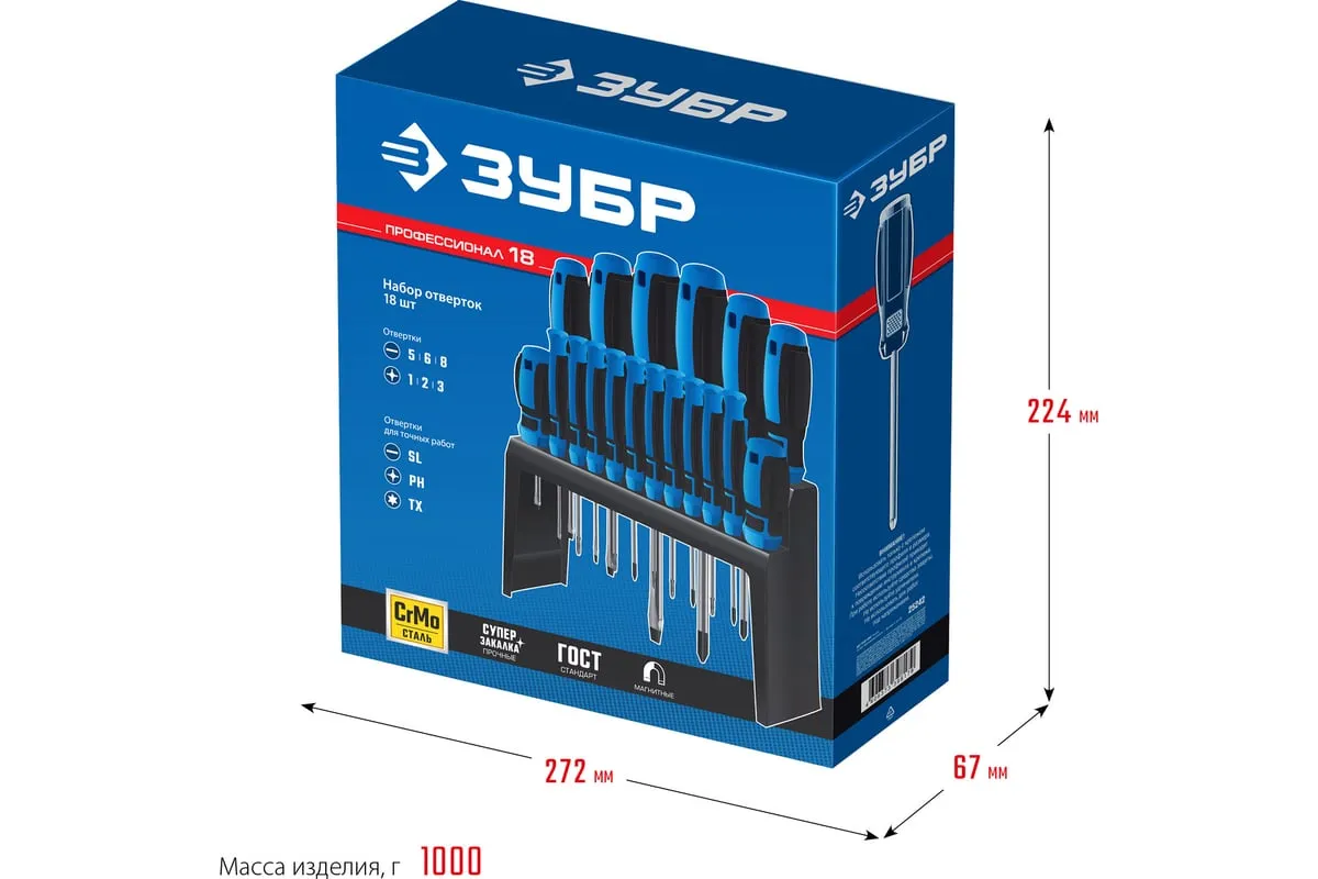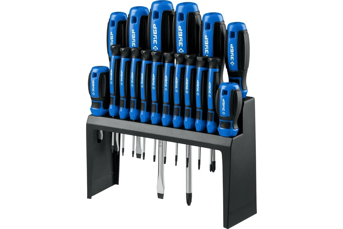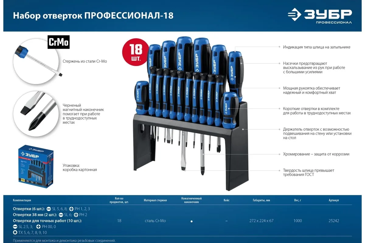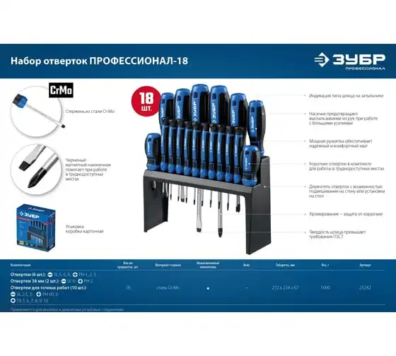 Набор отверток ЗУБР Профессионал-18 в держателе, 18 шт. 25242 предназначен для монтажа и демонтажа резьбовых соединений. Отвертки оснащены специальной высокопрочной трехкомпонентной рукояткой.