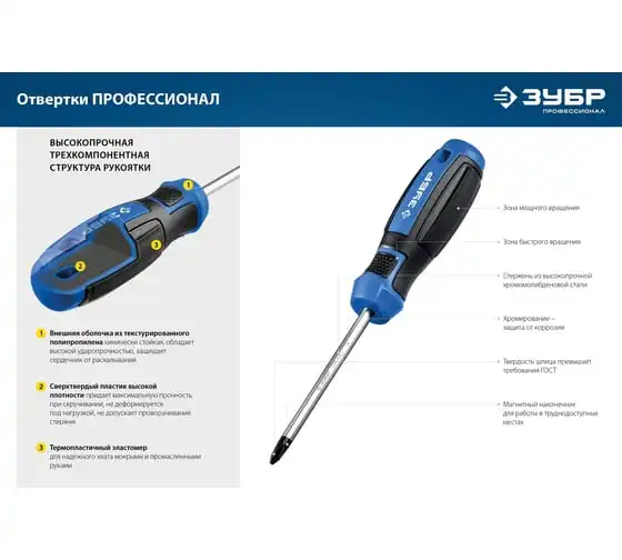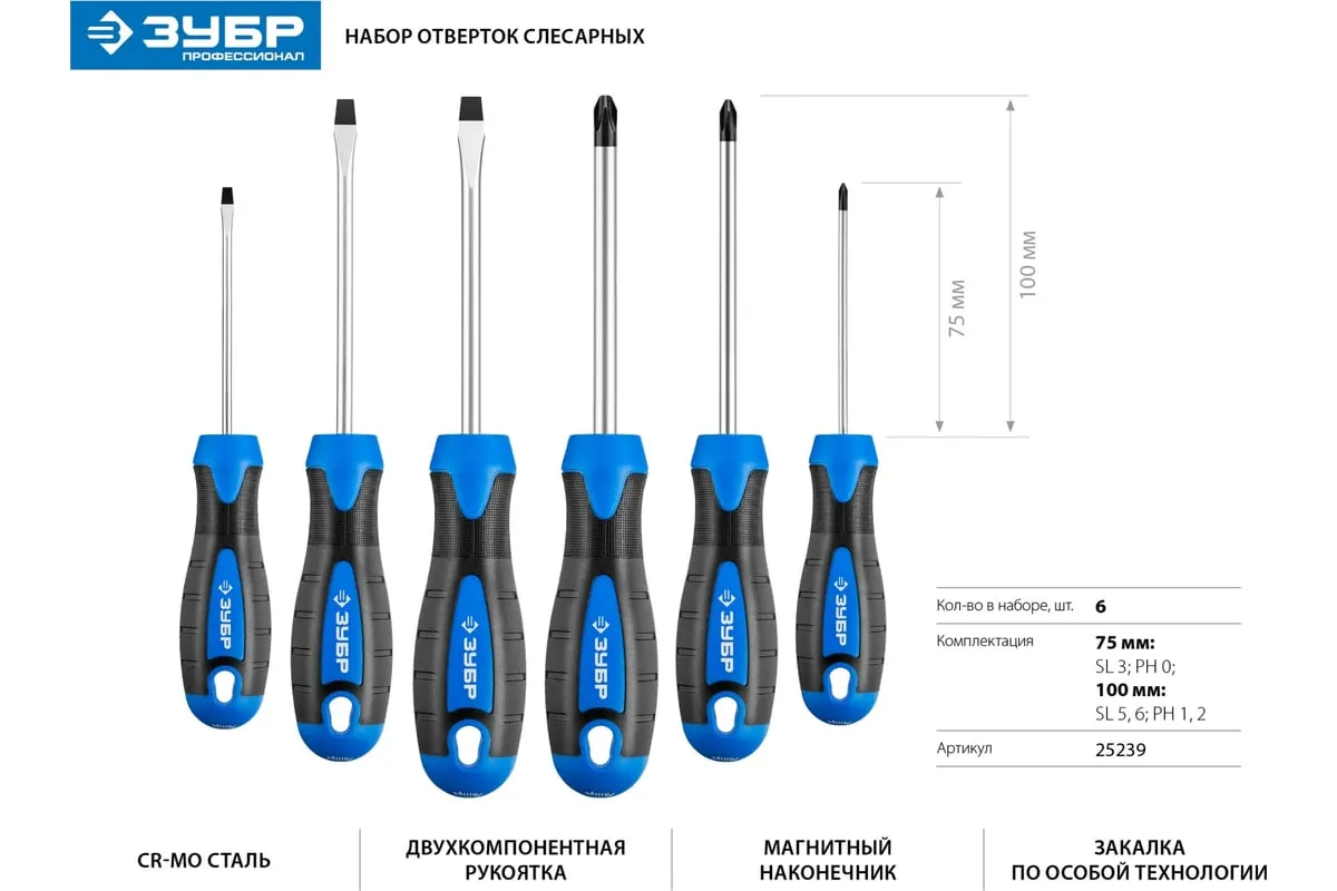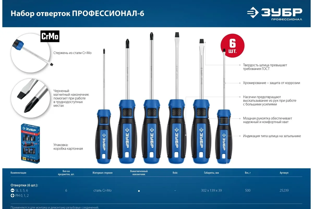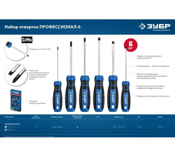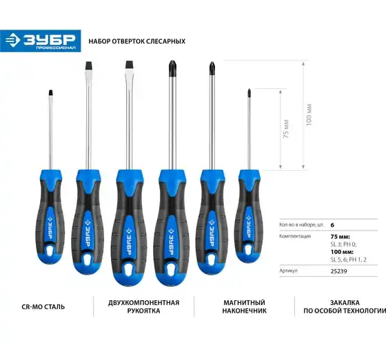 Набор слесарных отверток ЗУБР Профессионал 25239 представлен в оптимальной комплектации и содержит популярный типоразмер моделей. Магнитные наконечники легко удерживают крепеж. Это придает значительное удобство в труднодоступных местах. Специальные двухкомпонентные рукоятки имеют эргономичную форму. Это обеспечивает надежный захват и предотвращает выскальзывание из руки во время работы с инструментом.