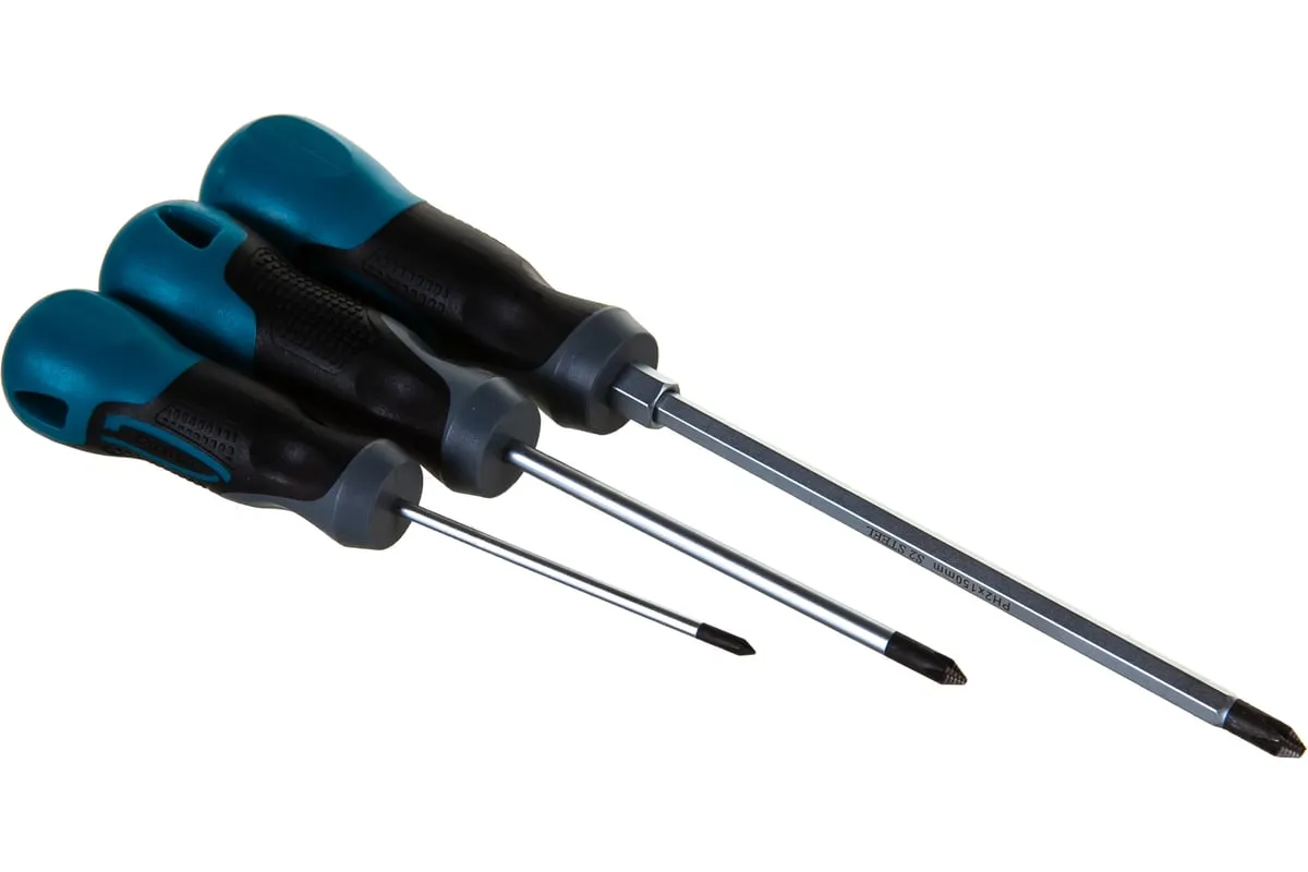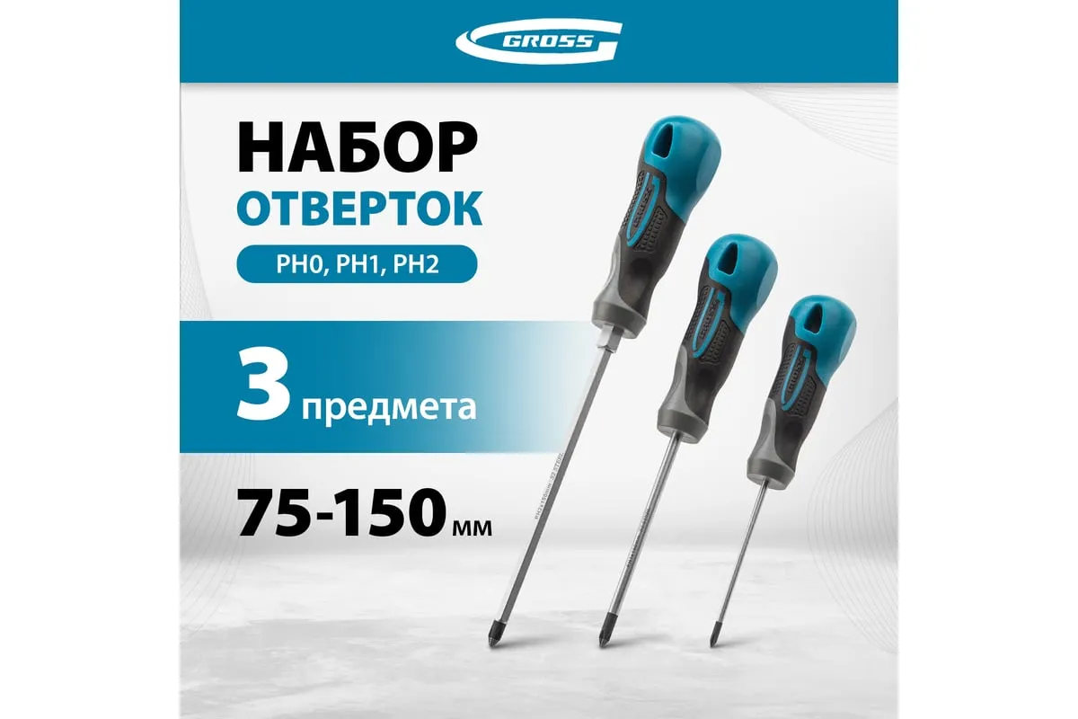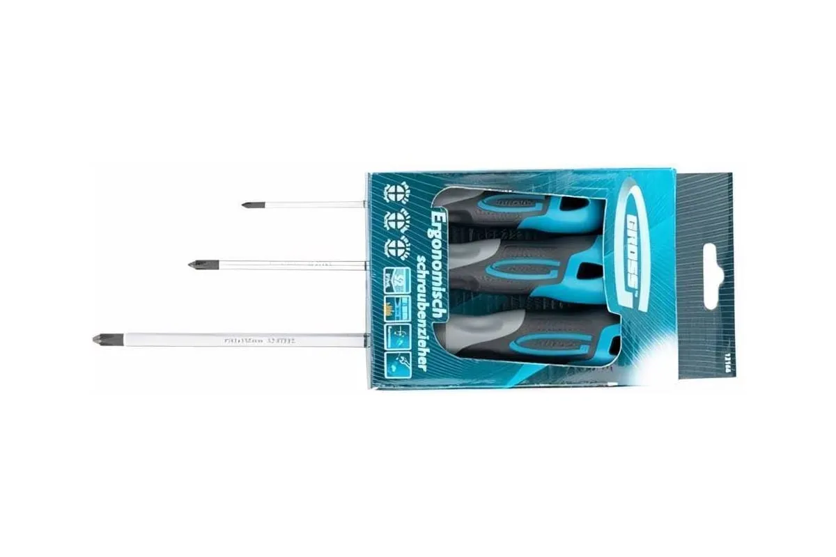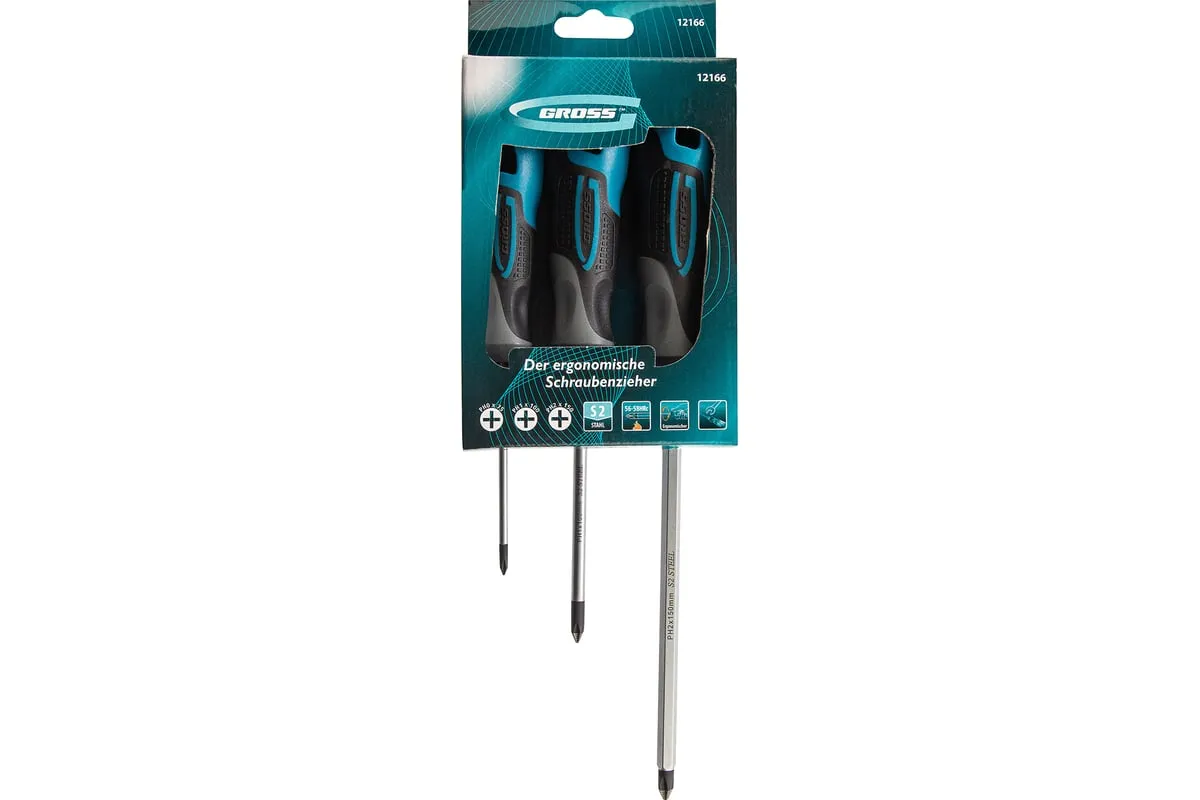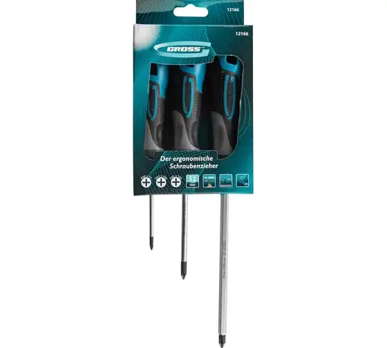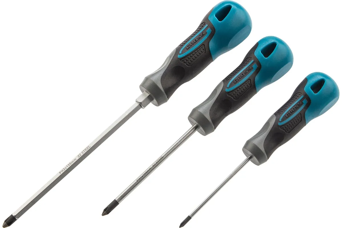 Набор отвёрток 3 шт S2 GROSS 12166 применяется для монтажных и ремонтных работ. В набор входит три стальных отвертки( PH 0 х 75, PH 1 х 100, PH 2 х 150), которые имеют эргономичную рукоятку, стержень с намагниченным наконечником и насечками. Имеется силовой элемент "под ключ".
