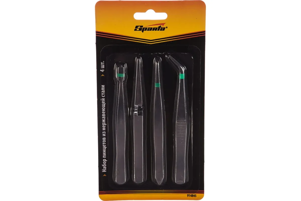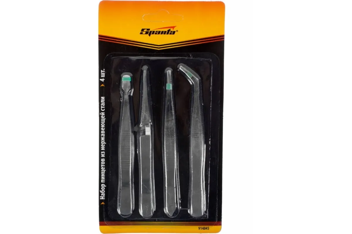 Набор пинцетов из нержавеющей стали SPARTA 4 шт 914845 используется для работы с мелкими предметами. Комплект состоит из 4 пинцетов, которые имеют острые, загнутые и плоские губки. Инструменты изготовлены из нержавеющей стали.