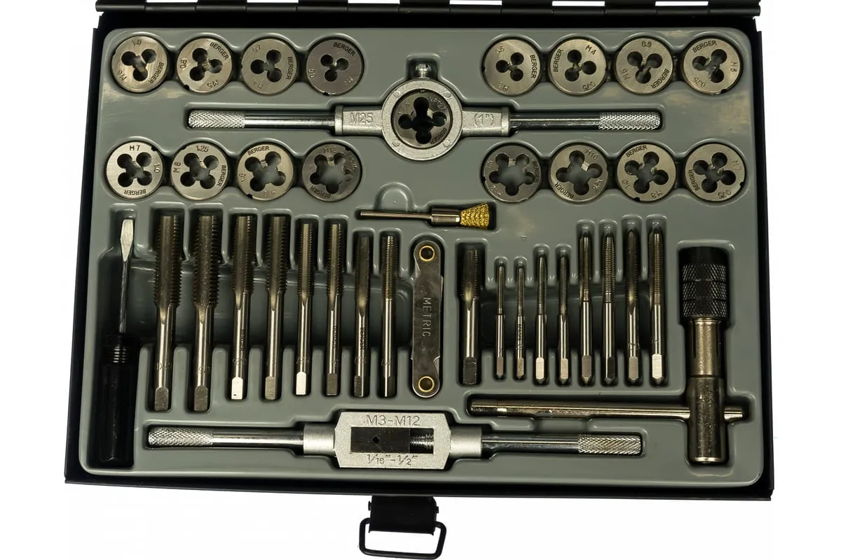 Набор плашек и метчиков 40шт Berger BG BG40TDS включает в себя большое количество инструментов и приспособлений для профессионального использования. Они обеспечивают высокое качество нарезания и калибрования внешней и внутренней резьбы на металлических деталях и заготовках. Все компоненты изготовлены из высококачественной стали, имеют повышенный рабочий ресурс.