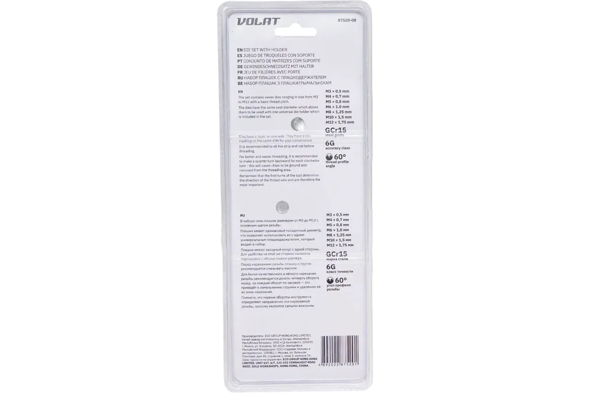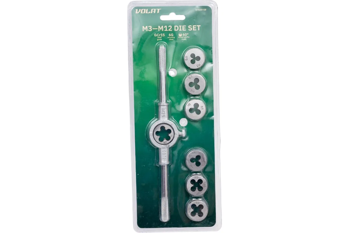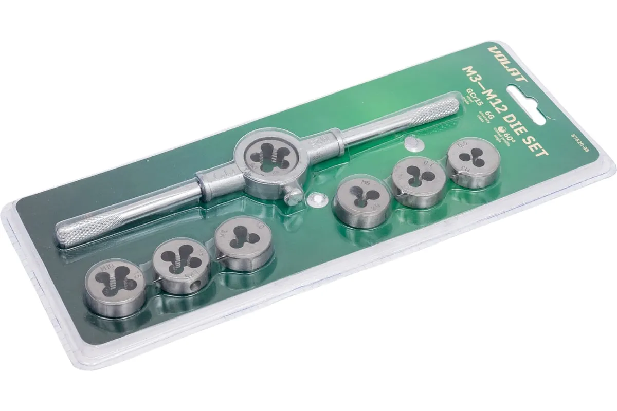 Набор плашек ВОЛАТ 8 предметов 87520-08 предназначен для нарезания внутренней резьбы разного диаметра, типа и шага в сквозных и глухих отверстиях. Инструмент выполнен из качественной хромированной стали GCr15, что обеспечивает высокую прочность и долговечность. Плашки имею класс точности 6G. Рифленые рукоятки плашкодержателя обеспечивают удобную работу.