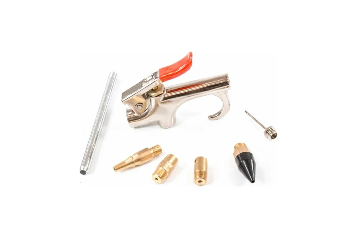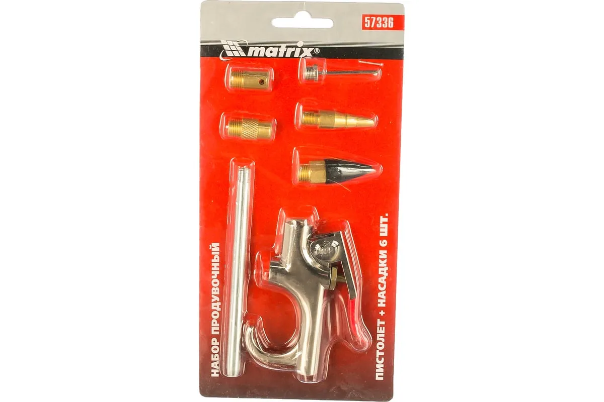 Набор пневматический продувочный пистолет с насадками MATRIX 6 шт 57336 используется для продувки малых отверстий и больших поверхностей.