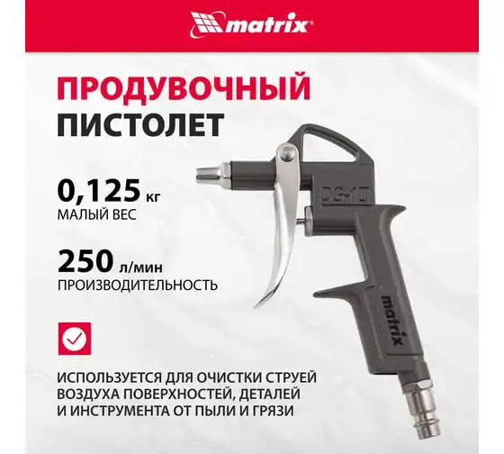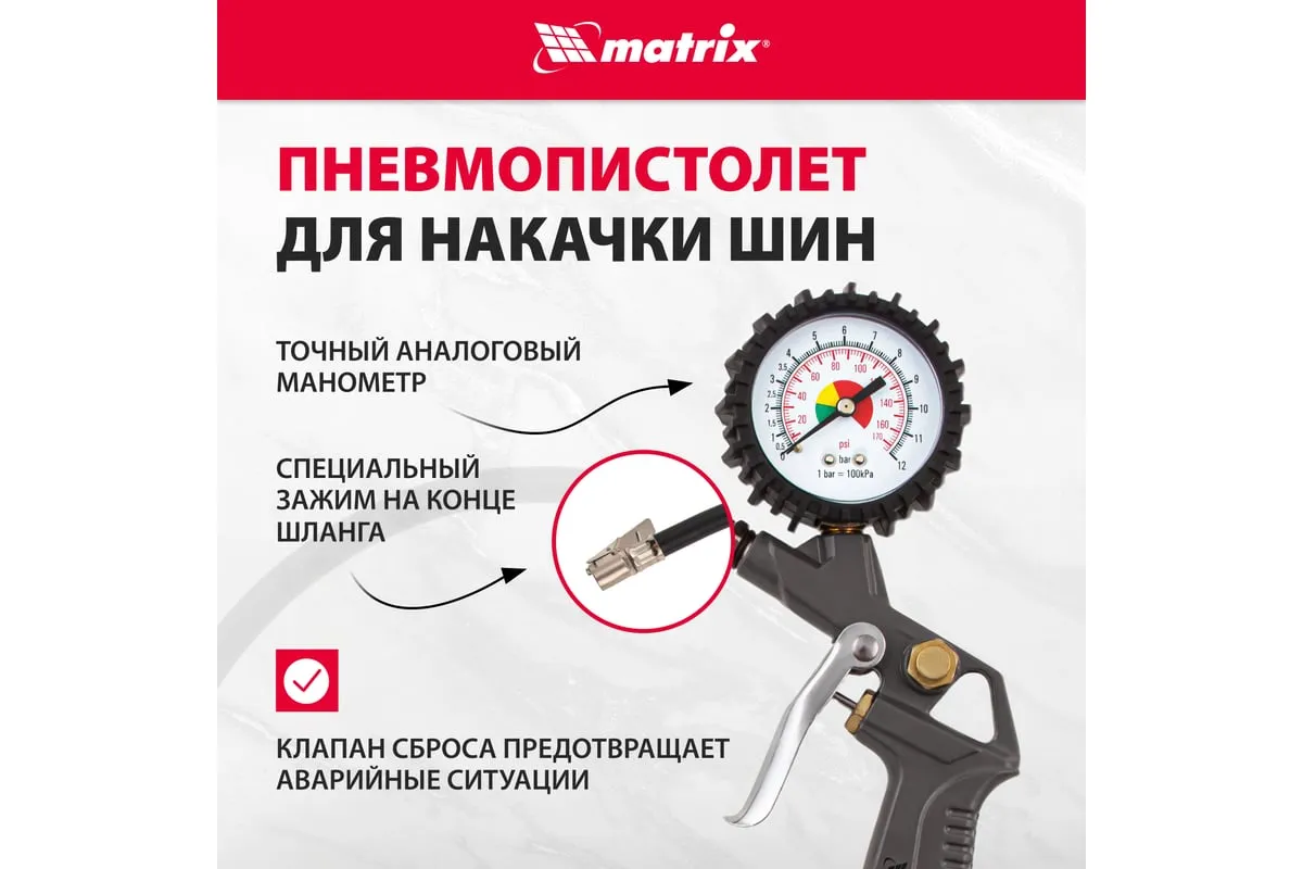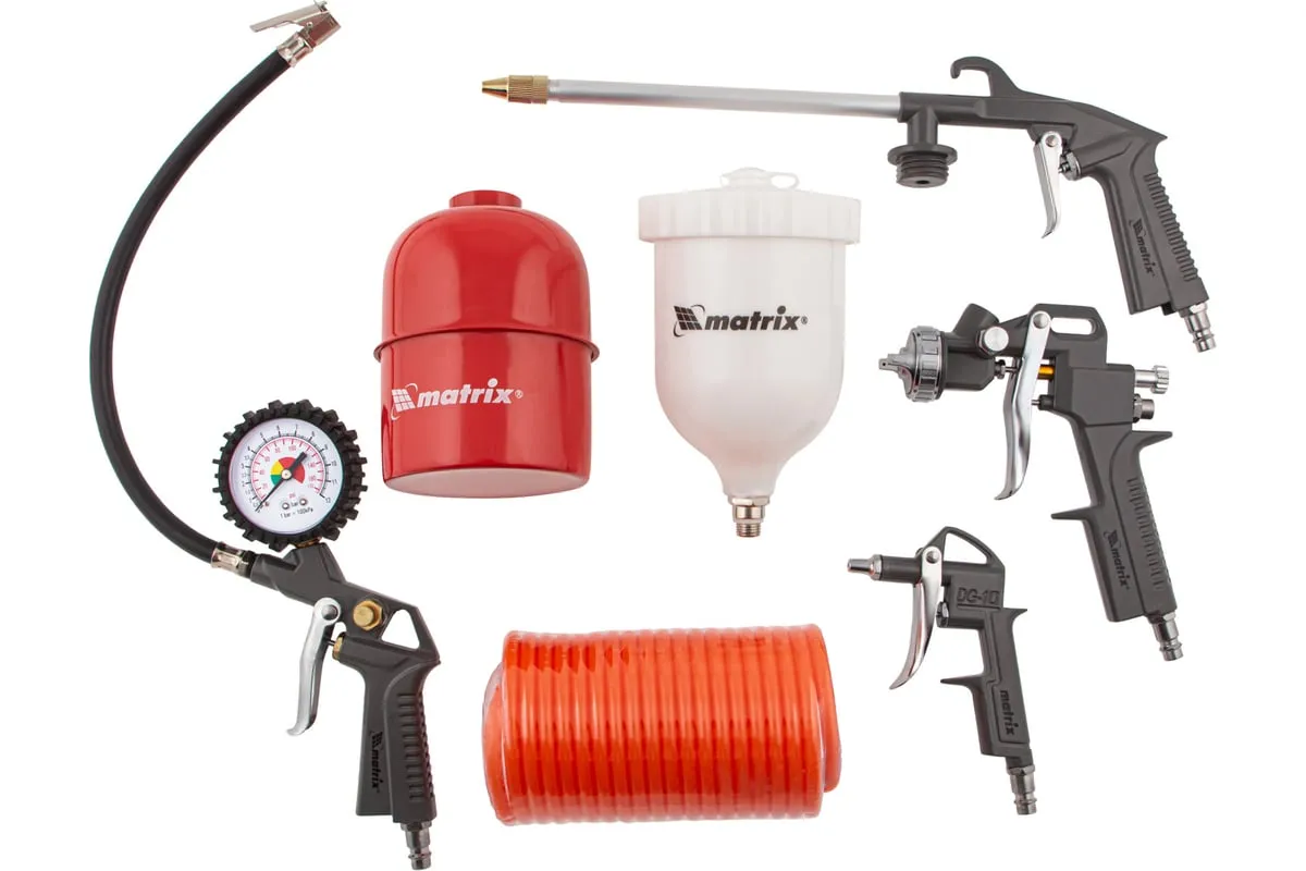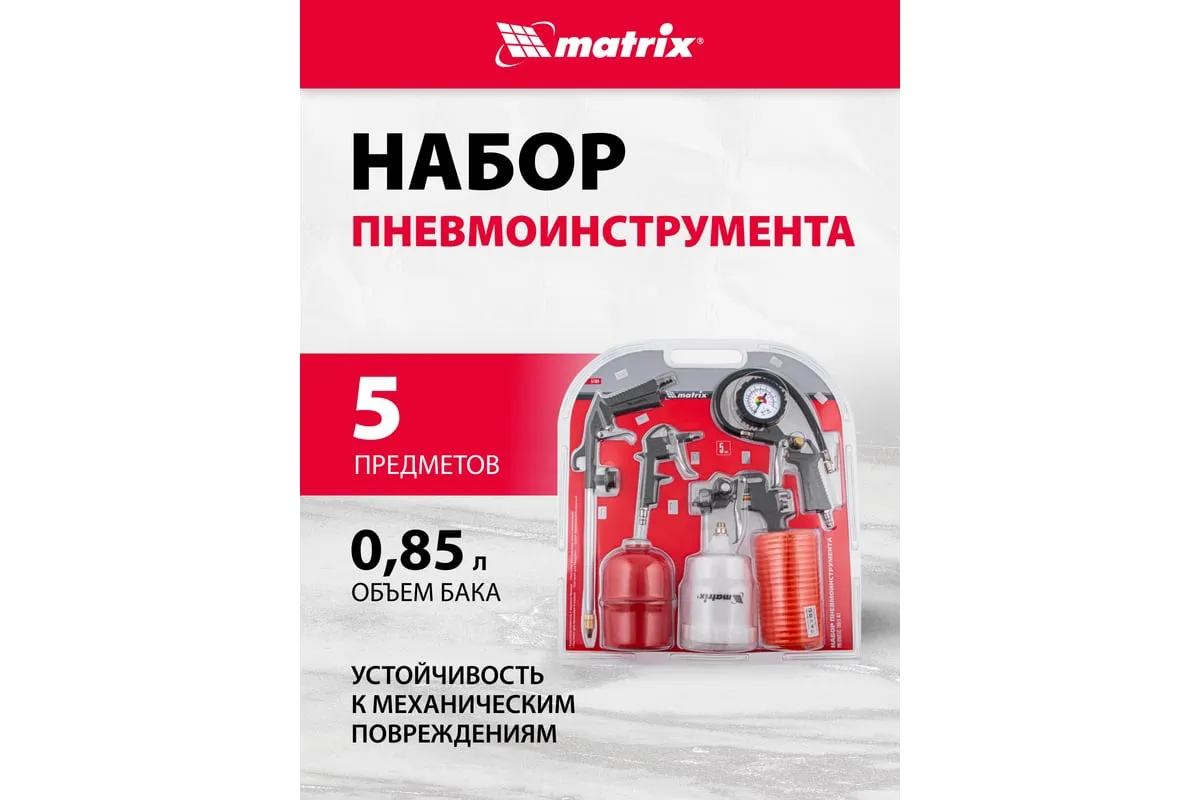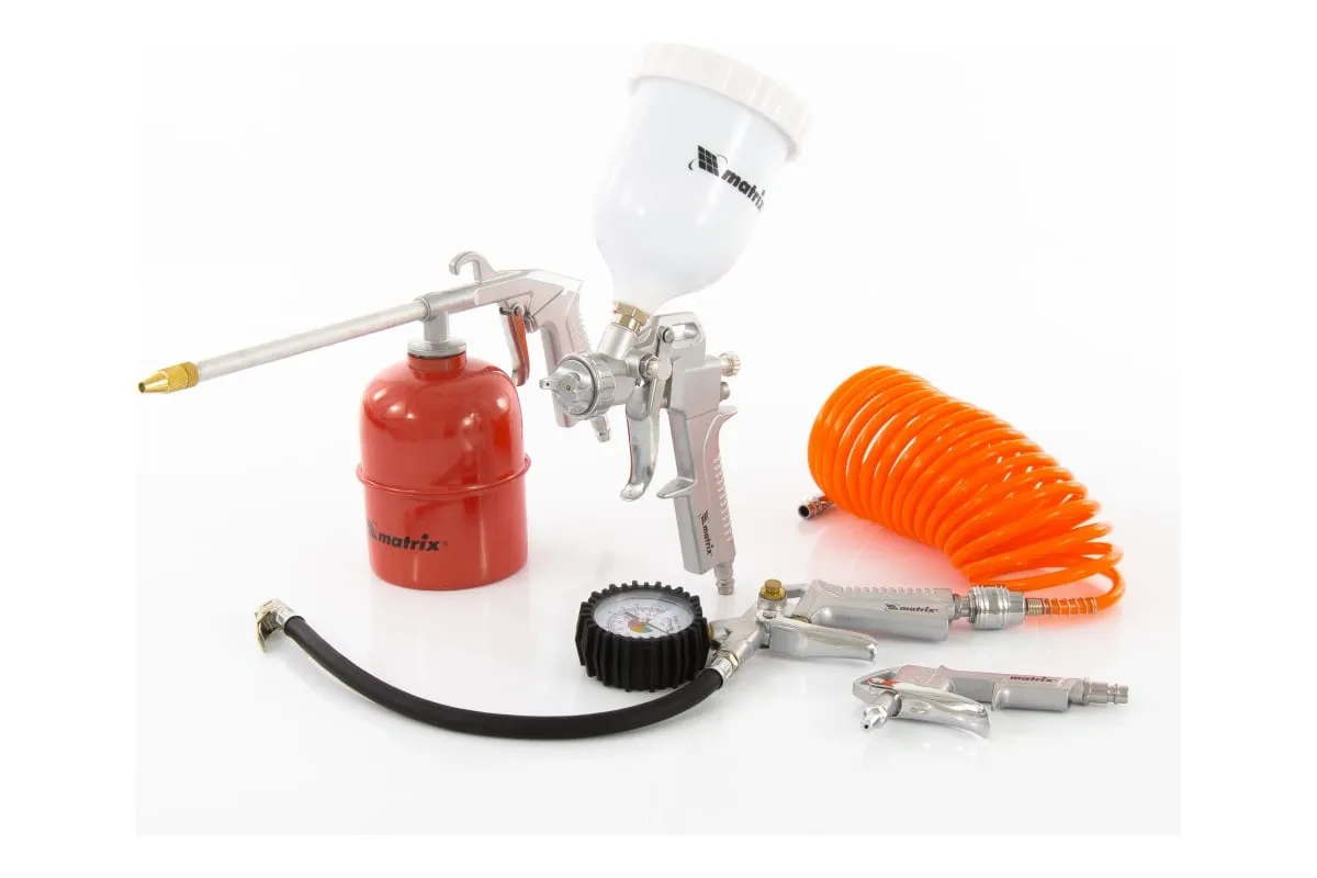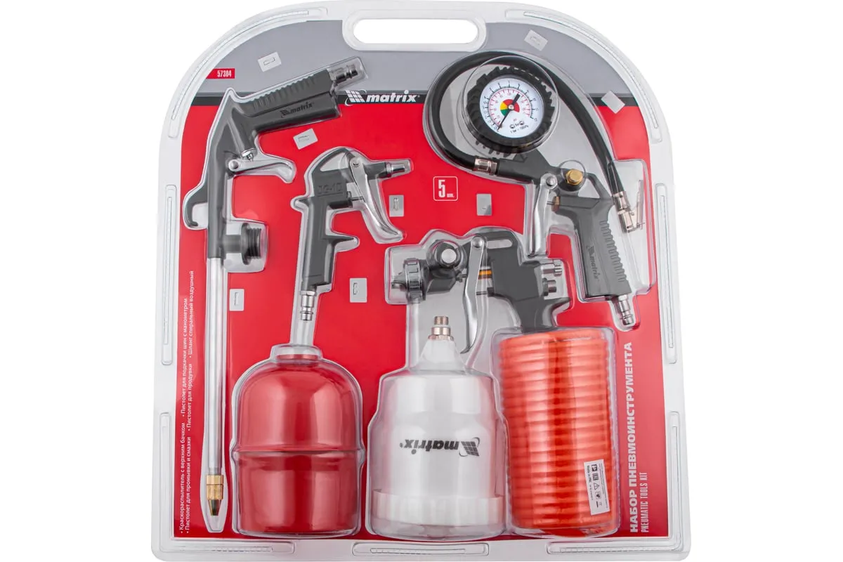 Набор пневмоинструмента MATRIX 57304 содержит 5 предметов. Он используется при покрасочных, промывочных и продувочных операциях, а также при подкачивании шин. Набор пригодится для работы в гараже, домашней мастерской, автосервисе, на мебельном производстве и при мелких посадочных работах. Подходит для всех видов пневматических компрессоров.