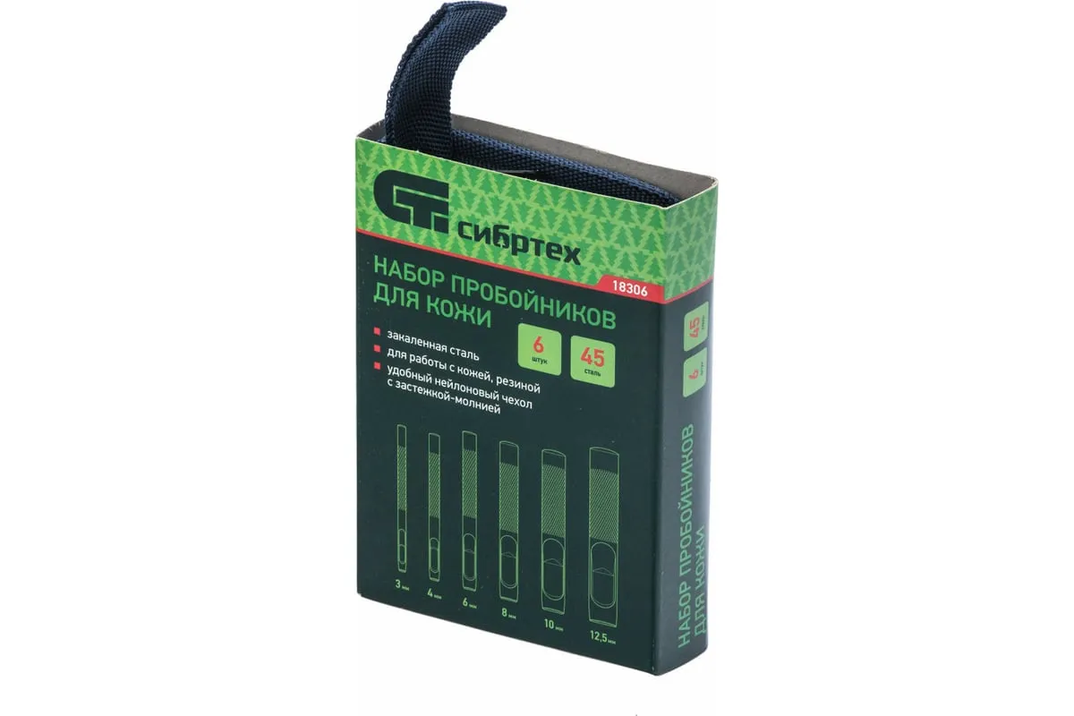 Набор пробойников для кожи СИБРТЕХ 18306 представляет собой комплект высококачественных стальных инструментов с рифленым корпусом, которые служат для выполнения круглых отверстий. Пробойники подходят для мягких листовых материалов. Используются совместно с ударным инструментом (например, молотком). Набор широко распространен для эксплуатации как в бытовых условиях, так и в профессиональной области. Каждый элемент имеет прецизионную заточку рабочих частей для более ровного и качественного реза. Для удобства хранения и переноски комплекта без риска утери компонентов предусмотрен удобный нейлоновый чехол на молнии.