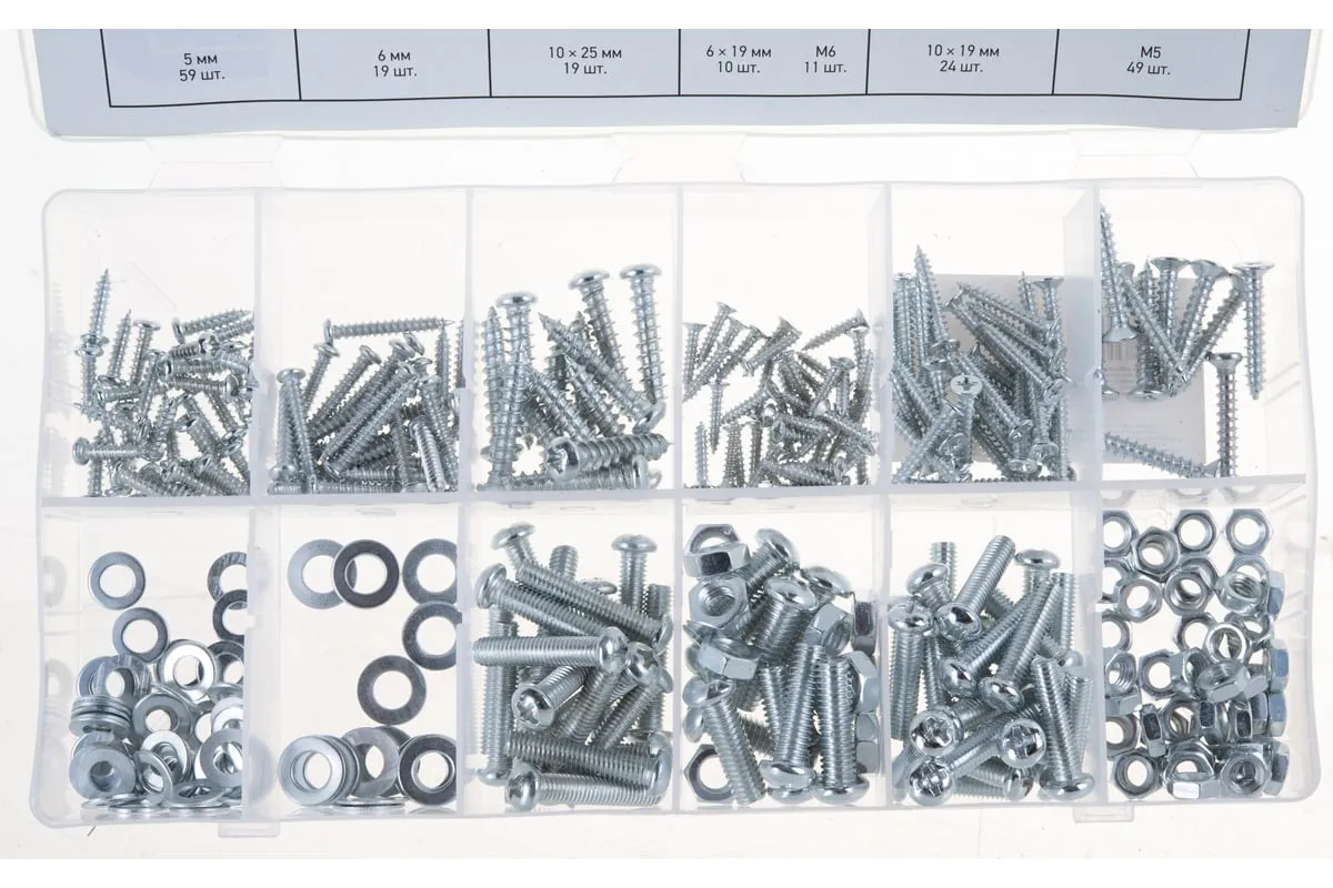 Набор саморезов, винтов, гаек, шайб СИБРТЕХ 347 предметов 47609 представляет собой комплект приспособлений, которые собираются вместе в крепежное соединение для монтажа различных конструкций. Крепеж изготовлен из стали. Пластиковый кейс обеспечивает компактное хранение комплекта.
