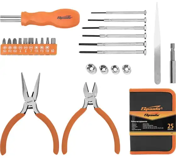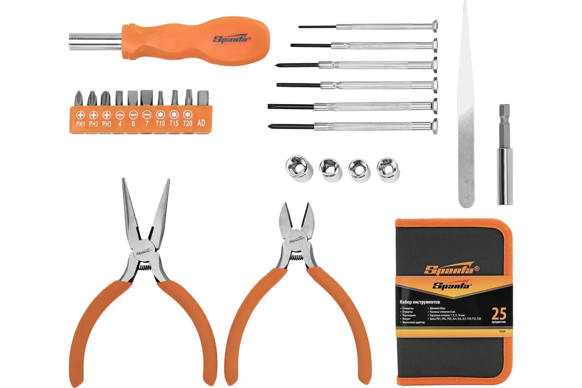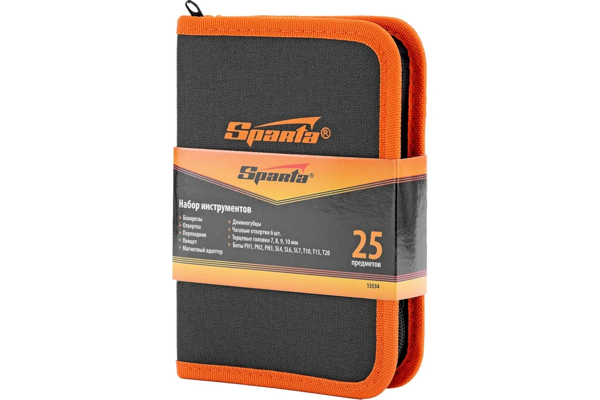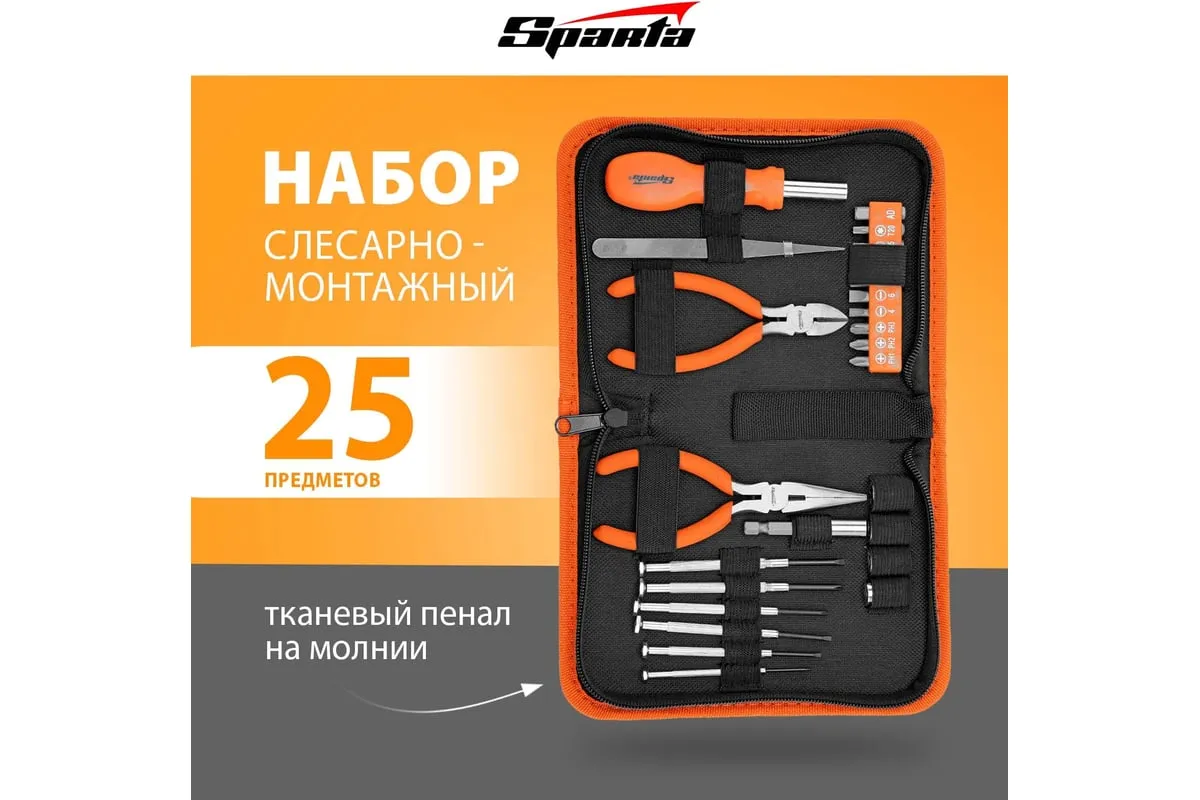 Набор слесарно-монтажного инструмента SPARTA 25 шт 13534 является многофункциональным комплектом для проведения различных столярных работ, включая ремонт и обслуживание резьбовых соединений. Все рабочие элементы набора изготовлены из высококачественной стали. Рукоятки инструментов выполнены из пластика, который обеспечивает надежное удержание. Комплект поставляется в пенале на молнии.