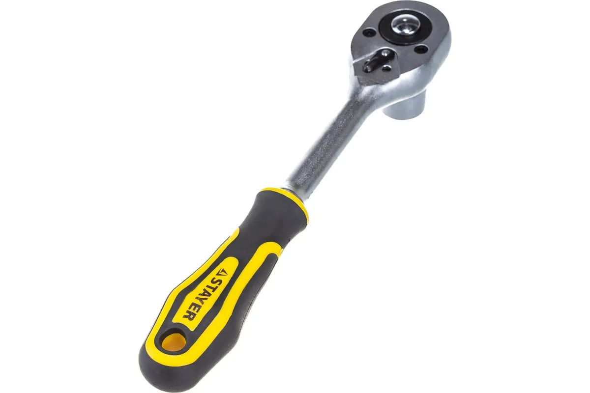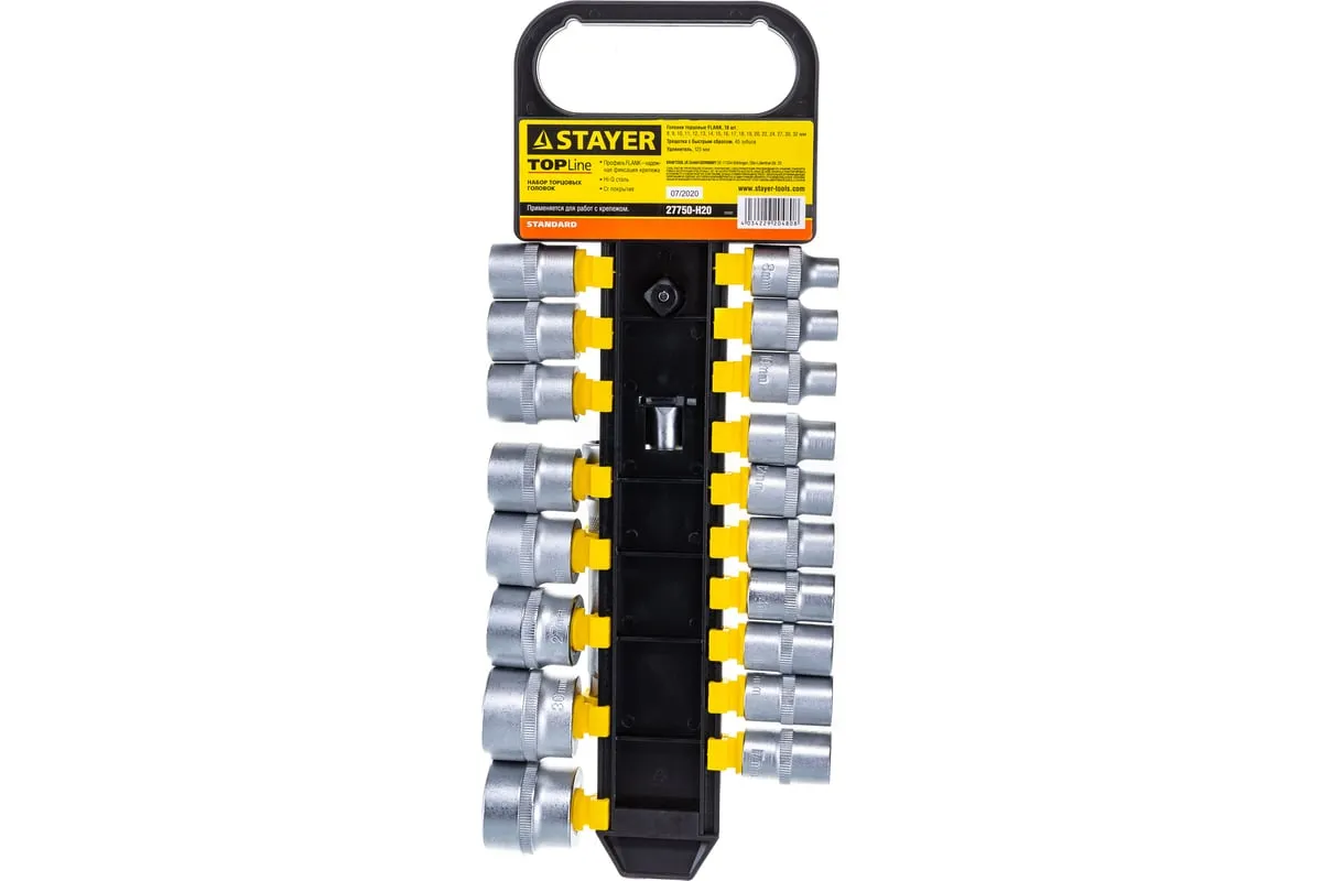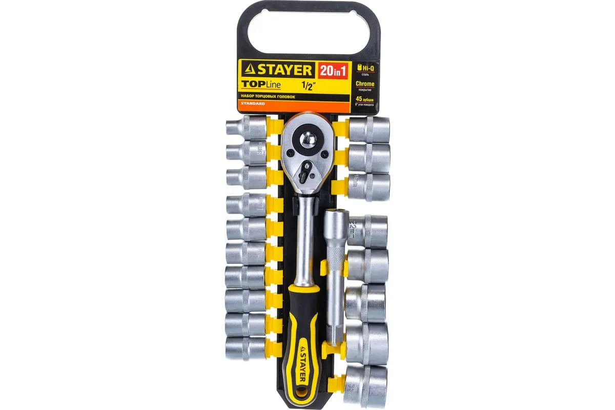 Набор STAYER STANDARD 1/2", 20 предметов 27750-H20 используется при выполнении различных ремонтных и монтажных работ. Он включает в себя торцовые головки размером от 8 до 32 мм, трещотку с 45 зубьями и удлинитель. Головки изготовлены из закаленной инструментальной стали, благодаря чему обладают высокой прочностью и твердостью. Хромированное покрытие обеспечивает защиту от коррозии. Двухкомпонентная рукоятка трещотки не скользит в руке и позволяет работать с комфортом.