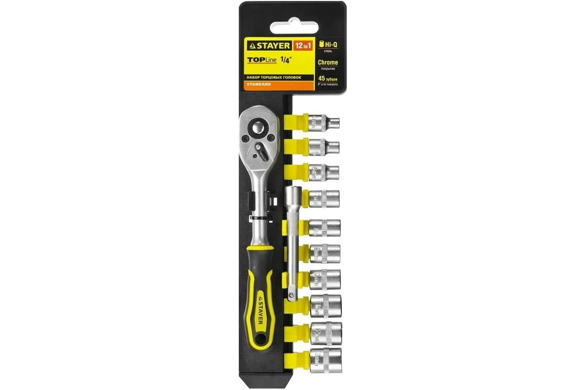 Набор STAYER STANDARD 1/4", 12 предметов 27754-H12 подходит для использования в автомастерской. Он включает в себя торцовые головки, трещотку и удлинитель, предназначенные для выполнения широкого спектра работ. Торцовые головки из закаленной инструментальной стали обладают высокой прочностью и долгим сроком службы. Инструменты имеют хромированное покрытие, благодаря которому они надежно защищены от коррозии.