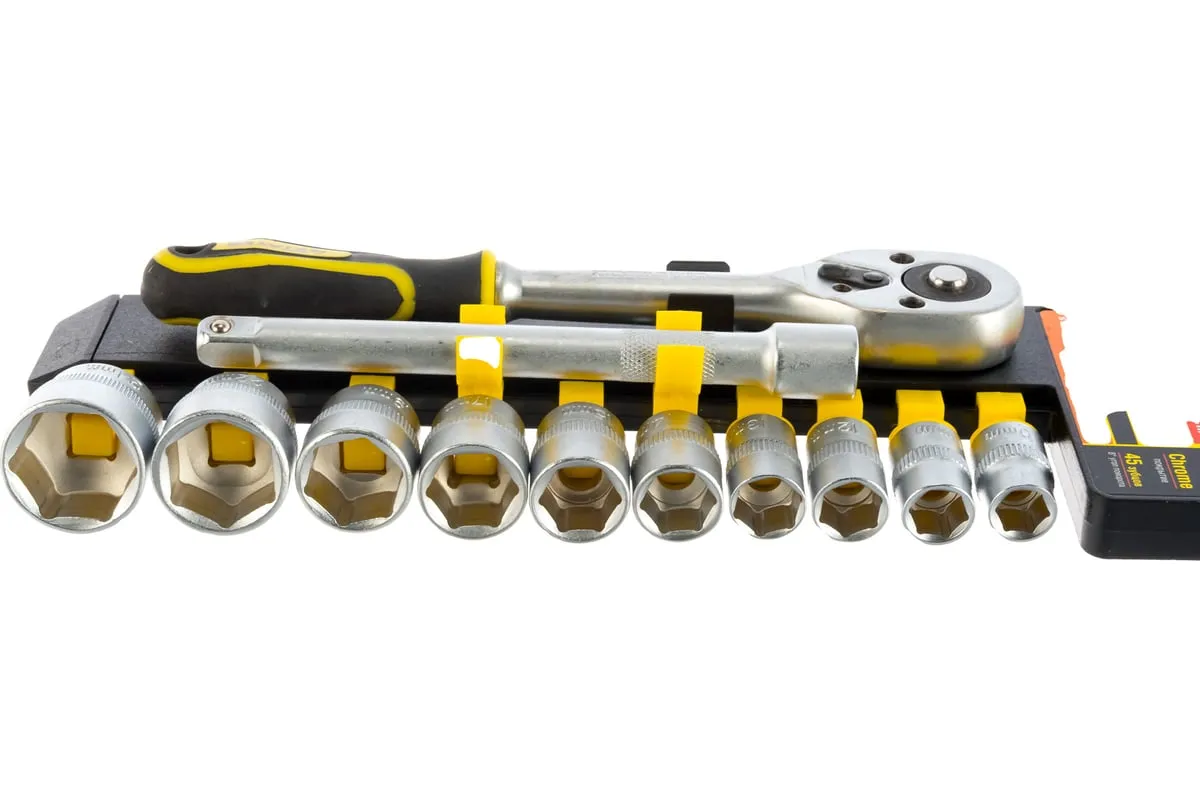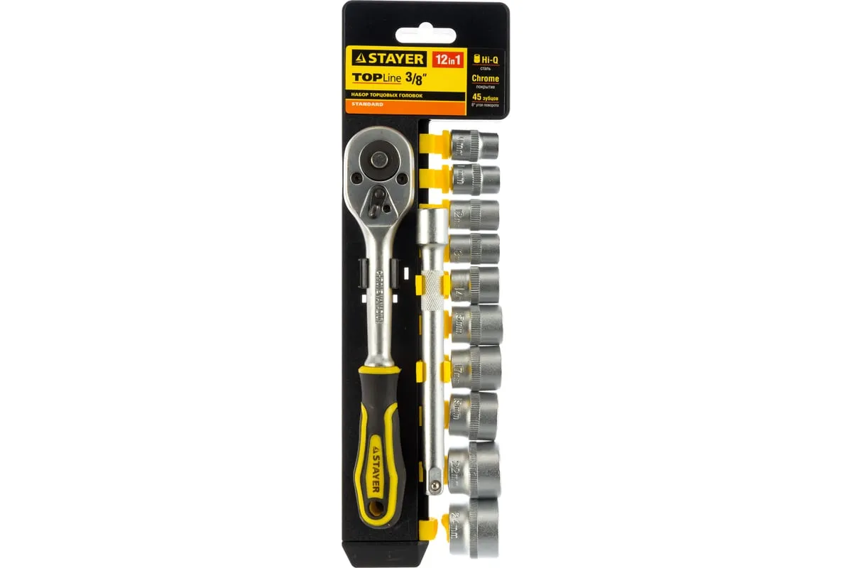 Набор STAYER STANDARD 3/8", 12 предметов 27752-H12 прост и удобен в обращении. Он используется в автомастерских для ремонта и обслуживания автомобилей. Все инструменты обладают высокой прочностью и долговечностью благодаря закаленной инструментальной стали. Хромированное покрытие надежно защищает их от коррозии и увеличивает рабочий ресурс.