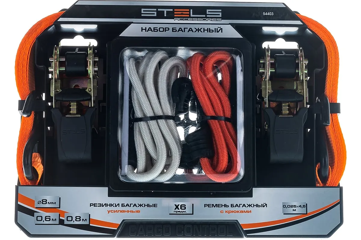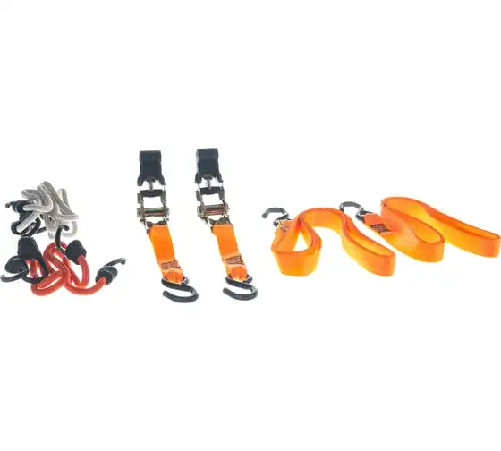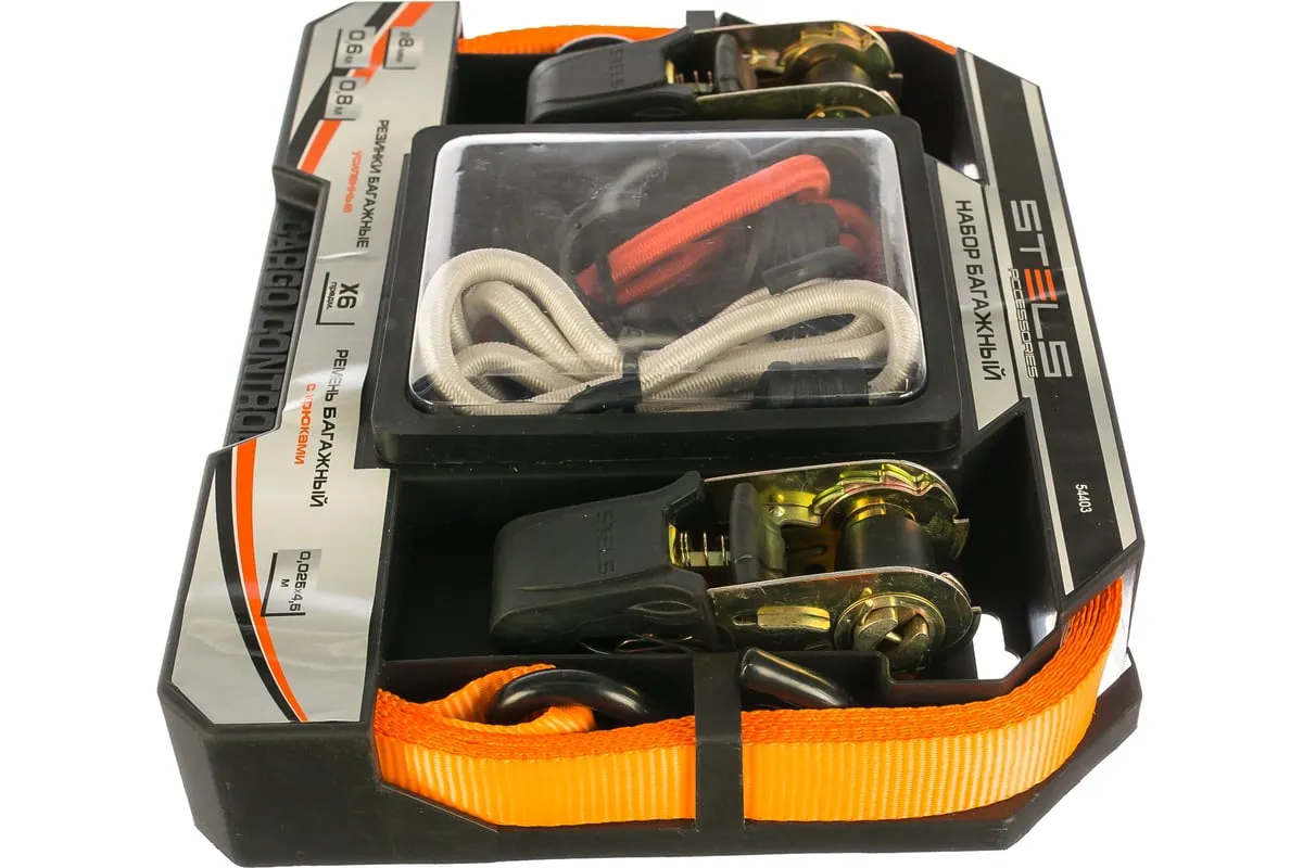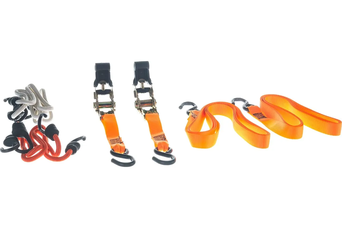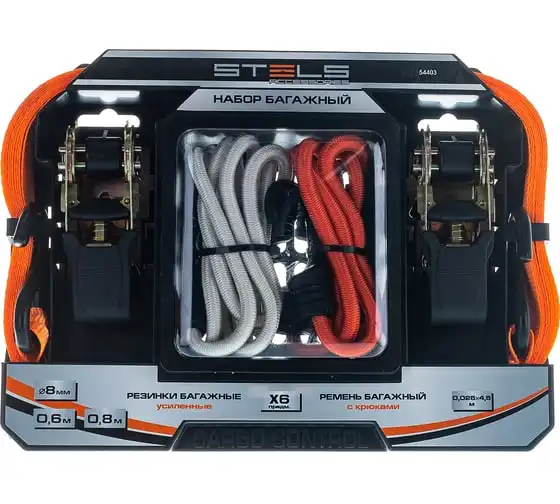 Набор стяжек и резинок Stels 54403 используется для фиксации грузов и будет полезен в автопутешествии. В комплекте ремни с храповыми механизмами, а также резинки разной длины с крюками. Разрывная нагрузка ремней составляет 680 кг, а эластичных стяжек — 50 кг, поэтому они надежно фиксируют предметы различных габаритов, предотвращая их смещение во время перевозки.