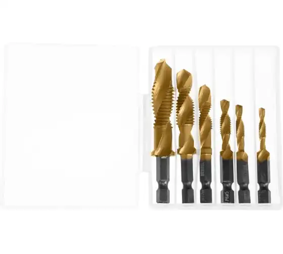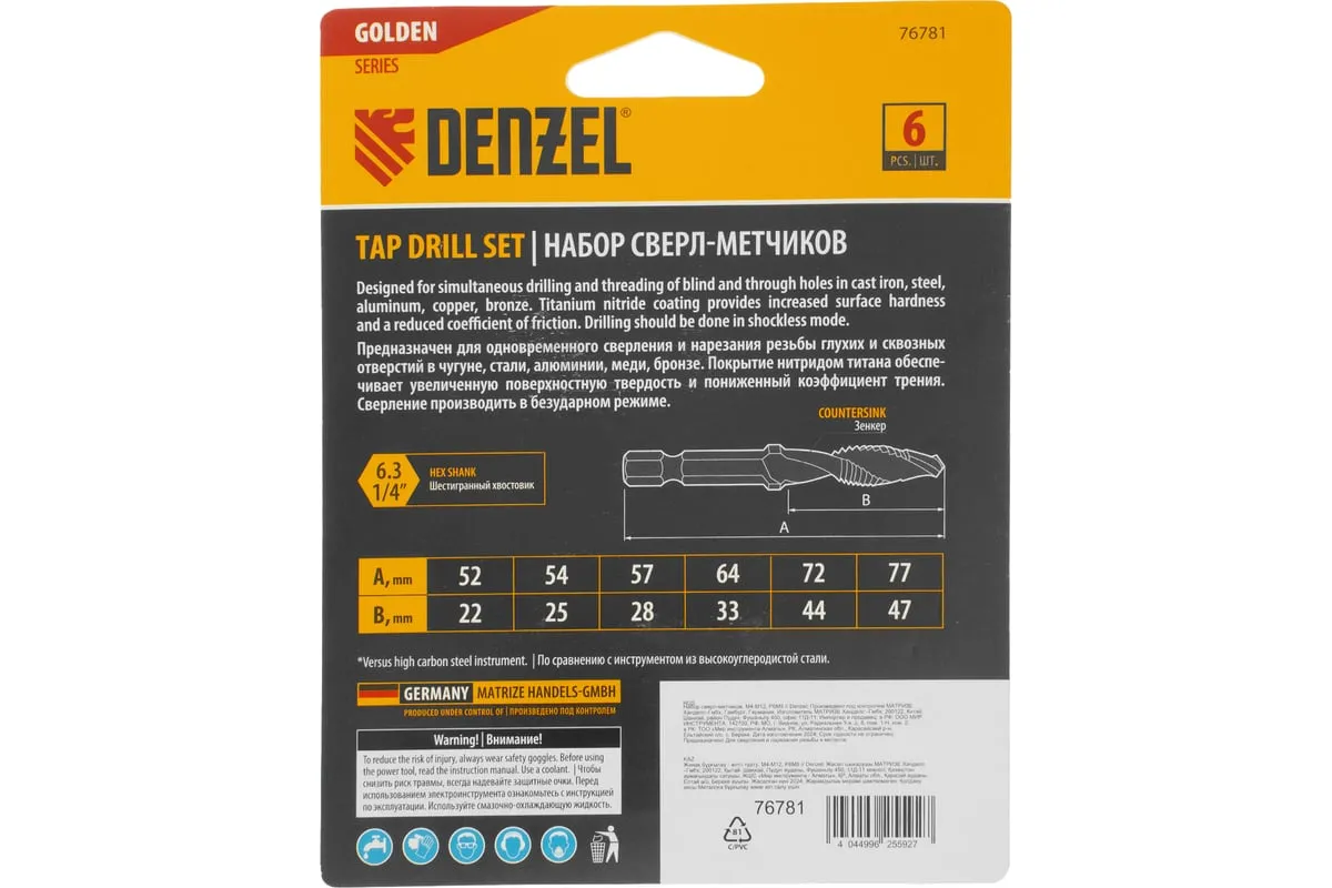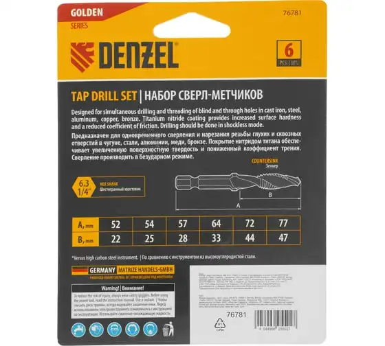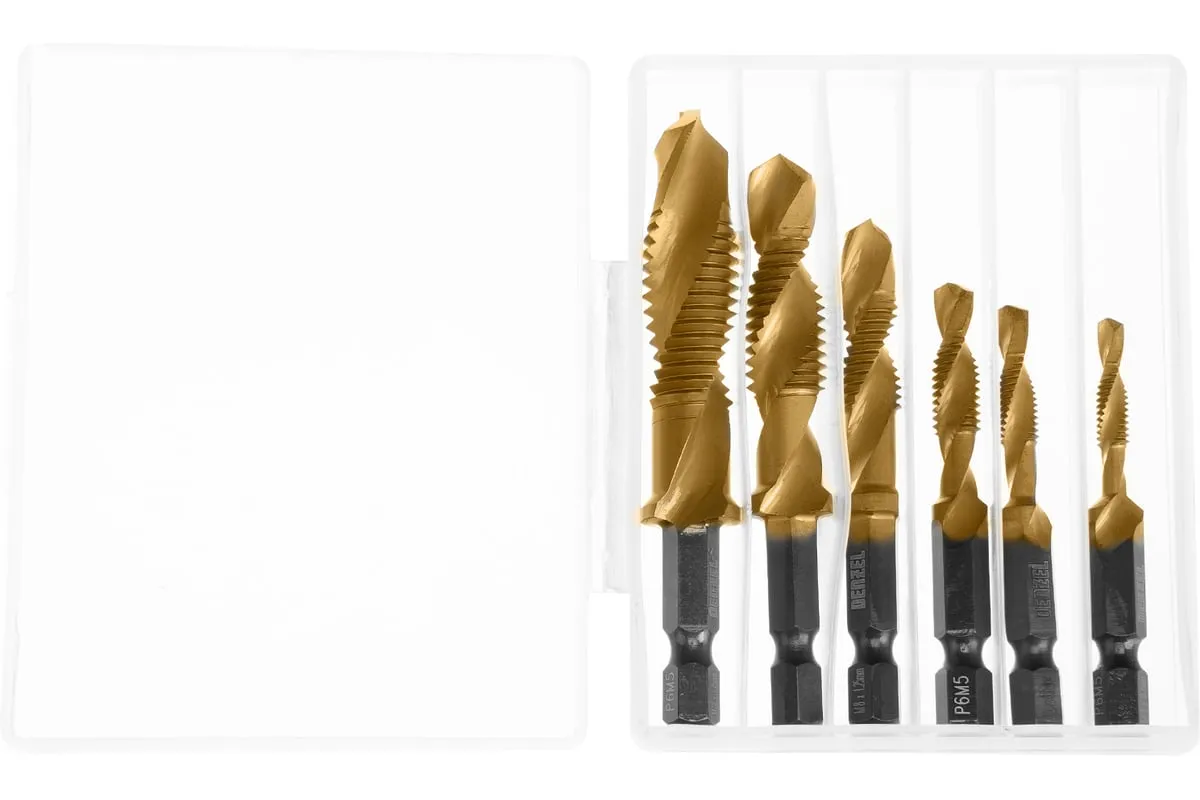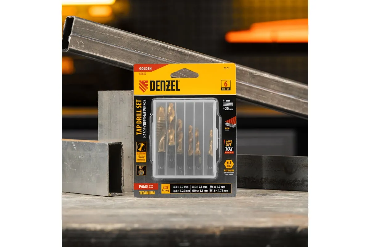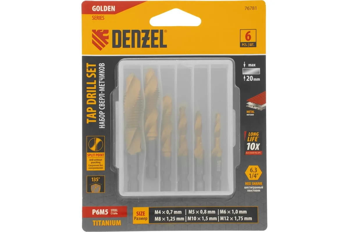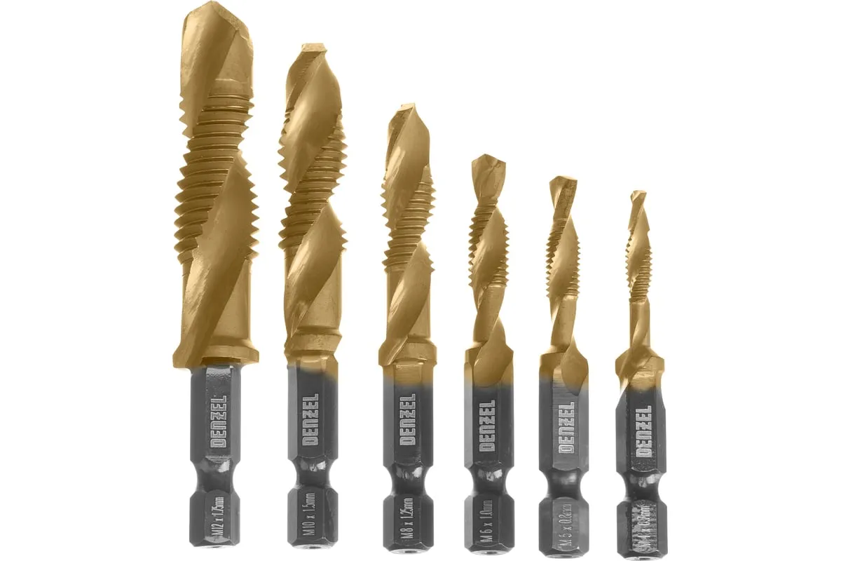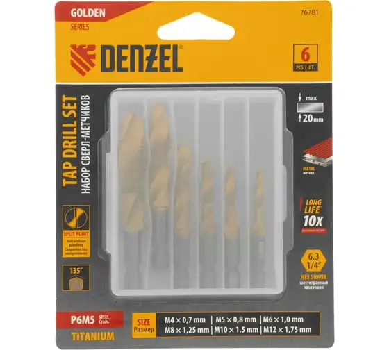 Набор сверл-метчиков Denzel 76781 состоит из 6 предметов, изготовленных из стали P6M5, и позволяет сверлить глухие и сквозные отверстия в чугуне, стали, алюминии, меди, бронзе с одновременным нарезанием правой метрической резьбы размером M4-M12 с шагом 0,7-1,75 мм.