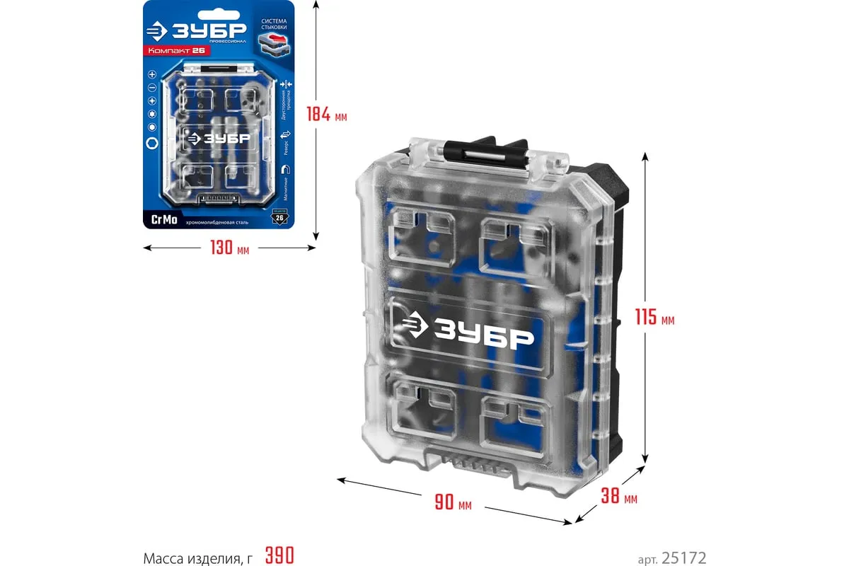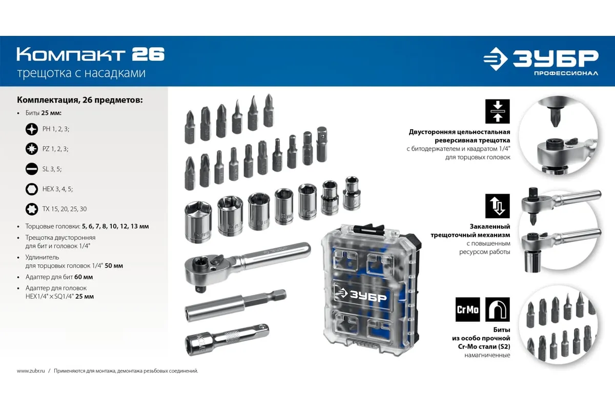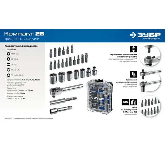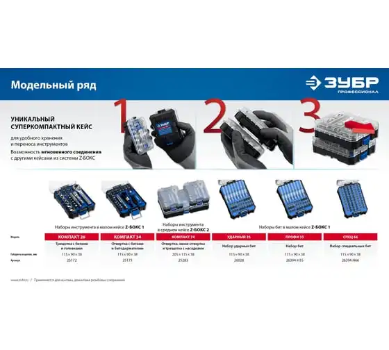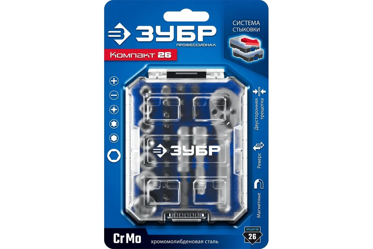 Компактный профессиональный набор с отверткой и набором насадок. Уникальный кейс легко соединяется с другими кейсами из этой системы что обеспечивает удобное хранение и транспортировку инструментов. Уникальный кейс обеспечивает удобное хранение и перенос инструментов, благодаря возможности легкого соединения с другими кейсами из нашей системы Двухсторонняя реверсивная трещотка с битодержателем и квадратом 1/4" для торцевых головок Металлический трещоточный механизм обеспечивает долгий срок службы Магнитные биты из особо прочной Cr-Mo стали