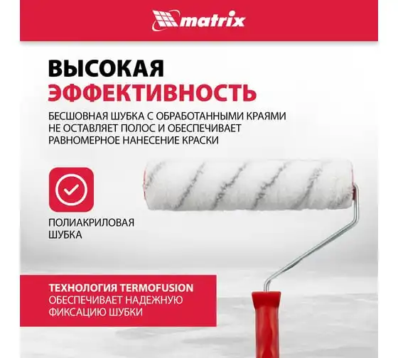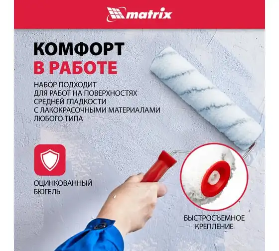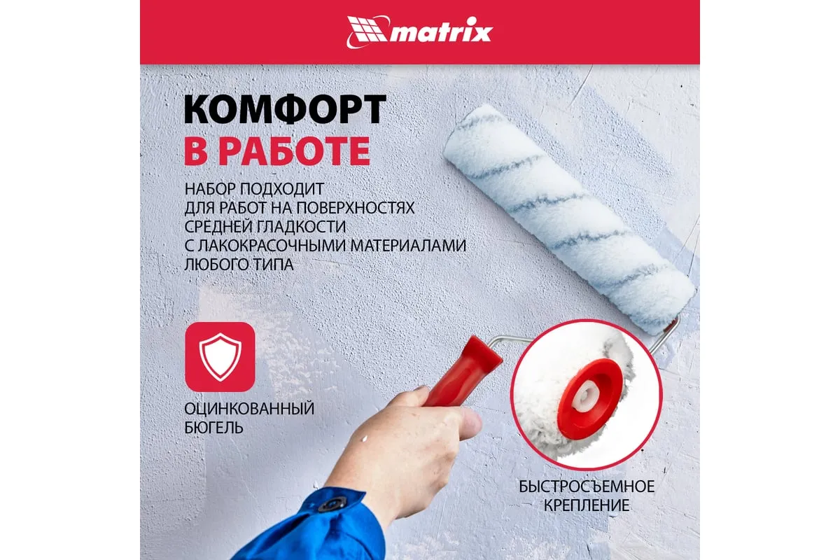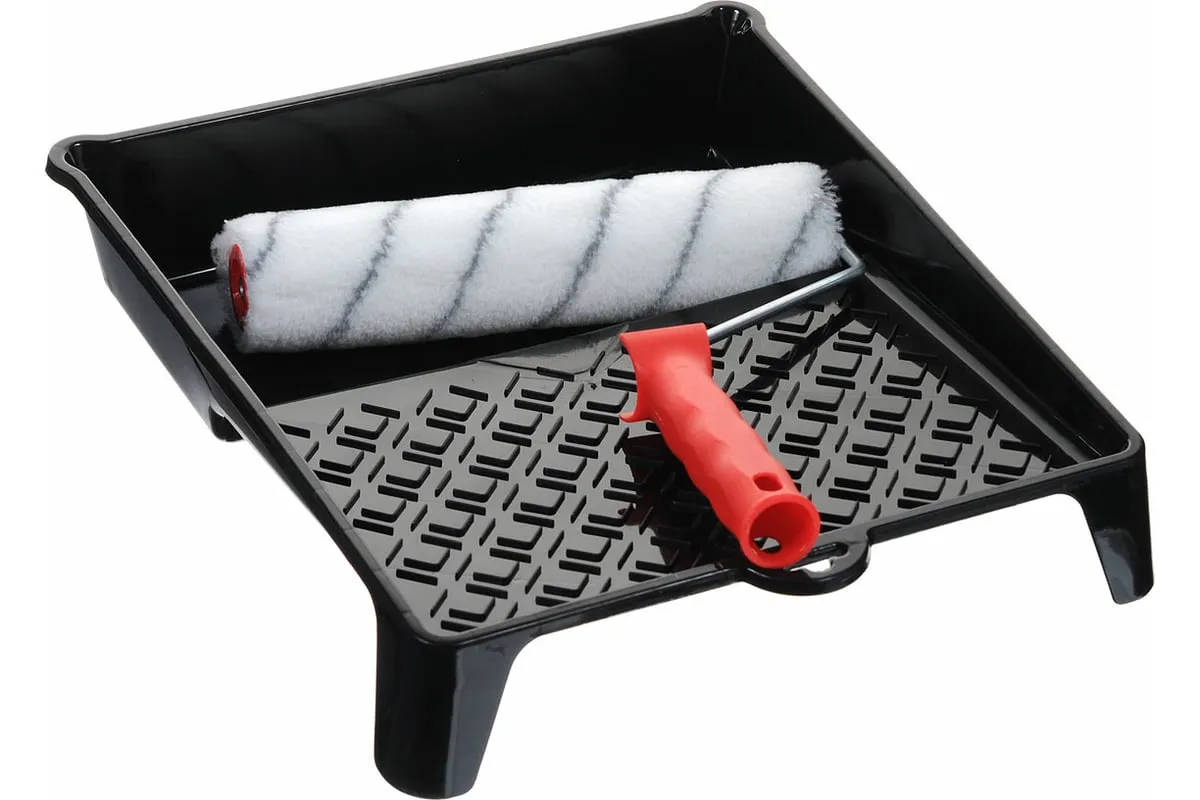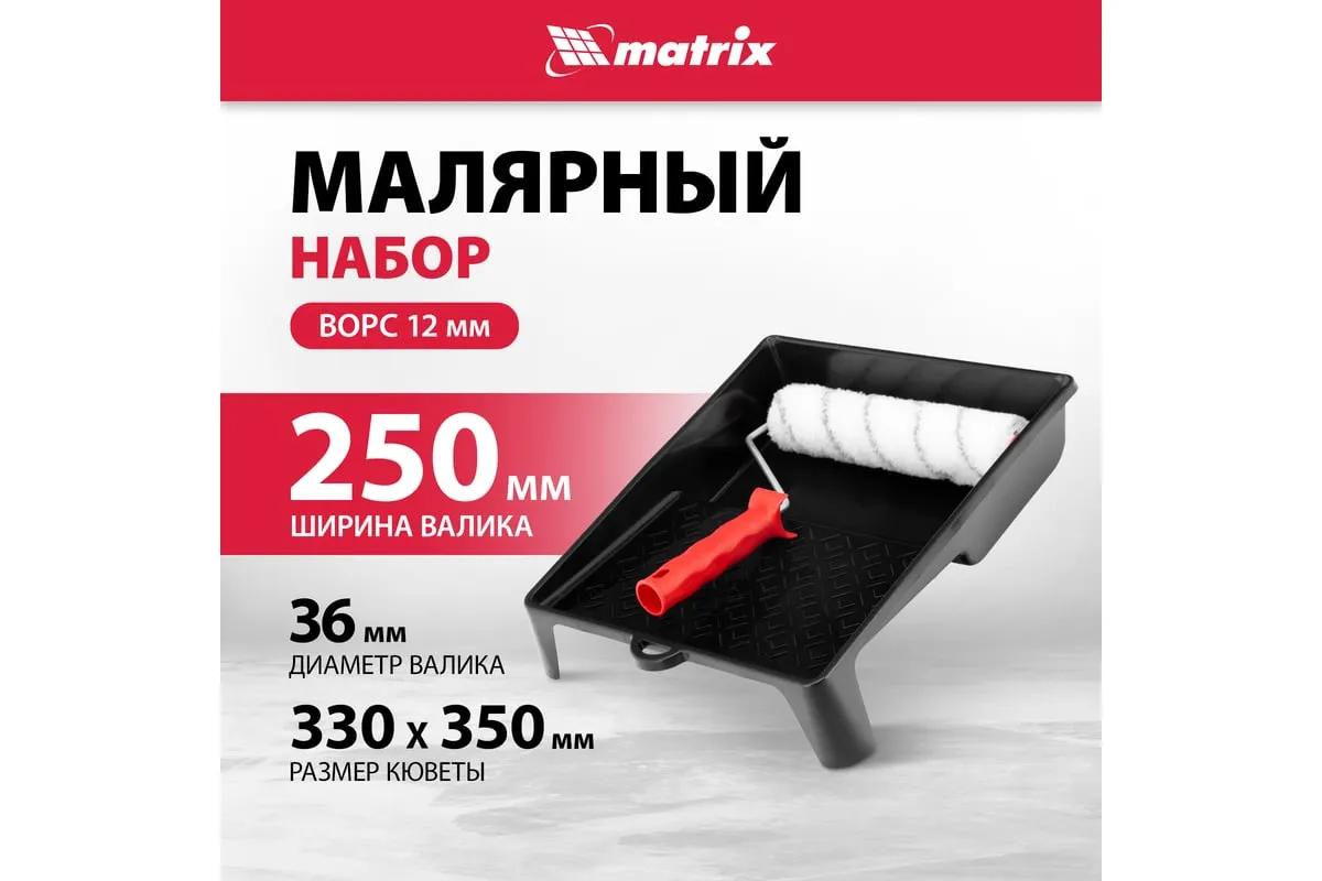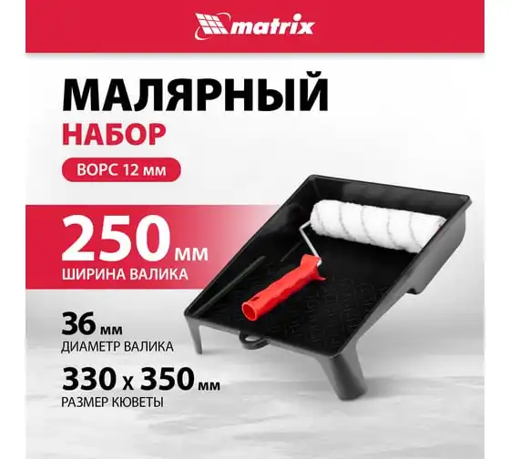 Набор Matrix 84405 включает валик «Грейтекс» размером 250 х 36 мм, с ворсом 12 мм из полиакрила, и кювету размером 330 х 350 мм. Кювета подходит для валиков шириной 250 мм, позволяет набирать и равномерно распределять краску. Шубка из полиакрила подходит для малярных работ на средне-гладких поверхностях с ЛКМ любого типа, в том числе содержащими растворители.