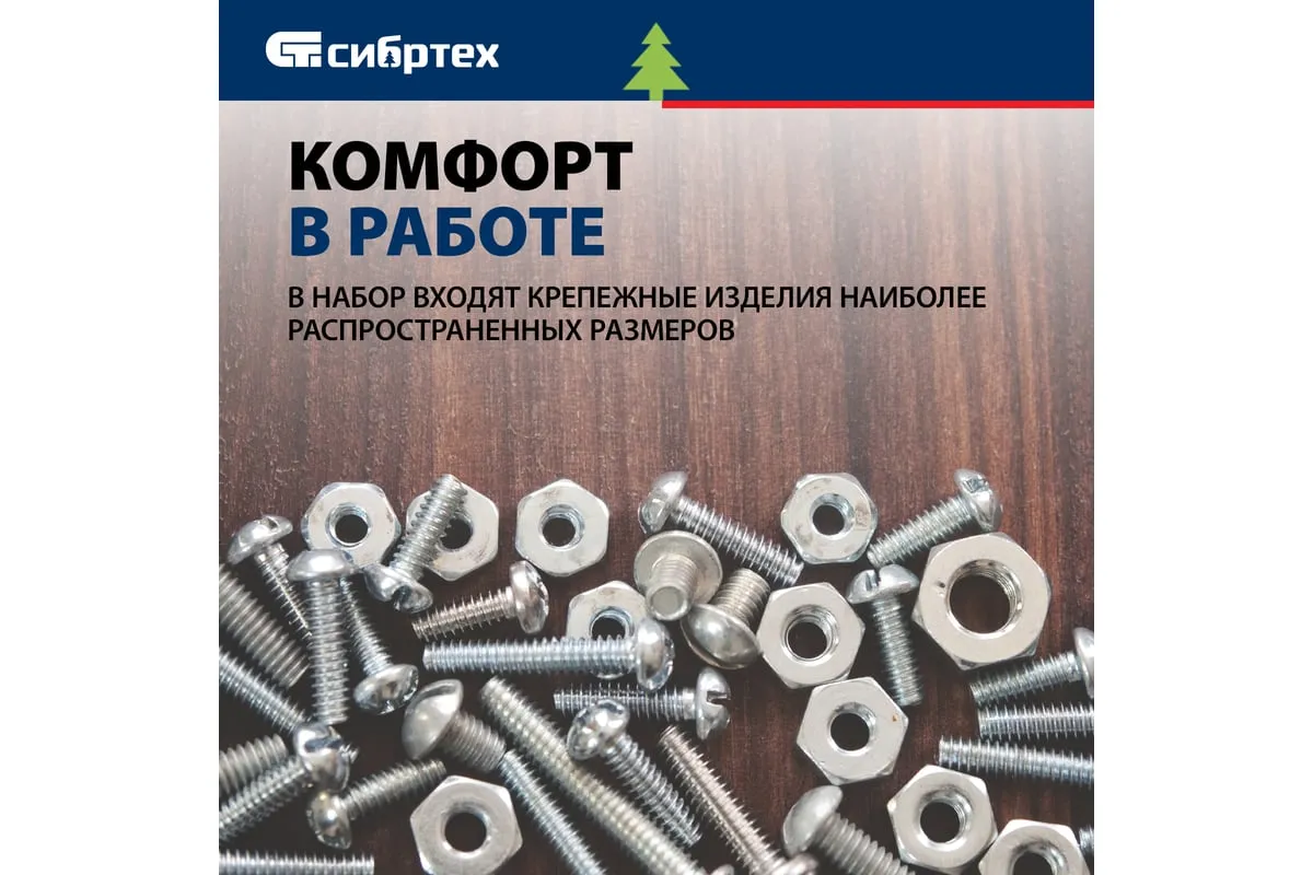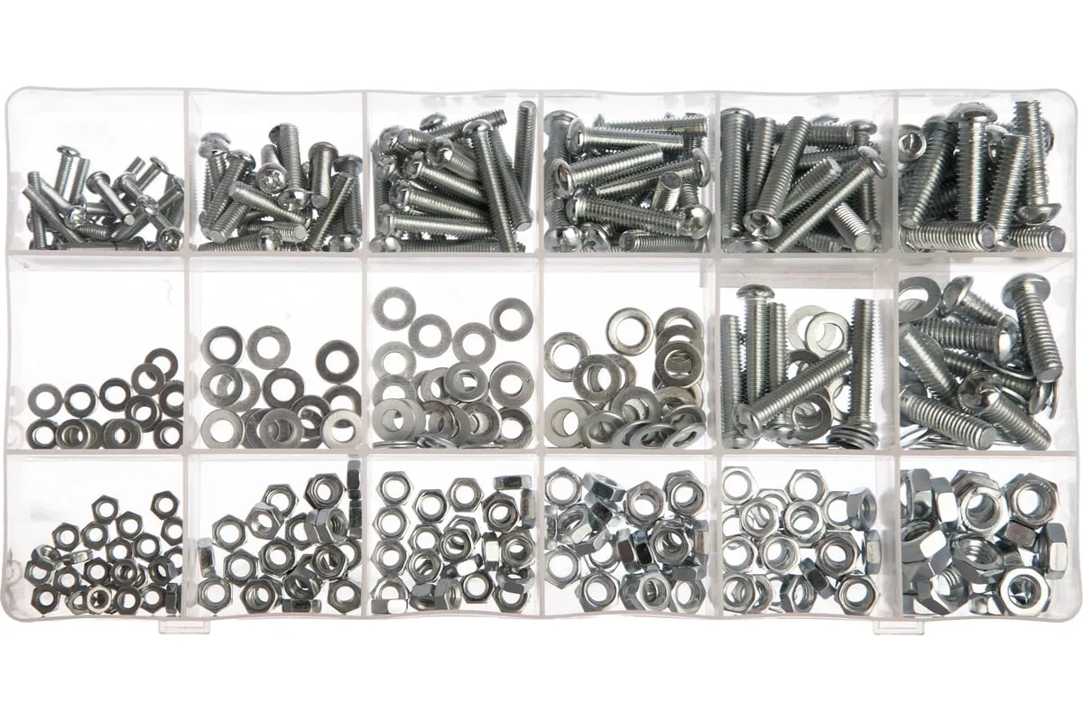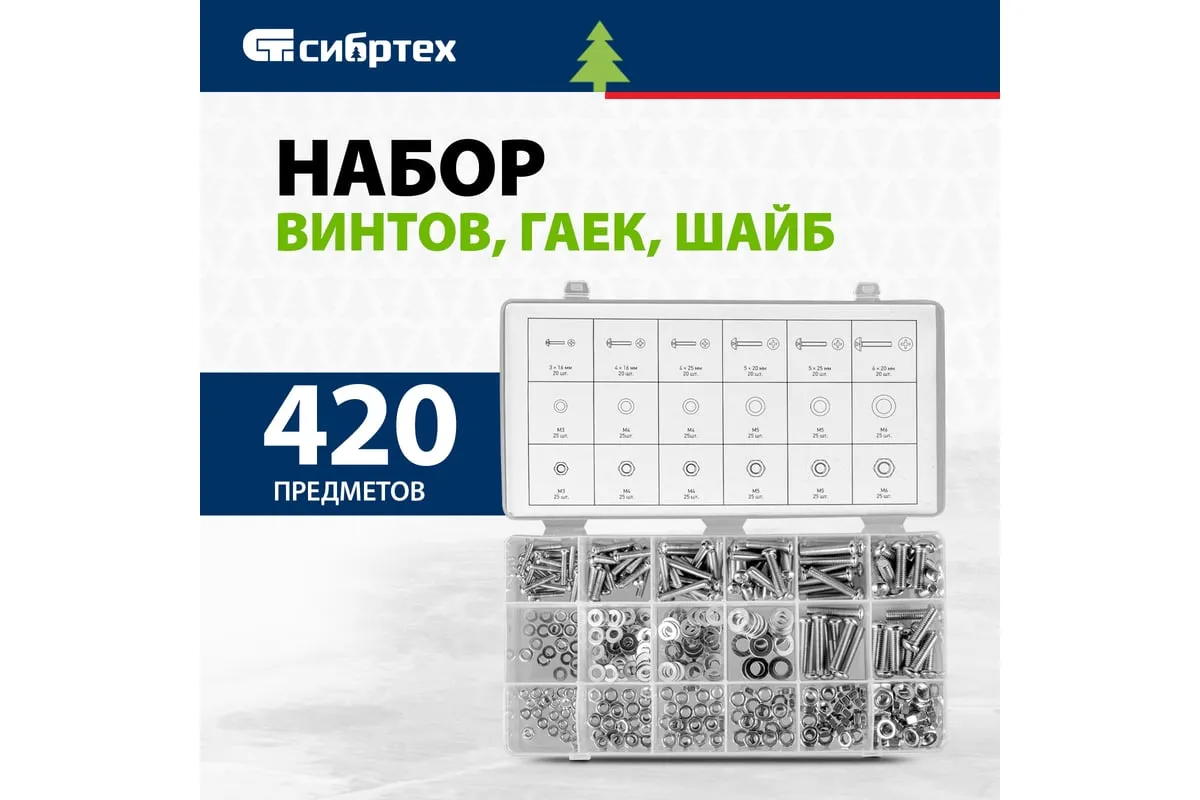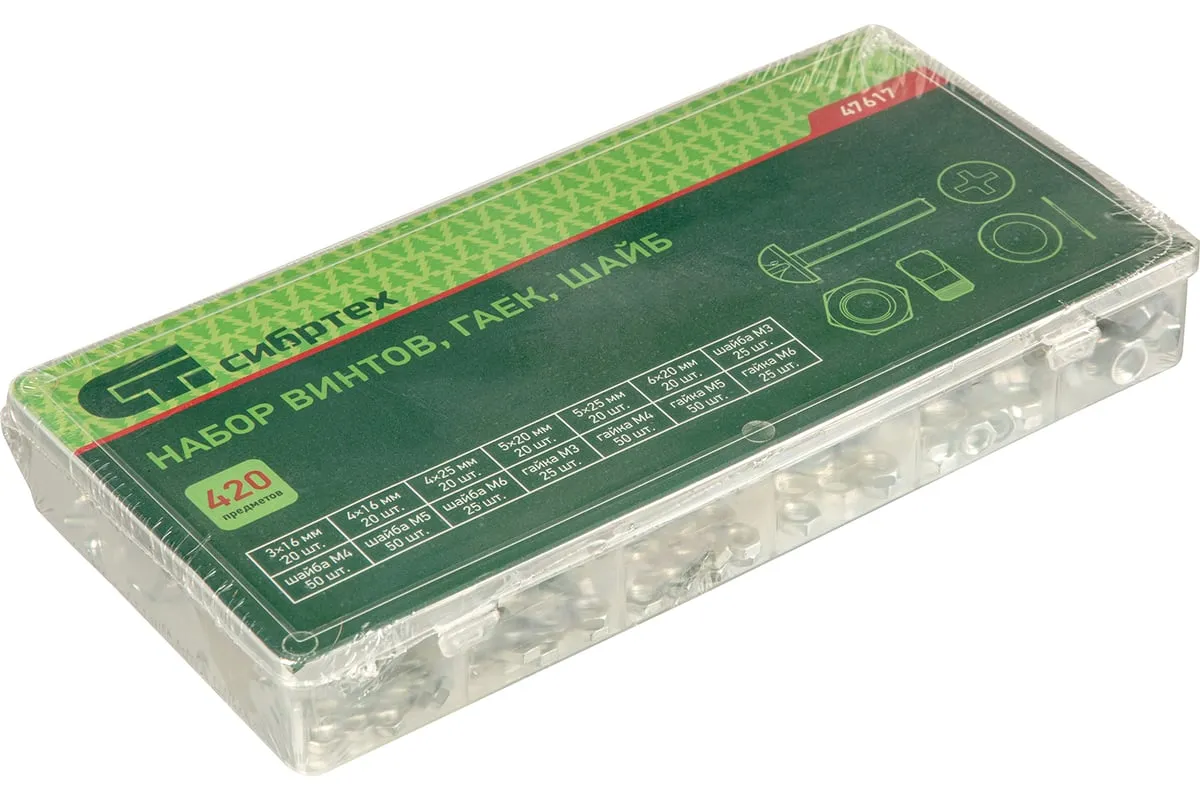 Набор винтов, гаек, шайб СИБРТЕХ 420 предметов 47617 подойдет для использования в быту. В комплект входят самые популярные размеры гаек, винтов и шайб, которые образуют между собой соединение для монтажа конструкций. Все предметы выполнены из стали. Комплект поставляется в удобном кейсе с отсеками.