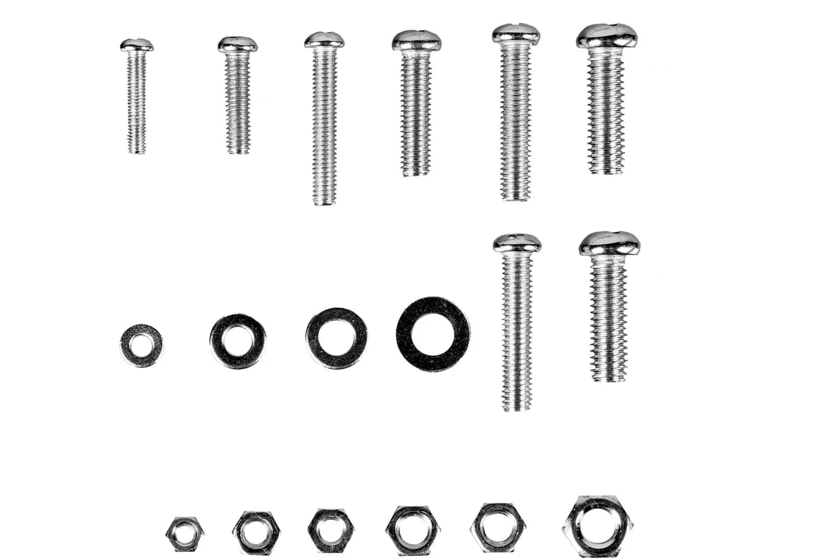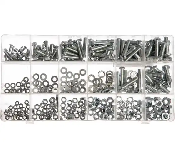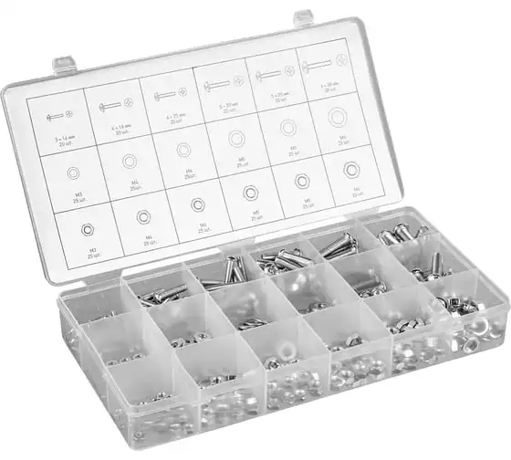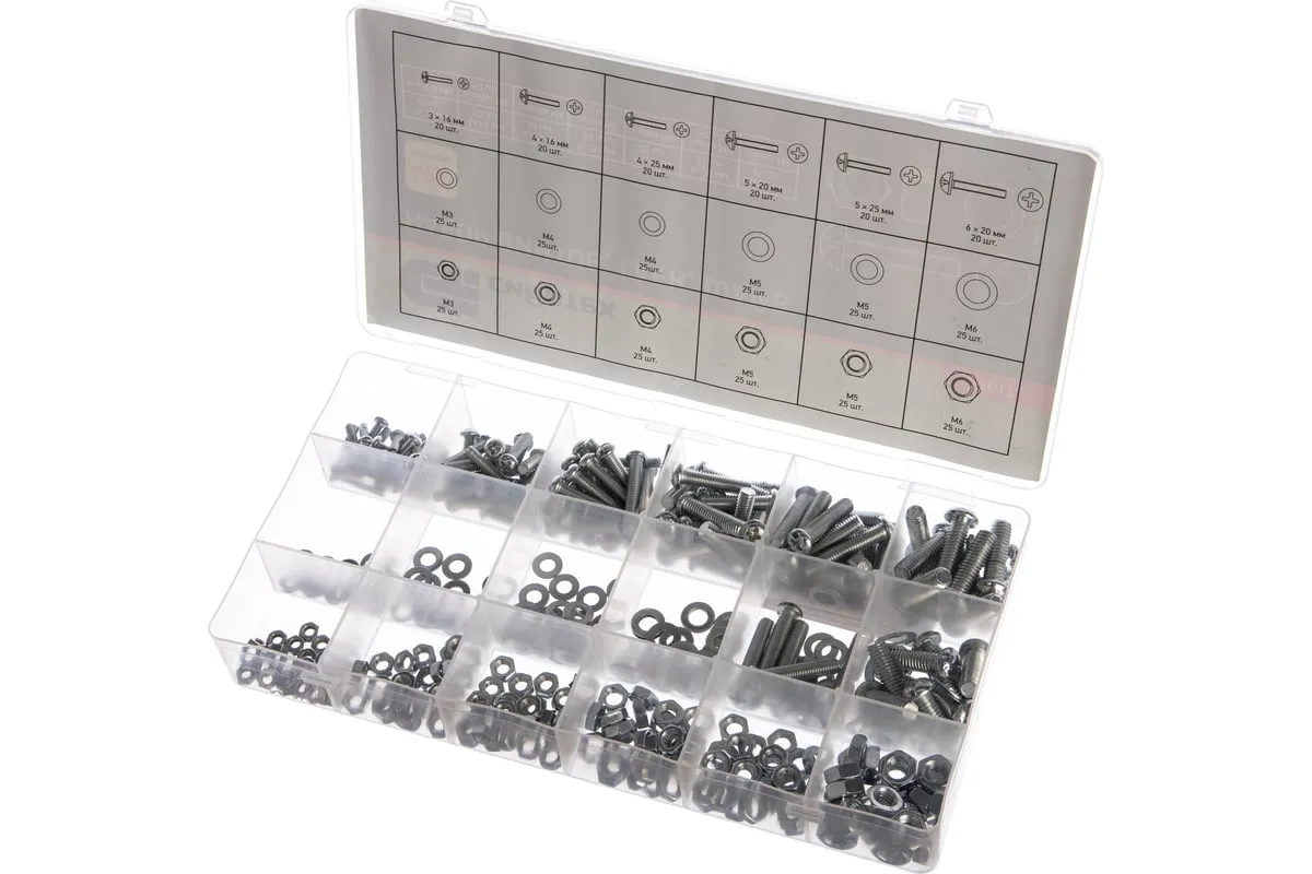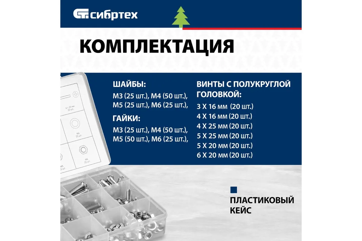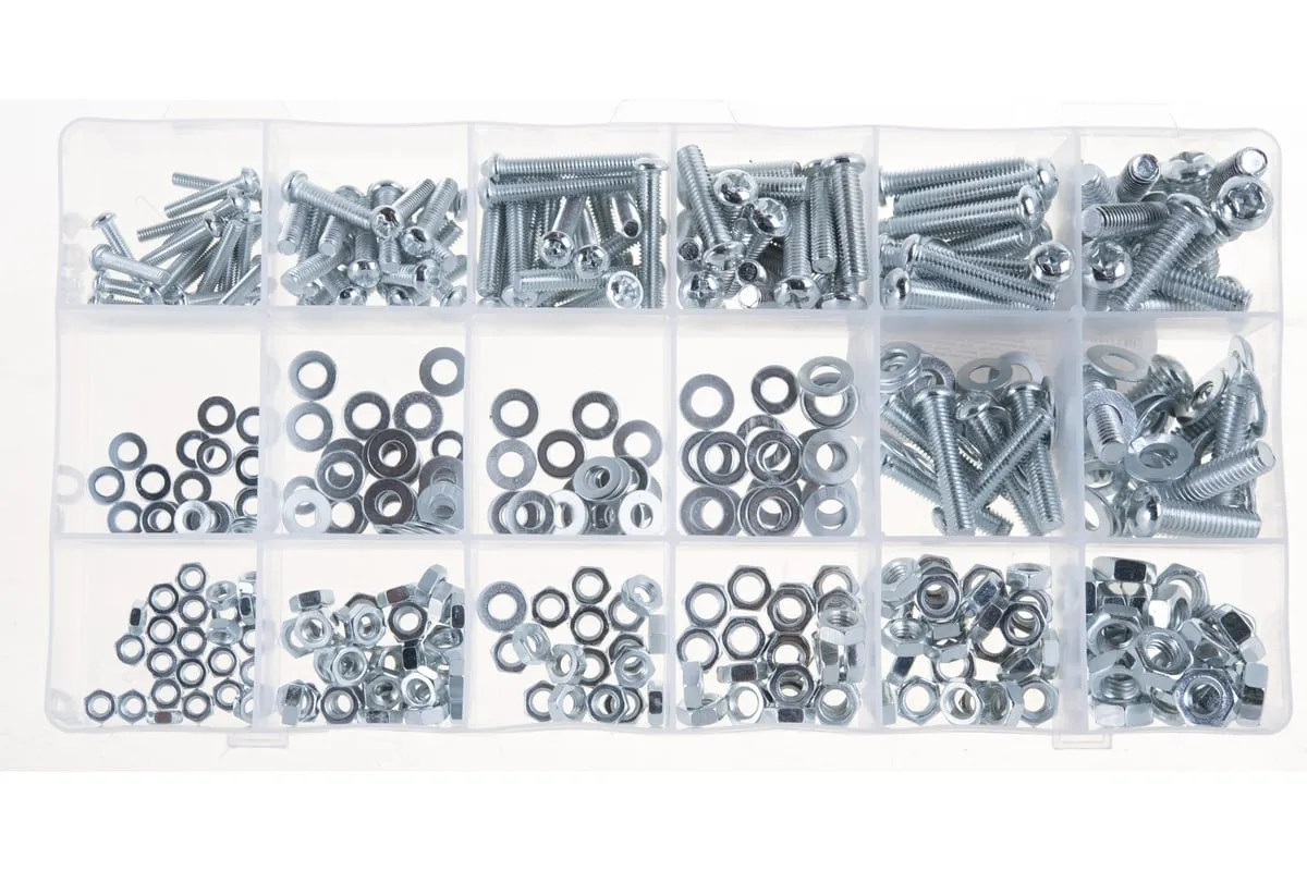 Набор винтов, гаек, шайб СИБРТЕХ 420 предметов 47617 подойдет для использования в быту. В комплект входят самые популярные размеры гаек, винтов и шайб, которые образуют между собой соединение для монтажа конструкций. Все предметы выполнены из стали. Комплект поставляется в удобном кейсе с отсеками.