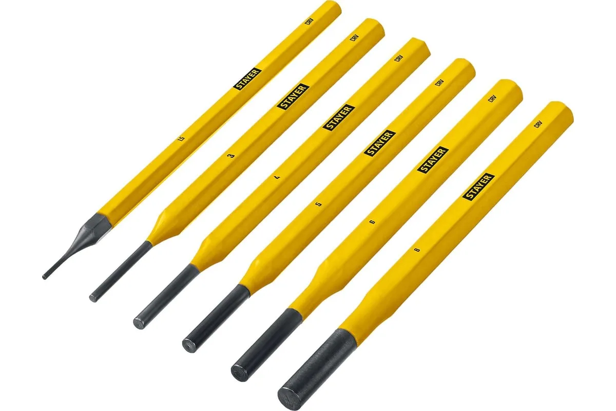Набор выколоток применяется для выколачивания крепежных элементов из различных деталей. Изготовлены из хромованадиевой стали.