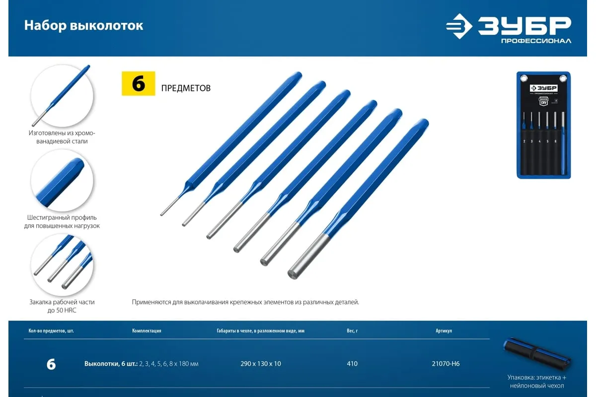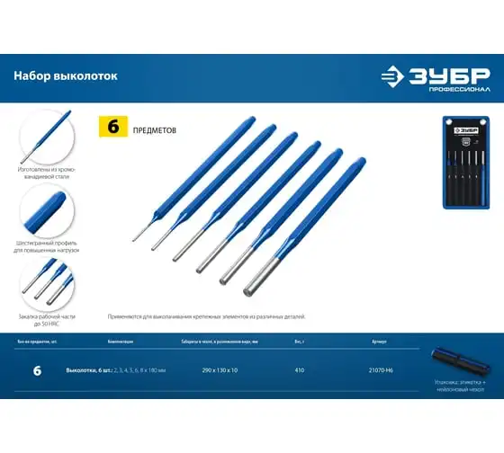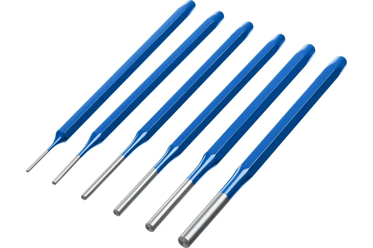 Набор высококачественных выколоток применяется для выколачивания крепежных элементов из различных деталей. Инструменты выполнены из качественных материалов, благодаря чему отличаются надежностью и долговечностью.