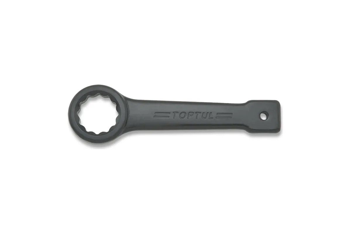 Ключ ударно-силовой накидной упорный фосфатирован марганцем и имеет высокую стойкость к коррозии. Ключ имеет специальное место для удара кувалдой или молотком и применяется для откручивания неподдающихся (прикипевших или ржавых) гаек или болтов. Рекомендуется для профессионального использования