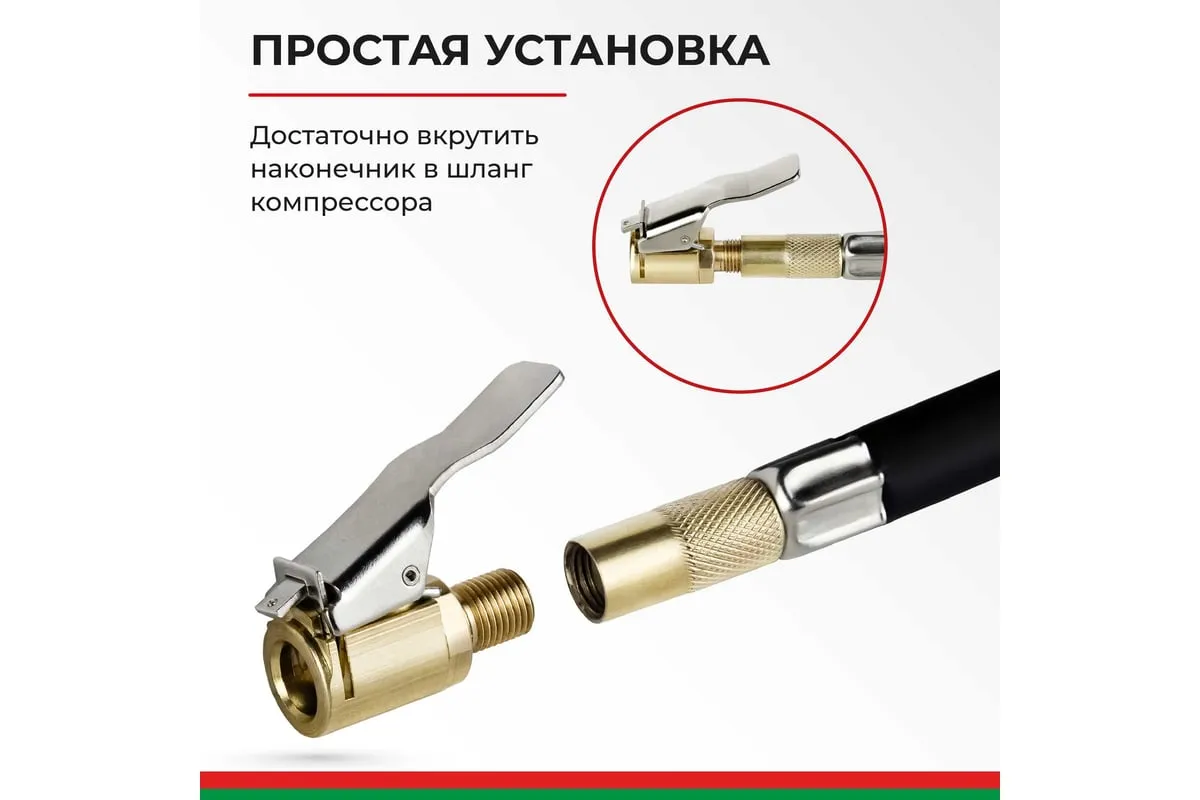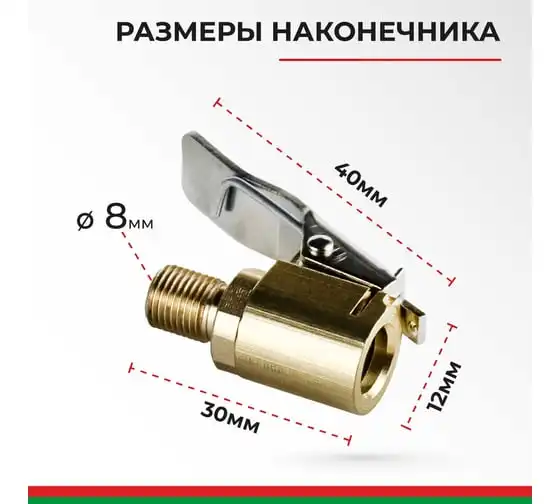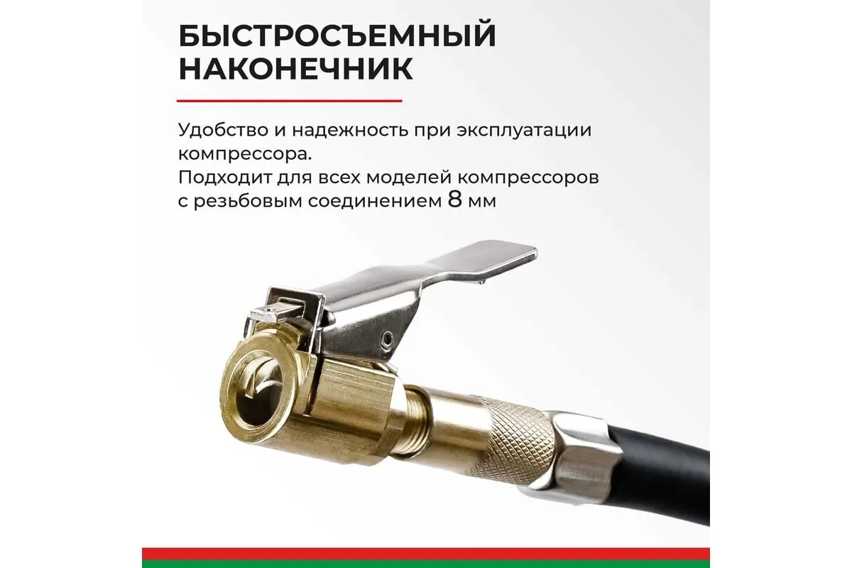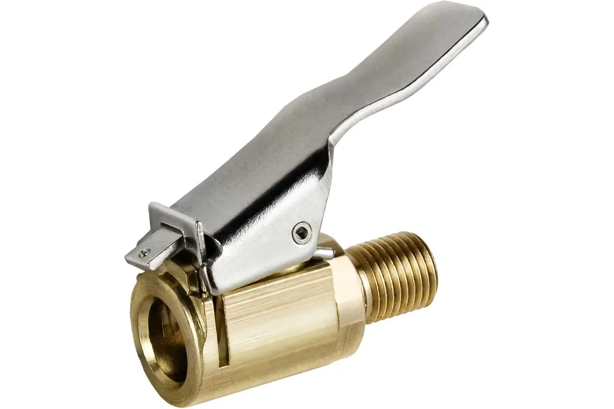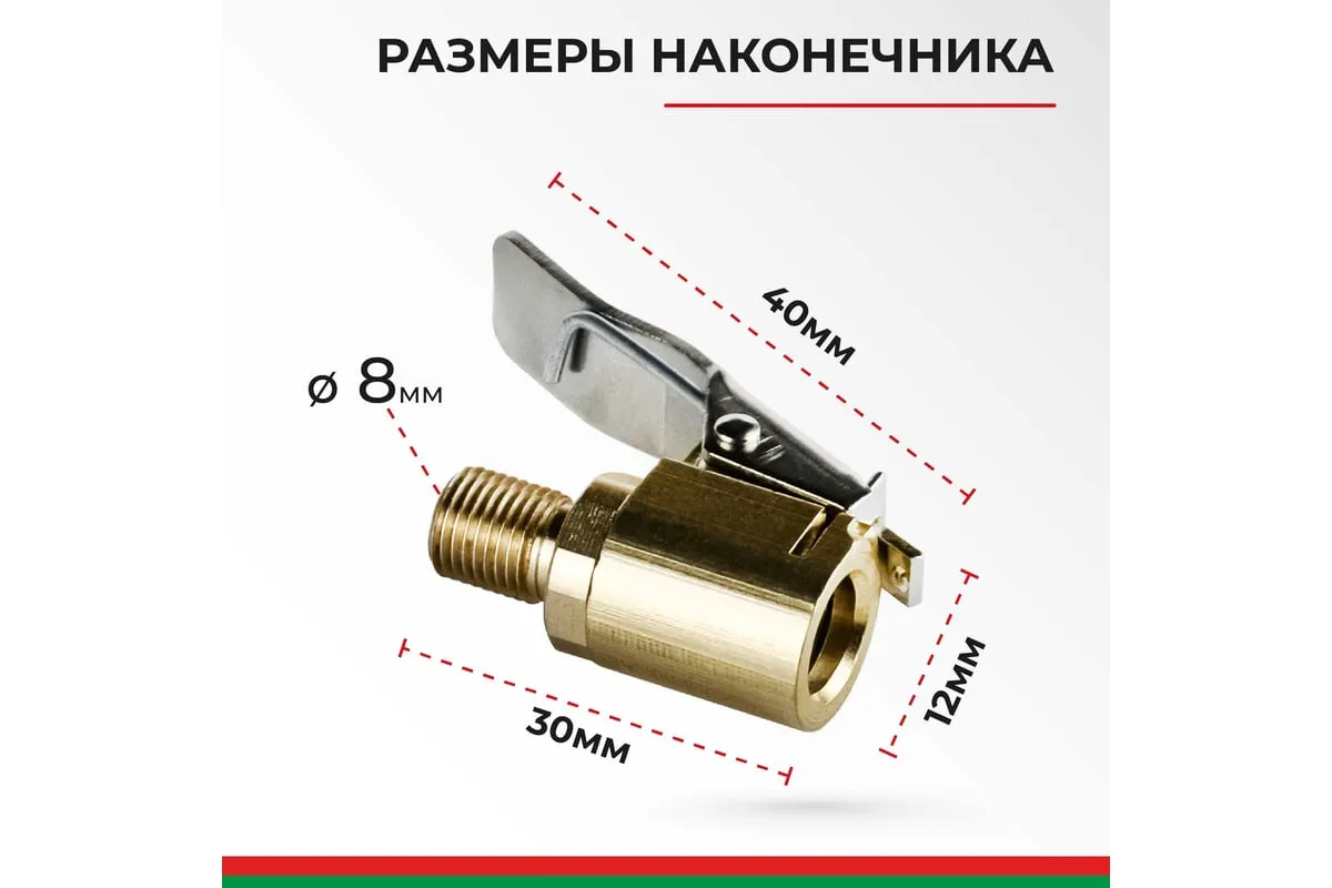 Быстросъемный наконечник насоса для накачки шин БелАК изготовлен из высококачественного сплава латуни. Наконечник может быть использован с любым типом шланга компрессора с резьбой на 8мм.