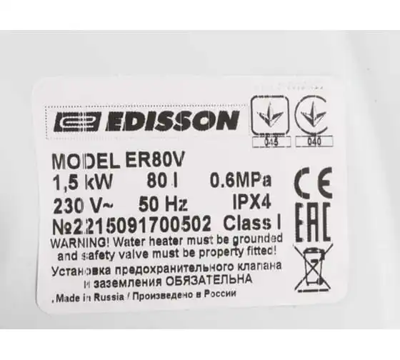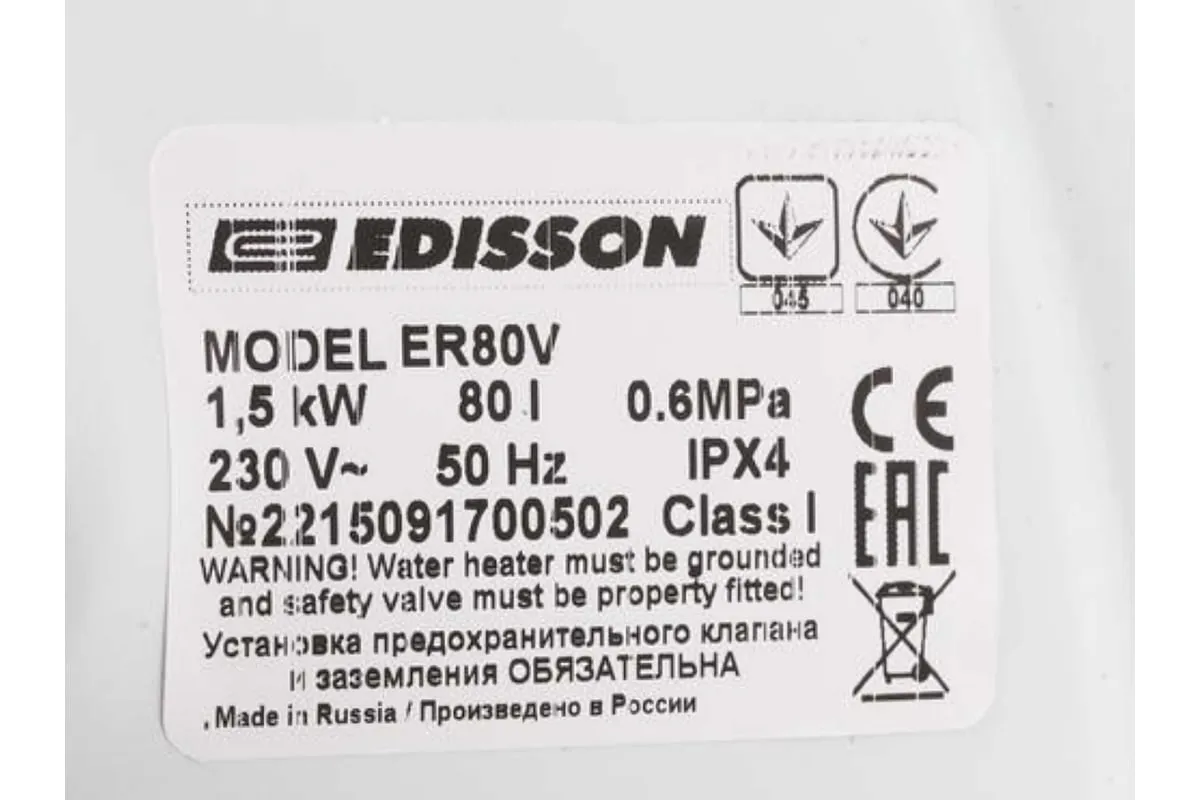 Накопительный электрический водонагреватель EDISSON ER 80 V SpT066446 объемом 80 литров, способен обеспечить горячей водой объекты бытового предназначения.