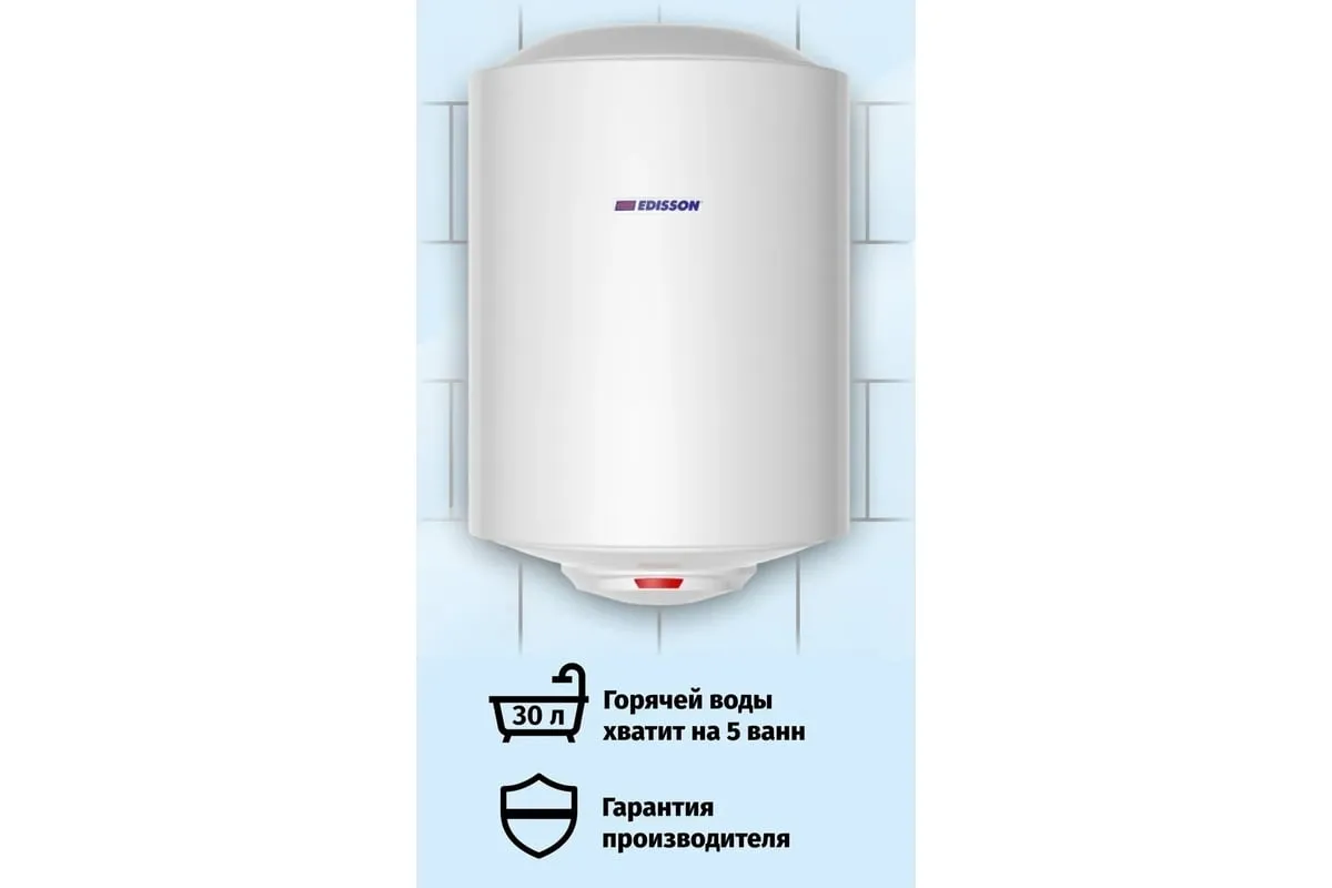 Накопительный электрический водонагреватель EDISSON ES 30 V ЭдЭ001796 объемом 30 литров, способен обеспечить горячей водой объекты бытового предназначения.