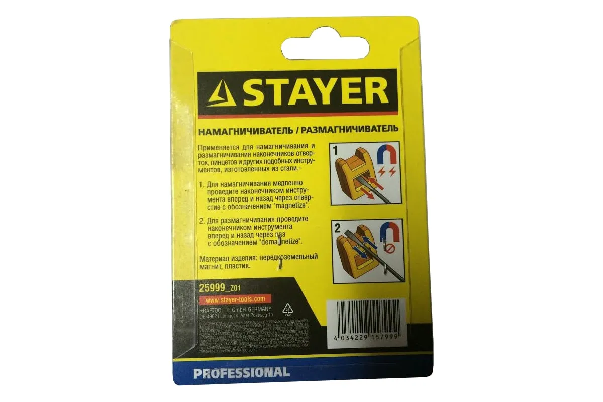 Намагничиватель-размагничиватель Stayer PROFI 25999_z01 отличается исключительной простотой применения. Это небольшое приспособление способно в считанные секунды запустить процесс, в ходе которого различные стальные изделия: отвертки, пинцеты, и другие подобные инструменты, - становятся либо намагничены, либо размагничены. Обладает небольшими размерами и малым весом, что удобно при хранении и транспортировке. Габариты намагничивателя составляют 3.5х2.5х1.5 см.